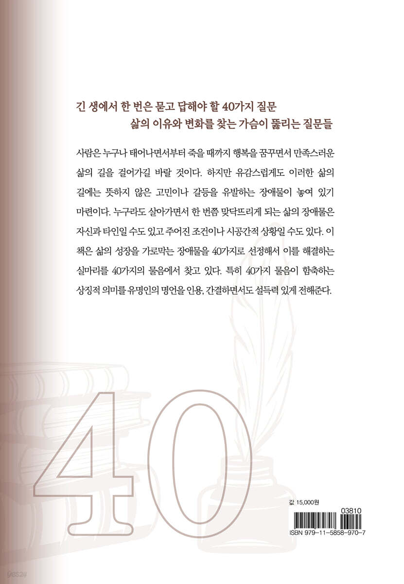 여러 나라 언어로 번역되어 세계인에게 경건한 지혜와 삶의 동기를 일깨워주는 작가 John Mason의 신작이다. 누구나 한 번쯤 겪을 수밖에 없는 삶의 문제를 40가지 질문을 통해 해답을 찾도록 하고 있다. 삶의 질문은 ‘40 Questions to Change Your Life’(당신의 인생을 바꾸는 40가지 질문)라는 원제처럼 살아가며 삶의 문제를 해결할 뿐만 아니라 인생의 변화를 이끌기도 한다. 나아가 삶의 길을 이끄는 이정표가 되기도 한다. 우리가 살아가며 끊임없이 스스로 묻고 답해야 하는 이유다. 40가지 질문은 살아가는 누구나 겪고 부닥치며 고민하는 보편적 삶의 문제에 관한 물음들이다. 보편적 문제인 만큼 질문을 던지면 그 해답이 쉬울 수 있지만, 그렇지 않으면 영영 지나칠 수밖에 없다. 40개의 각 질문에는 그에 대한 다양한 유명인들의 말과 사례들이 들어가 생각과 실제를 엿보며 쉽게 해결의 실마리를 찾을 수 있다. 인생의 큰 물음과 해답을 찾아가는 과정은 결국 삶의 바람직한 변화와 성장을 이끄는 인생 질문이 되고, 그만큼 삶은 의미와 재미가 깊어진다. 삶에 관한 끊임없는 물음과 내 인생을 바꾸는 40가지 질문 인생에서 만족감과 성취감이 높은 사람들 대부분은 자신의 삶에 관해 올바르고 적절한 물음을 제기함으로써 더 나은 결과를 얻고 있다. 이들의 예가 아니더라도 삶의 물음은 그 자체로 의미와 가치가 있다. 사고하는 인간으로서 스스로 하는 질문은 올바르게 살려는 탐색과 노력의 과정이기 때문이다. 지금 자기 삶에 어떠한 물음도 필요 없을 정도로 만족하지 않는다면 자신의 삶에 관한 끊임없는 질문을 던져야 한다. 질문 자체가 삶의 모든 문제를 해결해 주지는 않지만, 물음 자체는 삶을 한 걸음 더 나아가게 하는 힘이 있다. 당장 문제가 해결되지 않더라도 질문의 답을 찾아 계속 나아가다 보면, 어느 순간 삶을 더 만족스럽고 성공적으로 이끌 지혜를 만나게 될 것이다. 올바른 삶의 물음으로 중요한 해답과 영감을 얻길 작가는 삶의 중요한 해답은 삶에 관한 올바른 물음을 던지는 데서 출발한다고 믿는다. 누구나 찾는 삶의 해답이 이 책에 제시된 40가지 질문 안에 들어 있다고 확신한다. 그런 작가는 다음과 같이 밝힌다. “살아가면서 삶에 관한 고민이나 갈등을 겪을 때 이 책의 40가지 물음을 활용하길 바란다. 이러한 물음이 삶을 바람직한 성장의 길로 이끌 것이다. 인생 질문 40가지가 삶의 중요한 해답과 영감을 줄 것을 믿으며, 이를 통해 삶이 변화하는 가치 있는 일을 시작하길 바란다.” |