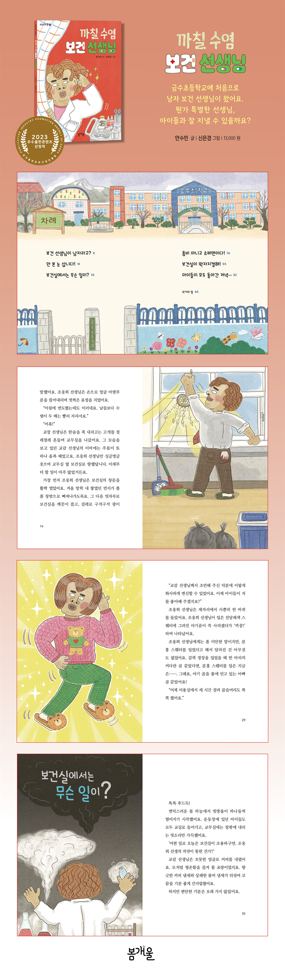 흔히 학교의 보건 선생님이라면 여자 선생님을 떠올리지요? 상냥한 웃음을 지으며 아픈 곳을 보살펴 주는 여자 선생님을 상상할 거예요. 하지만 이번 작품 『까칠 수염 보건 선생님』에 등장하는 ‘조웅희’ 보건 선생님은 남자예요. 게다가 다정한 외모와는 거리가 먼, 덩치가 크고 우락부락하고 곱슬머리로 곰을 닮은 모습이랍니다. 우리가 생각하는 평범한 보건 선생님이 아니다 보니, 금수초등학교의 교장 선생님과 교감 선생님은 걱정이 한가득이에요. 성별과 외모가 마음에 안 든다고 직설적으로 말하진 못하지만, 의심을 가득 담아 “남자 선생님인데, 잘할 수 있겠어요?” 하고 물을 정도였죠. 이에 대해 조웅희 보건 선생님은 너무나 천진하고 당당하게 대답합니다. “두 분도 남자 선생님인데 엄청 잘하고 계시잖아요.” 이 대답을 듣는 순간, 교장 선생님과 교감 선생님뿐 아니라 책을 보는 독자도 ‘앗!’ 하며 정신이 멍해집니다. 알지 못하는 사이에 우리 역시 남자 일, 여자 일을 구분하고 있었음을 깨닫기 때문이지요. 이런 직업은 여자에게 어울리고, 저런 직업은 남자에게 어울린다는 고정관념에 사로잡혀 바라보았던 겁니다. 이 작품은 조금은 낯선 조웅희 보건 선생님을 통해 직업에 대한 ‘성 고정관념’ 문제를 고민해 보게 합니다. 이야기 속에서 아이들은 까칠한 수염에 무섭게 생긴 보건 선생님 때문에 보건실 가기를 두려워합니다. 아파도 꾹 참으면서 말이에요. 크고 우락부락한 외모를 가진 사람은 왠지 무서울 것 같고, 불친절할 것 같고, 거칠 것 같다는 편견이 있어서일까요? 아이들은 보건 선생님을 겪어 보기도 전에 겉모습만으로 판단하고는 도망쳐 버립니다. 보건 선생님은 외모에 대한 ‘편견’의 벽을 깨기 위해 부단히 노력하는데요. 이야기는 보건 선생님의 눈물겨운 노력 끝에 아이들과 친해지는 과정을 그리고 있습니다. 겉으로 보이는 외모가 다는 아니잖아요. 외모 뒤에 숨겨진 보건 선생님의 따뜻한 마음을 아이들도 눈치채는 순간이 찾아온답니다. 위로받는 학교 생활 학교에서 아프거나 다치면 보건실을 찾아가지요? 이번 작품을 쓴 안수민 작가님은 학교가 안전하고 편안한 공간으로 여겨졌으면 하는 바람을 담아 ‘보건 선생님’ 이야기를 떠올렸다고 합니다. 작가님의 어머님이 학교 보건 선생님이었는데, 정작 아플 때는 다른 분에게 기대었다고 하네요. 저희 엄마는 보건 선생님이셨어요. 하지만 배가 아프면 항상 아빠를 찾았지요. 배 마사지를 해 주시는 아빠의 손길이 참 따뜻했거든요. 어쩌면 그때, 조웅희 보건 선생님 이야기가 찾아왔는지도 모르겠습니다. _작가 소개글 중에서 그래서일까요? 이 작품에서 조웅희 보건 선생님이 아프고 다친 아이들을 돌보는 방법이 색다릅니다. 배가 아픈 아이에게 약 대신 곰돌이 핫팩을 건네고, 상처를 소독할 때는 따끔따끔하지 않게 특별한 방법을 고안하는데요. 아픈 데를 고쳐 주고 치료해 줄 뿐 아니라 아이들의 눈높이에서 마음까지 보살피며 쓰다듬어 주는 정성이 느껴집니다. 그러다 보니 치료가 끝난 아이들은 보건 선생님의 매력에 흠뻑 빠져서 마음을 열고 웃음 짓는답니다. 덕분에 보건실은 웃음소리로 가득 차고요. 어쩌면 까칠 수염 보건 선생님의 보건실은 우리가 바라는 학교의 축소판이 아닐까요? 고정관념이나 편견이 사라진 곳, 누구에게나 안전한 곳, 아픈 곳을 치유받고 쉴 수 있는 곳, 마음껏 활짝 웃을 수 있는 곳, 이런 바람이 담긴 학교를 꿈꾸며 오늘도 조웅희 보건 선생님은 아픈 아이들을 향해 슈퍼맨처럼 달려갑니다. 보건 선생님 시리즈 중 첫 이야기 보건 선생님은 다친 고양이를 치료해 준 일로 아이들에게 인기를 얻는데요, 고양이를 치료해 주는 과정이 너무나 능숙합니다. 마치 사람을 대하는 것보다 더 자연스러울 정도지요. 맞아요! 조웅희 보건 선생님은 아무도 가지지 않은 특별한 능력이 있어요. 그 능력 덕분에 앞으로 고양이들과 더 많은 이야기가 펼쳐지리라 예상됩니다. 이 작품은 유쾌하고 발랄한 웃음이 담긴 보건 선생님 시리즈의 첫 이야기로, ‘2023 우수출판콘텐츠 선정작’입니다. 주인공인 보건 선생님은 생김새부터 독특해서 눈길을 끌고 웃음을 자아냅니다. 그러다 아이들에게 잘 보이기 위해 곰 같은 갈색 양복을 벗어 던지고 곰돌이 분홍 스웨터로 갈아입은 뒤에 곱슬머리를 직모로 쫙쫙 펴고 나타난 모습에선 깜짝 놀라며 깔깔 웃음이 터지지요. 보건 선생님 딴에는 엄청 신경 써서 꾸몄지만, 보는 이에게 그다지 나아 보이지 않는 아이러니한 상황. 그러나 그 노력이 가상해 마냥 비웃을 수도 없습니다. 조금 부족하지만 노력하는 보건 선생님의 진심에 감동을 느끼면서 응원하게 되거든요. 외모도 별나지만 조웅희 보건 선생님은 왠지 특별한 능력을 가진 것 같습니다. 고양이와 소통하는 모습도 그렇고, 아무도 모르게 보건실 구석에서 다양한 빨간색 물약을 만드는 모습은 마치 마법사 같은 신비로움을 풍깁니다. 이런 엉뚱하고 기발한 조웅희 보건 선생님의 모습이 신은경 작가님의 그림으로 생생하게 되살아났습니다. 짙은 눈썹과 부리부리한 눈, 개성 만점 외모의 보건 선
