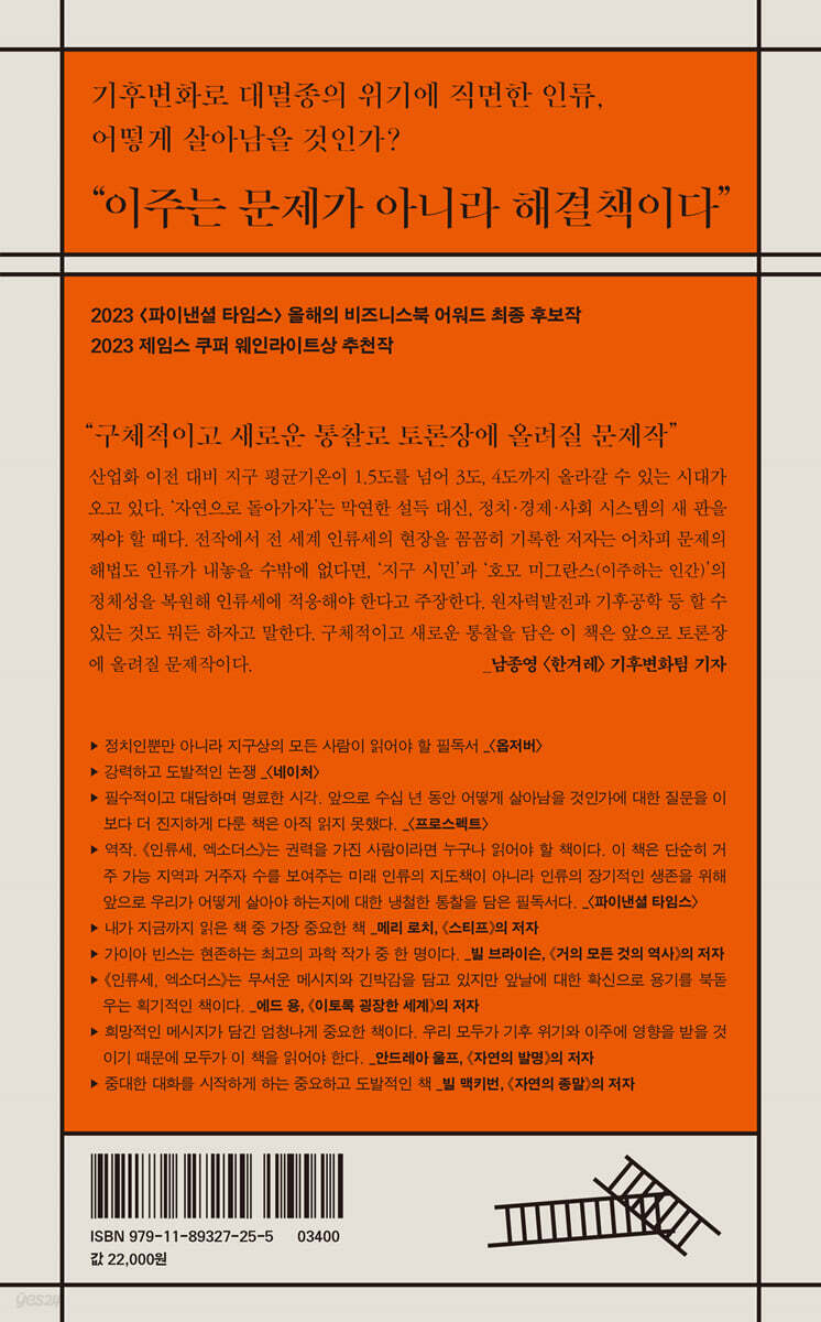 이주는 이미 시작되었다. 벌써 라틴아메리카, 아프리카, 아시아에서 가뭄으로 농사를 비롯한 생계가 불가능해진 지역을 탈출하는 사람들의 행렬이 이어지고 있다. 이미 진행 중이던 대도시로의 대규모 이주에 기후로 인한 이주가 더해지고 있다. 지난 10년 동안 이민자 수는 전 세계적으로 두 배나 늘었다. 지구가 더워짐에 따라 급증하는 난민을 어떻게 처리할 것인가가 점점 더 시급한 문제로 떠오를 것이다. 우리가 종 수준의 위기에 직면해 있다는 데는 의문의 여지가 없다. 하지만 우리는 헤쳐나갈 수 있다. 우리는 살아남을 수 있다. 하지만 그러기 위해서는 인류가 한 번도 해보지 않은 종류의 계획적이고 의도적인 이주가 필요하다.