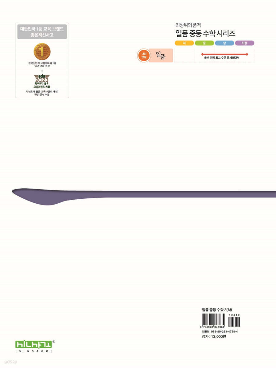 전국 중학교 중간 · 기말고사 문제를 철저히 분석하여 이를 바탕으로 중단원별로 출제 빈도가 높은 핵심 개념을 깔끔하게 정리하고, 시험에 자주 출제되는 유형을 뽑아 기본 학습에 충실할 수 있도록 구성하였습니다. 또 교과서 핵심 개념과 연계되는 심화 개념 또는 상위 개념 설명과 함께 관련 문제를 구성하여 변별력을 요구하는 문제를 보다 쉽게 해결할 수 있도록 하였습니다. 2. 내신 만점 달성을 위한 입체적인 문제 구성 내신 만점의 목표 달성을 위해 적중도 높은 시험 예상 문제를 엄선하여 중상위 수준의 "만점 도전을 위한 고난도 문제"와 내신 만점의 실력을 굳히기 위한 최상위 수준의 "최상위로 가는 최고 수준 문제"를 중단원별로 구성하였습니다. 그리고 중간 · 기말고사 대비를 대비하여 실력을 점검할 수 있도록 대단원별로 "학교 시험 실전 TEST"를 구성하였습니다. 3. 창의적 사고력과 문제 해결력 향상을 위한 집중 학습 다양한 창의유형 문제를 집중적으로 학습함으로써 창의적 사고력을 기를 수 있도록 하였고, 문제 접근 방법과 체계적인 풀이를 제시하여 문제 해결력을 향상시킬 수 있도록 하였습니다. 최고 수준 수학 학습을 위한 천하일품 문제집 ‘일품 수학’ 까다로운 내신 문제를 완벽히 대비하는 내신 만점 대비서 ‘일품 수학’ 〈일품 수학〉은 중상위권 학생들에게 적합하도록 수준 높은 문제들로 구성하였습니다. 내신 출제 가능성이 높은 "개념&핵심 기출", "만점 도전을 위한 고난도 문제", "최상위로 가는 최고 수준 문제"와 중간, 기말고사의 실전 연습을 할 수 있는 "학교 시험 실전 TEST", 다양한 창의사고력 문제를 집중 학습할 수 있는 "교과서 속 창의유형"을 통해 내신 만점을 달성할 수 있습니다. 〈일품 수학〉은 수학에서 최고 실력을 꿈꾸는 학생이라면 꼭 봐야 하는 필수 교재입니다. |