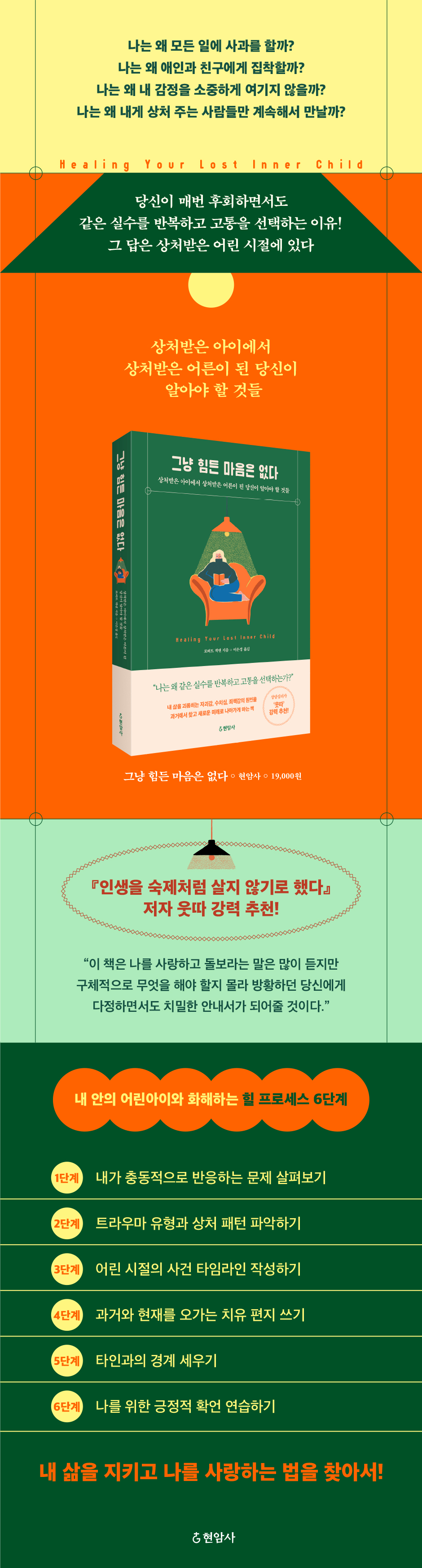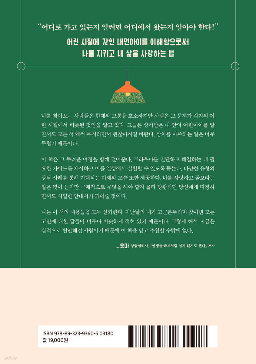 이 책은 그 두려운 여정을 함께 걸어준다. 트라우마를 진단하고 해결하는 데 필요한 가이드를 제시하고 이를 일상에서 실천할 수 있도록 돕는다. 다양한 유형의 상담 사례를 통해 기대되는 미래의 모습 또한 제공한다. 나를 사랑하고 돌보라는 말은 많이 듣지만 구체적으로 무엇을 해야 할지 몰라 방황하던 당신에게 다정하면서도 치밀한 안내서가 되어줄 것이다. 나는 이 책의 내용들을 모두 신뢰한다. 지난날의 내가 고군분투하며 찾아낸 모든 고민에 대한 답들이 너무나 비슷하게 적혀 있기 때문이다. 그렇게 해서 지금은 심적으로 편안해진 사람이기 때문에 이 책을 믿고 추천할 수밖에 없다. - 웃따 (상담심리사, 『인생을 숙제처럼 살지 않기로 했다』저자) |