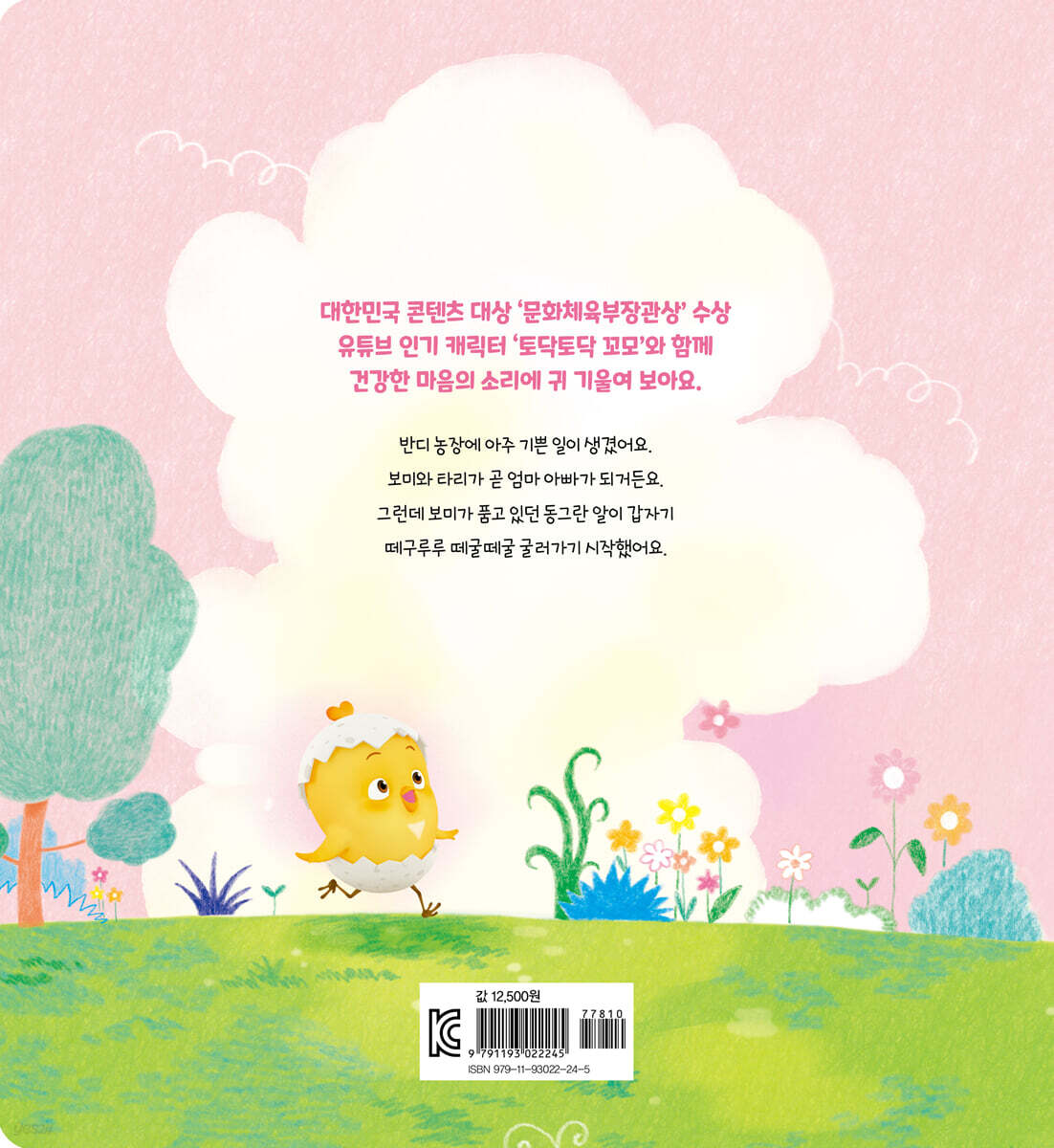 「토닥토닥 꼬모 마음 친구」 시리즈 「토닥토닥 꼬모 마음 친구」 시리즈(전 3권)는 서로를 토닥이며 응원하는 위로와 배려가 세상을 얼마나 아름답게 바꿀 수 있는지를 가르쳐 주는 ‘토닥토닥 꼬모’ 콘텐츠로 유아기 가정에서 꼭 이루어져야 하는 필수 감정 교육을 돕는 유아 교양 그림책 시리즈이다. 어린이집?유치원 기관 설문조사와 현직 어린이집 유치원 교사와의 면담을 통해 유아기 가정에서 가장 교육이 필요한 감정 세 가지(‘사랑’ ‘무서움’ ‘속상함’)를 뽑아 각각 ‘꼬모의 탄생’ ‘꼬모의 첫 심부름’ ‘엄마 보미의 생일’이라는 에피소드에 담아 전하고 있다. 아이와 함께 책을 읽는 분들을 위해 양육자 가이드도 더해 우리 아이의 첫 감정 교육에 도움이 되는 조언도 살펴볼 수 있다. 또한 책의 모서리에 찍히거나 종이에 베이지 않도록 모서리를 둥글게 제작하는 유아기 아이들을 위한 배려도 놓치지 않았다. |