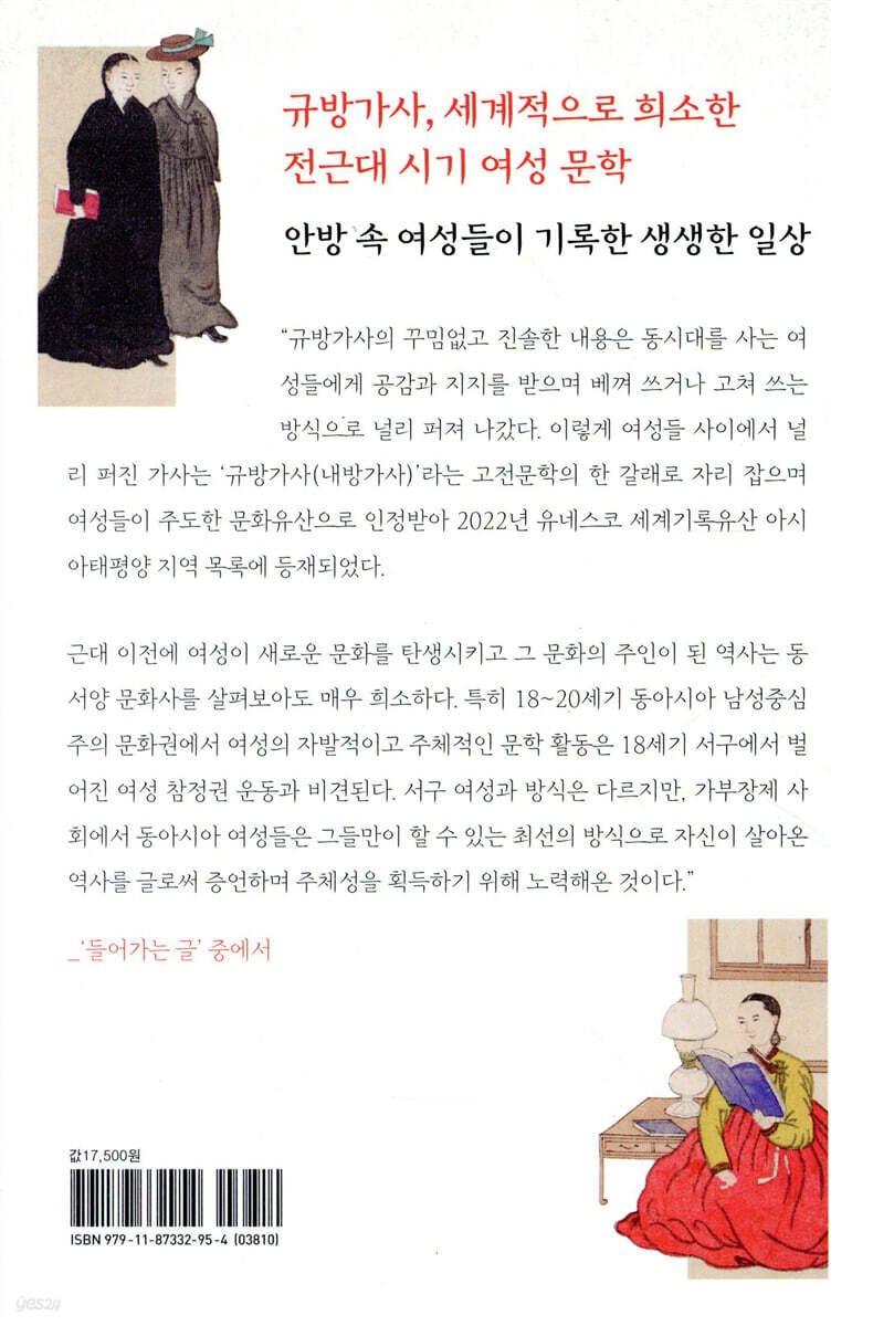 --- 「딸에게 주는 경계의 말」 중에서 시골 여자는 시부모를 모시며 인내하는 전통적인 여성상을 계승하면서도 남편에 대한 ‘여자’로서의 사랑을 갈구한다는 점에서 이전 여성과 다른 차이를 지닌다. 가족 제도 안에서 남편과 아내의 관계를 추구한다는 점에서 신여성과 별반 다르지 않은 주체성을 가진 존재로 변화하고 있다. 구여성은 신여성보다 전통에 더 익숙할 뿐 변화하는 세상에 발맞춰 자신이 처한 상황에서 이전과 다른 감각을 발산하고 있는 것이다. --- 「남편의 사랑을 갈구하는 여성 주체의 등장」 중에서 광복을 위해 싸우는 남편을 지지해 환갑을 앞두고 이역만리로 떠나기로 결심하기란 쉬운 일이 아니다. 그럼에도 김우락을 비롯해 권송대, 이호성이 망명을 결심한 것은 대의를 지지하고 광복을 염원하는 역사의식을 가진 여성들이었기 때문이다. 이들은 독립운동에 가담한 가족을 두었기에 식민지 조선의 상황과 만주로 가야만 하는 사명감을 자연스럽게 습득했을 것이다. 가족 공동체 속에서 운명을 함께해야 했던 여성들은 자연스럽게 독립운동가와 사상의 일체화를 이룬 것이다. --- 「독립을 위해 이주하는 여성들」 중에서 조상이 물려준 큰 집을 헌신짝처럼 버리고서 온 타향살이는 녹녹지 않다. 빈집이라고 일러주어 짐을 풀었으나 청인에게 쫓겨나는 신세가 된다. 다시 짐을 싸서 작은 초가로 향한다. 눈이 내려 길이 막혔지만 길에서 살 수 없으니 좀 큰 아이는 걸리고, 어린아이는 업었다 안았다가 한다. 눈바람을 맞으며 간신히 찾아간 집이었으나, 눈만 피할 수 있는 곳간 같은 곳이었다. 얼마나 집이 형편없었는지 김우락은 소굴이라 말하면서도 담담히 받아들이는 모습이다. --- 「만주로 가는 길, 고생길의 시작」 중에서 여성들이 자신의 역사를 기록할 때 역사는 온전히 그 시대를 기록할 수 있다. 여성들은 가사 작품을 창작하면서 독립에 대해 갈망했고, 독립운동의 주변인이 아닌 주체로 인식하며 시대에 필요한 여성상으로 탈바꿈해 나갔다. 여성들이 남긴 만주 망명 가사를 통해 지금 우리는 비통한 조국의 운명 앞에서 굴하지 않았던 강인한 여성 영웅으로 그들을 기억할 수 있게 되었다. --- 「독립에 대한 여성들의 열망」 중에서 여성 화자는 얼마나 긴장했는지 작아진 마음 때문에 시부모님이 높아만 보인다. 태산처럼 높아 보이는 시부모님 덕분에 온몸이 덜덜 떨릴 정도로 불안한 마음을 솔직하게 적었다. ‘친정을 생각하니 가고싶고 가고싶고 태어난 곳 가고싶고’라고 쓴 구절은 마치 어린아이의 울음소리처럼 느껴진다. --- 「시댁을 바라보는 여성들의 시선」 중에서 〈사모가〉는 올봄 친정에 가고 싶었지만, 계획대로 친정에 가지 못한 종손부를 위로하기 위해서 시집 아주머니가 창작한 작품이다. 시집 아주머니가 조카며느리인 종손부를 대변할 수 있었던 것은 그녀도 종손부와 별반 다르지 않은 삶을 살았기 때문이다. 여자라는 이유로 자기를 낳아주고 길러준 부모와 어린 시절 함께한 형제자매와 생이별한 채 낯선 시집으로 가야만 했고, 고향 땅에 두고 온 가족 생각에 밤낮으로 마음 아팠던 경험과 감정은 조선시대 여성이라면 누구에게나 공통된 경험과 감정이었다. 이러한 경험과 감정을 공유했기에 시집 아주머니는 조카며느리의 마음을 충분히 짐작하고 위로할 수 있었다. 이를 통해 우리는 규방가사가 여성 공동체의 산물이며 규방가사를 통해 여성이 여성을 이해하고 공감하며 위로했다는 사실을 알 수 있다. --- 「여성을 위로하는 여성들」 중에서 |
