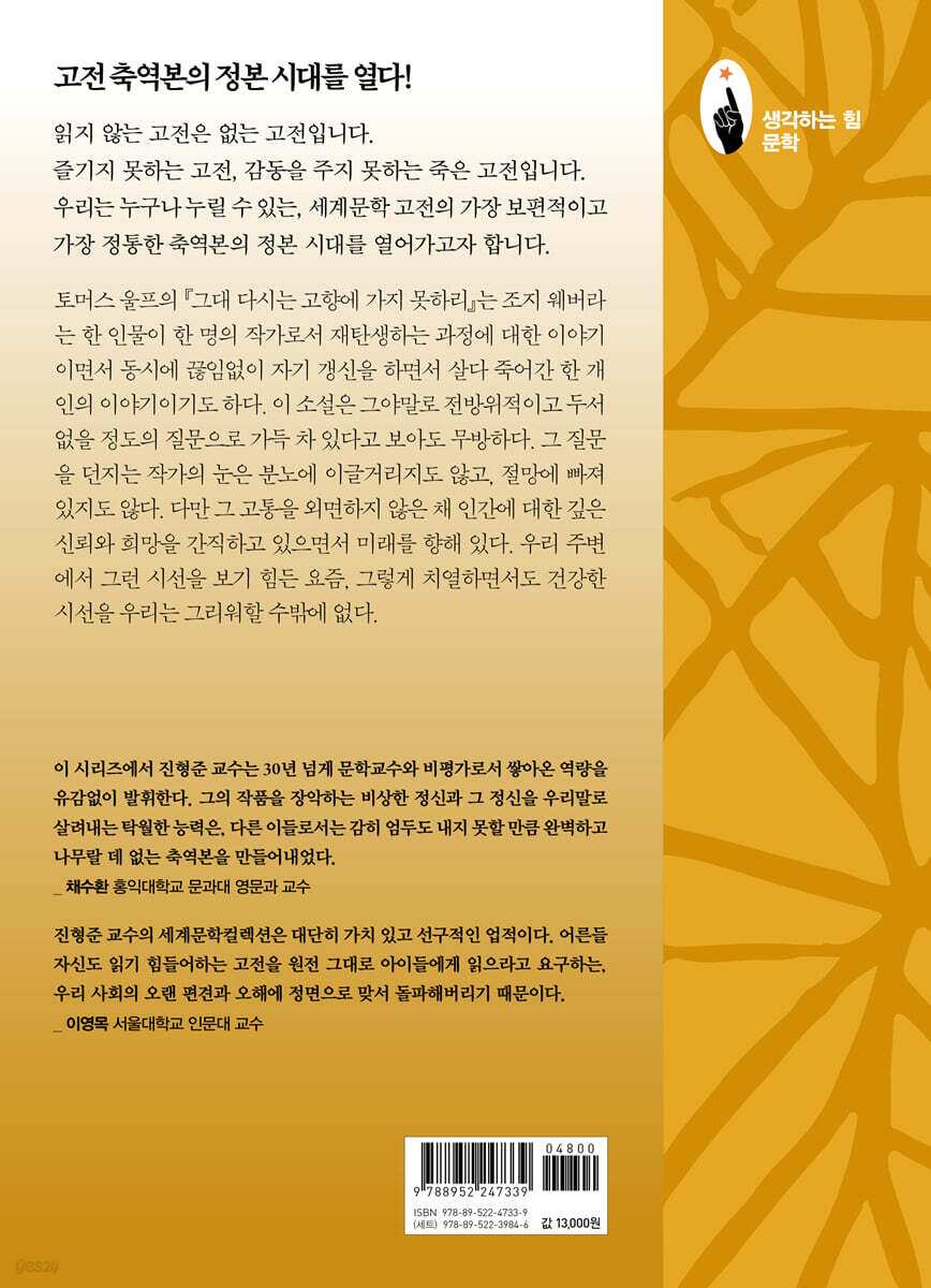 자기 부정과 성찰, 각성, 모색의 길을 걸어온 위대한 소설가의 이야기! ‘그대 다시는 고향에 가지 못하리’ 시간과 기억이라는 탈출구로 돌아갈 수 없다. 이 모든 의미를 그 문장은 담고 있었다. 토머스 울프의 작품들은 모두 그의 삶 그 자체를 소재로 삼은 것이다. 그가 남긴 4대 장편 소설이 모두 그러하다. 『천사여 고향을 보라』는 주인공, 즉 작가의 유년기를 그리고 있고 『세월과 강물』은 고향을 떠나 하버드 대학을 다니던 때부터 런던과 파리 여행 경험까지의 이야기를, 『거미줄과 바위』는 주인공이 작가로서 처음으로 성공을 거두던 때의 모습과 뉴욕 상류 사회에서 받아들여지던 때의 모습을 그리고 있다. 그리고 그의 마지막 장편인 『그대 다시는 고향에 가지 못하리』는 유럽 여행을 거쳐 뉴욕으로 돌아와 전업 작가로서 살아가게 된 주인공의 모습을 그리고 있다. 울프 사망 2년 후인 1940년에 출간된 『그대 다시는 고향에 가지 못하리』는 그의 작품의 완결편인 동시에 그의 삶의 완결편이라고 볼 수 있는 것이다. 게다가 그 작품은 ‘밤에 얼마 남지 않은 해(年)의 촛불을 태우면서 무언가 내게 말을 했습니다. 어디서 들려오는 소리인지 모르겠지만 어둠 속에서 그 무언가 말했습니다. 내가 죽을 것이라고……. 그 목소리는 이렇게 말했습니다. “더 큰 앎을 위하여 네가 알고 있는 땅을 잃을 것. 더 큰 삶을 위하여 네가 누리고 있는 삶을 잃을 것. 더 큰 사랑을 위하여 네가 사랑하는 친구들을 떠날 것. 고향보다 더 정답고 지구보다 더 큰 땅을 발견할 것……”’이라는 대목으로 끝난다. 말하자면 마치 유언을 남기듯 쓴 작품인 것이다. 평생을 치열하게 보고 느끼고 쓰면서 깨달음과 탈바꿈의 삶을 살았던 작가는 죽음을 예감했을 뿐 아니라 그 죽음까지도 새로운 시작으로, 더 큰 삶으로의 탈바꿈으로 승화시킨 셈이다. 자기 부정과 성찰과 각성과 모색으로 이루어진 소설을 쓰는 것. 하지만 그 길은 쉽게 열리는 길이 아니다. 그 길은 쉽게 답이 주어지는 길이 아니라 모색 그 자체로 이루어진 길이다. 따라서 이 소설은 그야말로 전방위적이고 두서없을 정도의 질문으로 가득 차 있다고 봐도 무방하다. 마치 머릿속에 오만가지 상념과 고민으로 가득 찬 사람이 자신의 일기장에 그 모든 것을 털어놓은 것과도 같다. 작가가 된다는 것이 무엇인가? 예술가와 생활인이 공존할 수 있는가? 라는 근본적인 문제로부터 고향 마을에 일고 있는 맹목적 부동산 투기 열풍에 대한 깊은 탐색, 30년대 중반 미국의 기업과 상류사회에 대한 성찰, 진지함이라고는 사라진 채 가벼운 유행에 휩쓸린 사교계와 지성사회에 대한 비판, 모순된 사회 구조에 대한 성찰과 비판, 미국의 주식 대폭락이 오게 된 원인과 그 의미에 대한 성찰 등 그야말로 전방위적인 질문과 작가 나름의 대답과 성찰로 가득 차 있다. 우리는 그 내용을 여기서 일일이 살펴볼 필요도 없고 여유도 없다. 다만 그런 비판적 질문과 성찰이 비판 그 자체를 위한 것이 아니라 새로운 탄생, 탈바꿈을 위한 모색의 의미를 지닌다는 점만은 반드시 지적하고 싶다. 생각하는 힘: 진형준 교수의 세계문학컬렉션 시리즈 소개 〈생각하는 힘: 진형준 교수의 세계문학컬렉션〉은 문학평론가이자 불문학자로서 제2대 한국문학번역원 원장을 역임한 진형준 교수가 평생 축적해온 현장 경험과 후세대를 위한 애정을 쏟아부은 끝에 내놓는, 10년에 걸친 장기 프로젝트의 성과물이다. 『일리아스』와 『열국지』에서 『이방인』과 『페스트』까지, 고대부터 현대에 이르는 세계문학 고전을 총망라하며 수많은 세계고전 문학 중 100권을 엄선, 2023년 연말을 끝으로 모두 출간되었다. 〈생각하는 힘: 진형준 교수의 세계문학컬렉션〉은 진정한 독서의 길을 제시하려는 대단히 가치 있고 선구적인 작업이다. 우리 사회에는 ‘고전’을 읽어야 한다는, 그리고 반드시 ‘완역본’을 읽어야 한다는 주장이 팽배하다. 그러나 아이로니컬하게도 정작 그 작품들을 실제로 읽어본 사람은 거의 없다. 한마디로 ‘죽은’ 고전이다. 진형준 교수는 바로 그 ‘죽어 있는’ 세계문학 고전을 청소년의 눈높이, 마음 깊이에 꼭 맞춰서 누구나 읽기 좋은, 믿을 만한 ‘축역본(remaster edition)의 정본(正本)’으로 재탄생시켜냈다. ‘진형준 교수의 세계문학컬렉션’으로 만나는 새로운 세계문학 읽기의 세계 〈생각하는 힘: 진형준 교수의 세계문학컬렉션〉은 ‘축약본의 정본’을 지향한다. 이 목표에 걸맞은 알차고 풍성한 내용 및 구성은 책 읽는 즐거움, 앎의 기쁨을 배가해주고, 사고력과 창의성과 상상력을 한껏 키워줄 것이다. - 쉽고 재미나는 고전 작품 읽기 고전이 더 이상 어렵고 지루한 작품이 아니라 친구 같은 존재가 된다. 현 시대를 사는 사람들의 눈높이, 마음 깊이에 딱 맞춘 문장과 표현으로 재탄생한 작품들을 통해 즐거운 독서의 세계에 빠져들 수 있도록 친절히 안내한다. - 작가와 작품 세계를 한눈에 보여주는 도판과 설명 각 작품마다 시작 부분에 작가와 작품에 관한 다양한 시각 자료와 내용을 소개해놓았다. 저자는 어떤 사람인지, 왜 이 작품을 썼는지, 그리고 이 작품은