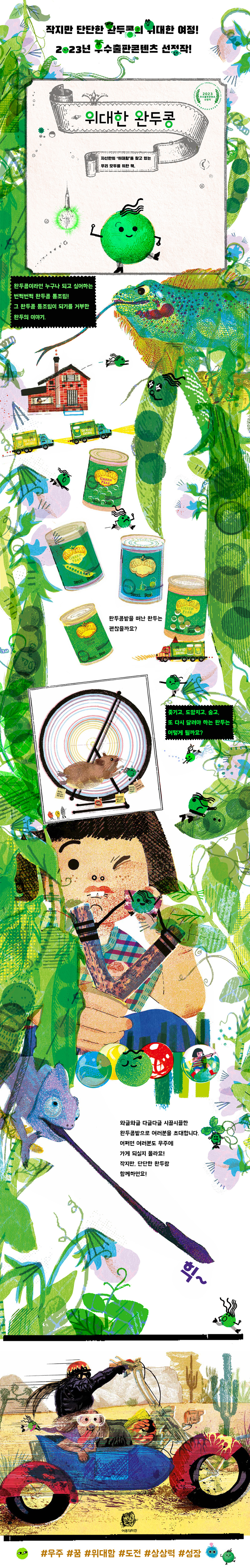 그 중 한 완두는 밤하늘의 달과 별을 바라보는게 그저 좋았습니다. 그러던 어느날, 운명처럼 농부의 집 창문 너머로 TV속 한 장면을 보게되고, 자신의 꿈을 깨닫게 됩니다. ‘우주비행사가 된다. 우주로 간다! 그리고 최초의 우주 완두콩이 된다!’ 모두가 이해 못하는 꿈이지만, 상관앖습니다. 완두는 확신이 있었습니다. 그렇다고 자신이 있었던건 아닙니다. 그래서 그 꿈을 실현 시키기 위해 치밀하게 준비하고 매일 매일을 성실하게 노력합니다. 그런 과정이 쌓이고 쌓이던 어느날 완두는 또 알게 됩니다 ‘아! 이제 준비가 됐구나!’ 그러고는, 홀연히 완두콩 밭을 떠납니다. 와우! 하지만, 인생이 그리 호락호락 하던가요. 완두콩 밭을 떠나자마자 완두는 완두콩밭에서는 경험할 수 없었던 혹독한 시련들을 마주하게 됩니다. 거칠고 마른 땅에 살고있는 도마뱀들과 카멜레온으로 부터 먹잇감이 되지 않기위해 달리고 또 달려야 했으며, 날카로운 부리와 발톱으로 도마뱀쯤은 단숨에 제압하는 까마귀의 밝은 눈을피해 바닥을 기어 다니고, 데구르 구르고 몸을 조심히 숨겨야 했습니다. 그렇게 무서움에 떨며 한참을 달아난 후에 안도의 숨을 쉴 겨를조차 없이 하늘에서 비가 떨어지기 시작합니다. 이 모든게 작은 완두 한알에게는 버겁기만 합니다. 포기해버리면, 그깟 꿈 외면해 버리면 그만일텐데 …… 하지만 완두는 끝까지 버텨내고 이겨냅니다. 하늘은 스스로 돕는 자를 돕는다. 라는 말이 있지요. 그래서 일까요? 완두에게도 우연한 도움의 손길이 찾아봅니다. 그리고 결국에는 하늘길이 열립니다. 정말이지 거짓말처럼 우주로 가게된 완두는 또 어떻게 될까요? 우주에서는 어떤 일이 완두를 기다리고 있을까요? 마지막으로 이 말은 꼭 하고 싶어요! 우주로 간 완두야, 너 참 위대하다! --- 본문 중에서 이 책의 작가 조수진은 그림책의 물성을 활용한 기발하고 다양한 방식의 책들을 발표해왔다. 『위대한 완두콩』 은 『우진이의 일기』 이후 작가가 오랜만에 선보이는 책의 물성이 아닌 이야기에만 오롯이 집중한 책이다 일상에서 늘 우주에 대한 동경과 애정을 이야기하는 작가는 조수진표 우주 3부작 그림책을 준비했다는데, 첫번째 책은 『2053년 이후, 그 행성 이야기 / 글로연 / 2023』 이고 이 책이 두번째이며, 세번째 책은 『100KM / 반달 / 2024 봄 출간예정』 이라고 한다. 확연히 다른 형식과 내용을 가진 이 3권의 책이 한 작가에게서 나오다니 그저 놀라울 따름이다. |