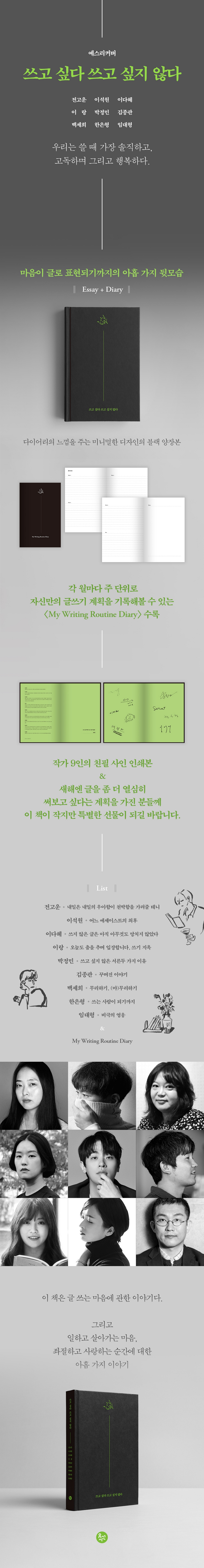 2. 이석원 · 어느 에세이스트의 최후 32 3. 이다혜 · 쓰지 않은 글은 아직 아무것도 망치지 않았다 58 4. 이랑 · 오늘도 춤을 추며 입장합니다, 쓰기 지옥 78 5. 박정민 · 쓰고 싶지 않은 서른두 가지 이유 102 6. 김종관 · 꾸며진 이야기 128 7. 백세희 · 무리하기, (마)무리하기 154 8, 한은형 · 쓰는 사람이 되기까지 178 9. 임대형 · 비극의 영웅 202 * My Writing Routine Diary 228 |