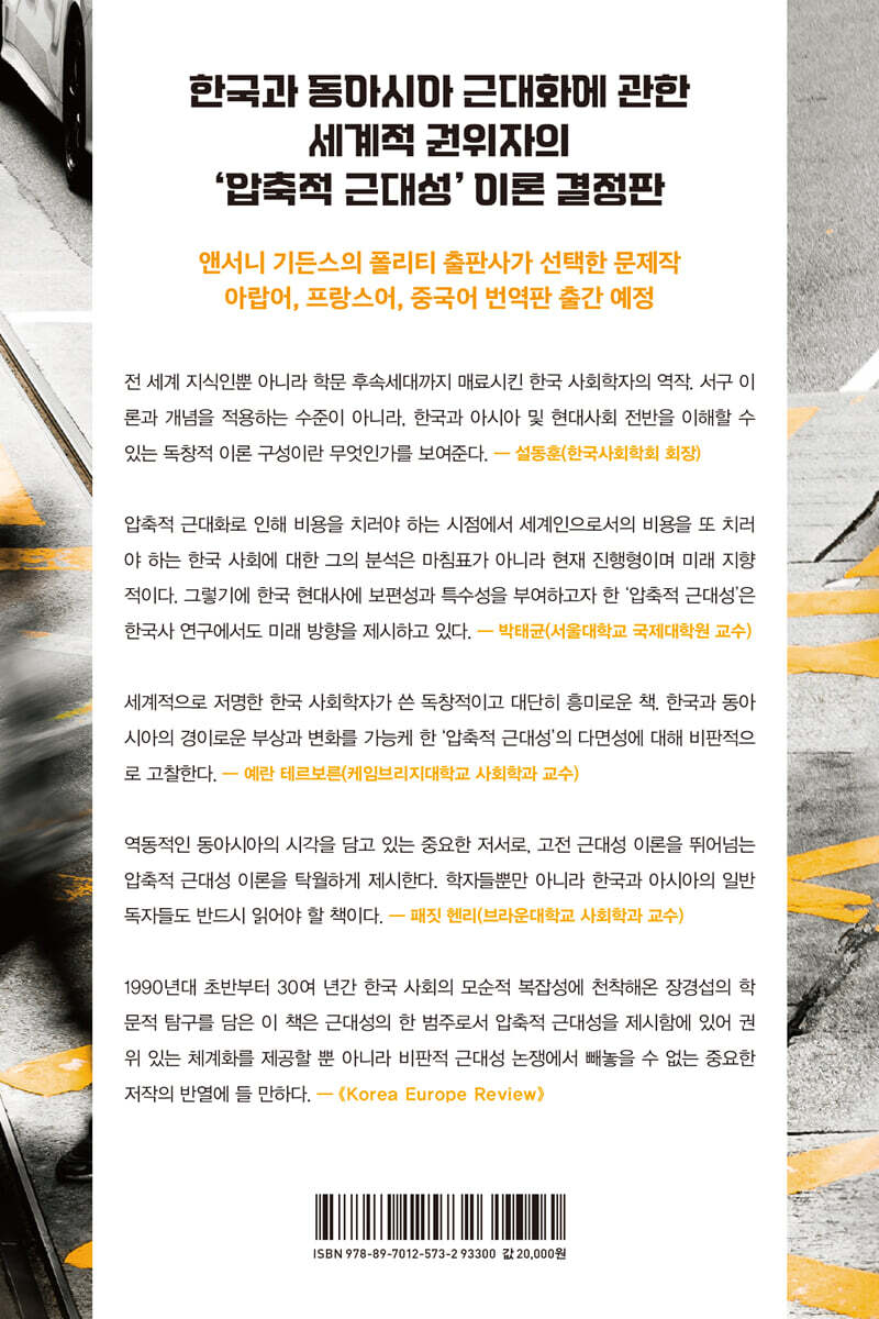 세계적으로 저명한 한국 사회학자가 쓴 독창적이고 대단히 흥미로운 책. 한국과 동아시아의 경이로운 부상과 변화를 가능케 한 ‘압축적 근대성’의 다면성에 대해 비판적으로 고찰한다. - 예란 테르보른 (케임브리지대학교 사회학과 교수)