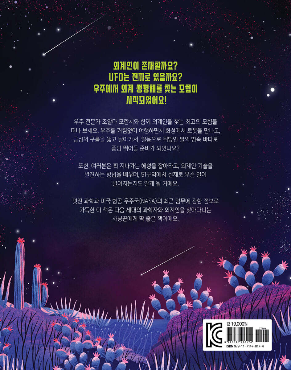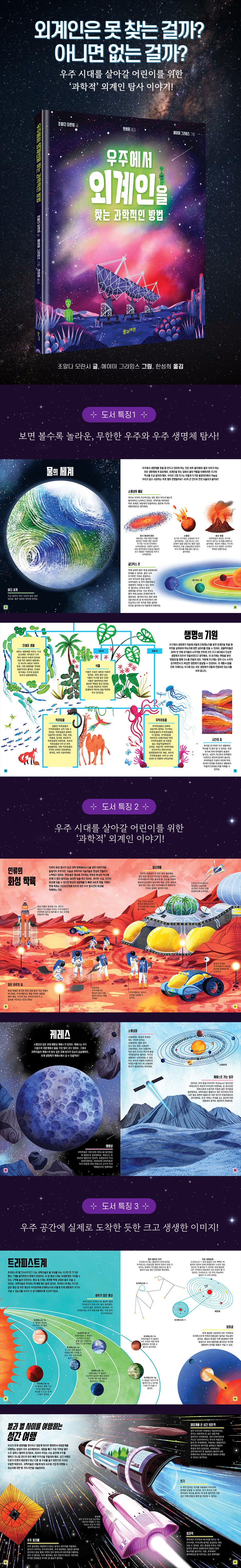 과학자들은 ‘빅뱅’이라는 거대한 폭발로 우주가 탄생했다고 생각해요. 우주에는 1000억 개가 넘는 은하가 있고, 은하마다 수백만 개의 별과 태양계가 있어요. 이 어마어마한 숫자의 별들은 지구처럼 자신을 공전하는 행성, 바로 외계 행성을 여러 개 거느리고 있죠. 이토록 많은 행성이 있기에 우주 어딘가엔 생명체가 존재하지 않을까요? 천문학과 우주 망원경의 빠른 발전으로 현재는 약 5000개가 넘는 외계 행성을 찾아냈고, 화성과 목성의 위성처럼 태양계 내에서 생명의 근원인 ‘물’의 존재가 잇따라 확인되었습니다. 외계 생명체를 발견하는 일은 어쩌면 곧 다가올 일이 아닐까요. 이 책은 외계인에 관한 호기심을 실마리로 생명의 기원을 밝히고, 행성들의 나이부터 구성 성분, 생김새, 위치 등을 살펴보며 그곳에서 생명체가 발생할 가능성을 하나하나 짚어 봅니다. 천문학과 생물학, 우주 생물학을 아우르며 무한한 우주를 아주 쉽고 재미있게, 과학적으로 정확하게 정리하지요. 책을 보며 어린이들은 보면 볼수록, 알면 알수록 흥미로움이 가득한 우주에 경탄하며 우주를 더욱 가까이 느끼고, 더 큰 눈으로 세상을 바라보게 될 겁니다. 우주 시대를 살아갈 어린이를 위한 ‘과학적’ 외계인 이야기! 태양계에서 가장 큰 행성인 목성. 3.5일마다 목성 주위를 돌고 있는 위성 ‘유로파’는 언뜻 긁힌 자국이 있는 얼음덩어리로 보이지만, 단단한 표면 아래 액체 상태의 바다가 숨겨져 있을지도 몰라요. 얼음 세계의 깊숙한 지하 바다, 그곳에 과연 생명체가 존재할 수 있을까요? 지금까지 수많은 과학자가 지구 너머의 생명체를 찾기 위해 심혈을 기울여 왔어요. 지구와 닮은 행성을 찾으려 노력하고, 행성에 우리를 대신할 로봇을 착륙시켰죠. 지구 생명체에 관한 정보를 담은 ‘아레시보 메시지’를 만들어 우주로 내보내고, 우주에서 오는 사소한 신호도 놓치지 않고요. 인류는 이제 지구 밖 어딘가에 있을 외계 생명체에 아주 조금씩 가까워지고 있습니다. 『우주에서 외계인을 찾는 과학적인 방법』은 왜 우주에 생명체가 존재할 가능성이 높은지, 어떻게 외계 생명체를 탐사하고 있는지, 그런 노력이 지구의 생명체를, 우리 행성의 미래를 이해하는 데 어떻게 도움이 되는지 재치 넘치는 스토리텔링으로 생생하게 과학적으로 증명해 나갑니다. 어린이들이 이 책을 통해 우주를 향한 무한한 상상력과 과학적 사고력을 키우며 지적 확장의 즐거움을 느끼길 바랍니다. 우주 공간에 실제로 도착한 듯한 크고 생생한 이미지! 표면 온도 섭씨 450도가 넘는 뜨거운 행성 금성, 영양분이 풍부한 푸른 물줄기와 열이 뿜어져 나오는 유로파의 열수 분출공, 질소 기체로 이뤄진 황금빛 대기의 타이탄, 꽁꽁 언 하얀 표면 때문에 햇빛의 약 90%를 반사해 태양계에서 가장 밝은 엔켈라두스……. 이 책은 이처럼 각양각색 변화무쌍한 우주의 모습을 실제로 눈앞에 펼쳐놓은 듯 실감 나는 이미지로 담아냈습니다. 개성 만점 태양계 행성들부터 행성의 위성들, 태양계 너머 외계 행성들까지. 크고 시원시원한 그림 덕분에 우주 공간을 직접 보듯이 생생하게 관찰할 수 있습니다. 특히 각각의 행성 정보가 일목요연하게 정리되어 있어 비교하며 기억하기 좋습니다. 전 세계 우주 개발의 역사와 그를 뒷받침하는 멋진 과학, 미국 항공 우주국(NASA)의 최근 임무에 관한 정보로 가득한 이 책은 다음 세대의 과학자와 우주 생명체가 궁금한 어린이에게 딱 좋은 책입니다. 넓디넓은 우주 곳곳을 여행하며 경이롭기 그지없는 우주의 세계에 흠뻑 빠져 보세요! |