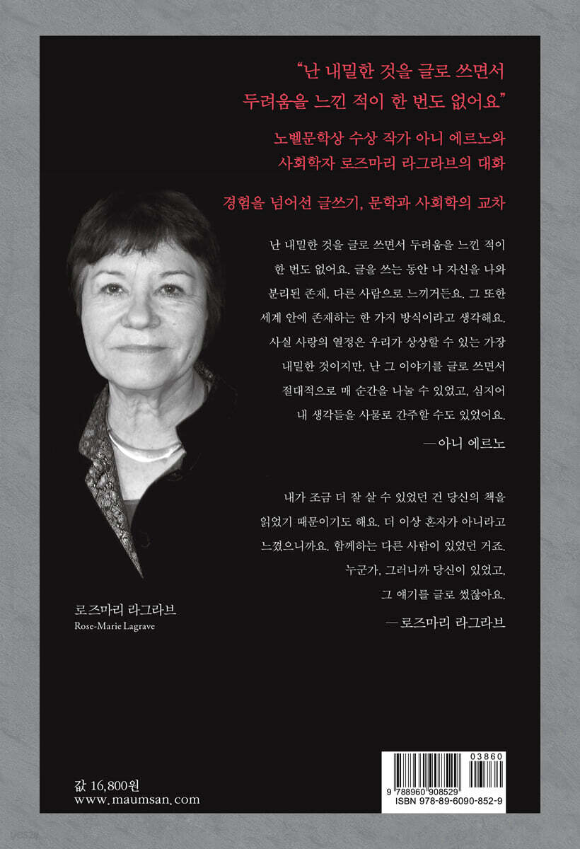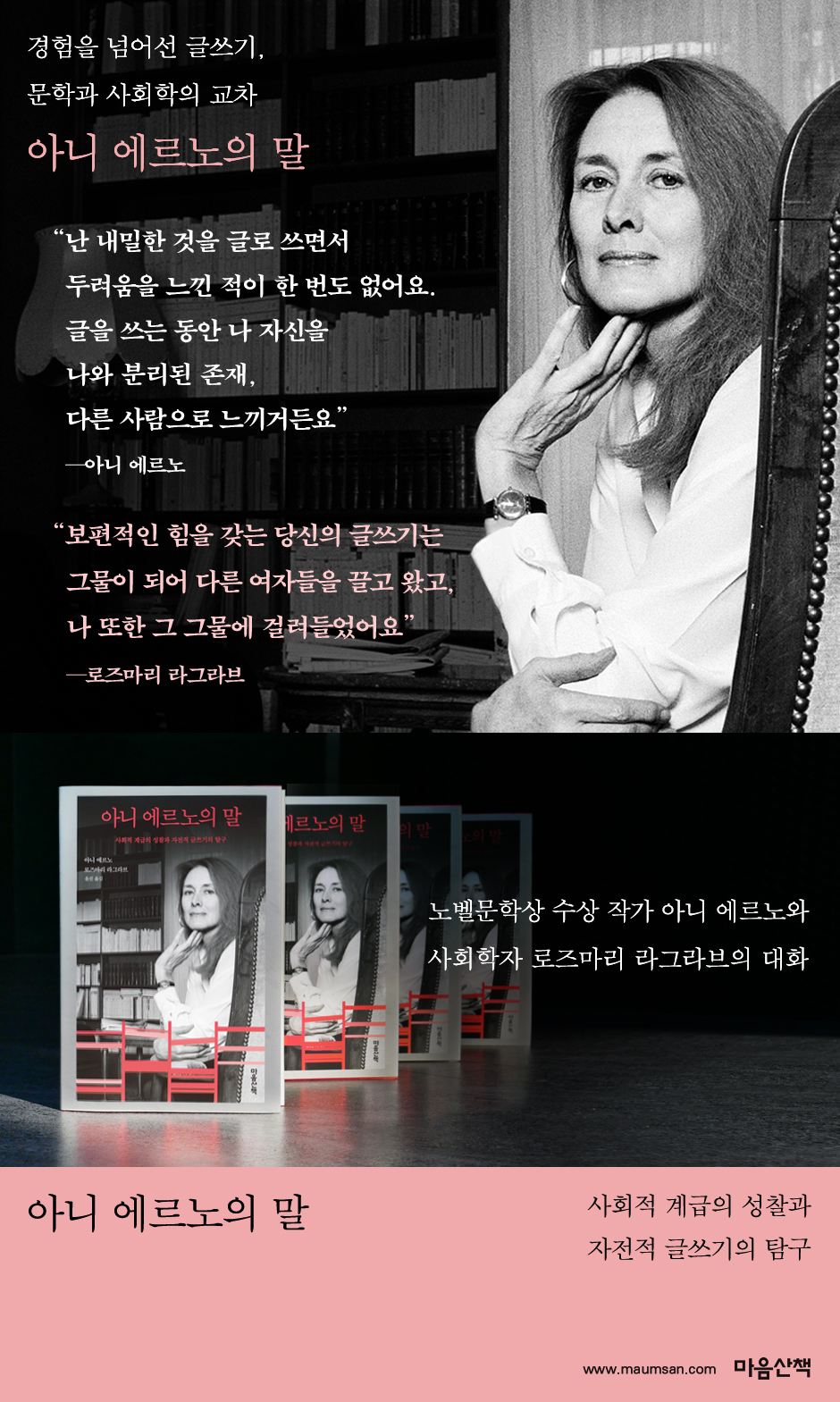 아니 에르노의 문학과 계급의식 ‘체험하지 않은 현실은 쓰지 않겠다’라고 이야기했던 작가 아니 에르노는, 사회와 역사, 개인의 관계를 파헤쳐 건조한 문체로 서술하는 특유의 글쓰기로 평단과 독자의 찬사와 논쟁을 동시에 불러일으키곤 했다. 『아니 에르노의 말』에서 에르노는 작품을 쓰던 당시의 경험과 시대적 배경을 함께 이야기하며, 사회 변화 속에서 자신의 작품이 어떤 위치에 놓였는가에 대해 흥미롭게 들려준다. 출간 당시 20만 부 넘게 팔리며 폭발적 반응과 논란을 일으켰던 『단순한 열정』(1991)과 달리, 『사건』(2000)은 2만 부에 불과했으며 반응 또한 대부분 무관심이었다. 그러나 20~30여 년이 지나 두 작품이 비슷한 시기에 영화화되었을 때, 『사건』을 각색한 영화 〈레벤느망〉은 임신중지를 둘러싸고 뜨거운 논란이 일었던 사회적 분위기를 타고 커다란 반향을 불러왔다. 여성이 처한 사회적 조건들에 대해 일찍이 예민한 시선을 지니고 있던 아니 에르노는, 스스로의 자각에 ‘독서’가 중요한 영향을 미쳤다고 이야기한다. 특히 시몬 드 보부아르의 『제2의 성』은 자신에게 충격을 안긴 첫 번째 책으로 꼽는다. 이밖에도 에르노와 라그라브는 버지니아 울프, 마르그리트 뒤라스, 도리스 레싱도 언급하며 남성 위주의 문학사에서 길을 찾을 수 있었다고 고백한다. 나를 키운 책들이라면 당연히 『제2의 성』부터 꼽아야 해요. 열여덟 살의 나에게 결정적인 발견이었죠. 그때까지 난 남자 여자의 관계에 대해, 여자들이 처한 조건에 대해 아무것도 모르던 상태였거든요. 남자들과 함께 있기가 왜 그렇게 불편한지 이해할 수 없었어요. 그런 나에게 『제2의 성』은 마치 환한 빛 같은 책이었죠. 좀 서정적인 표현일 수는 있지만, 정말로 루앙에서 이제르 대로를 걸어 내려갈 때 느낀 그 감정이 아직도 분명하게 기억나요. 보부아르의 가차 없는 증명이 나의 세계관을 찢어버린 거죠. 사회가 성차로 구분되어 있고 남자들이 특권을 누린다는 사실을 처음 깨달은 순간 얼마나 흥분되던지……. _본문에서 아니 에느로와 로즈마리 라그라브는 둘 다 프랑스 노르망디에서 태어났고 비슷한 나이인 데다, 서민에서 부르주아로 계급 이동을 경험한 ‘계급 탈주자’라는 공통점을 지니고 있다. 소상인의 딸이었던 에르노는 사립 가톨릭 학교를 다니며 부르주아 계급과 자신이 속한 서민 계급 사이에서 자주 ‘분열’을 느끼곤 했다. 피지배 계급 출신 여성이라는 자의식을 지닌 에르노에게 문학은 결코 정치와 떼어 생각할 수 없는 것이었고, 지배계급에 맞서는 무기이기도 했다. 이를 위해 아니 에르노는 엘리트의 언어가 아닌 출신 계급의 언어를 사용하여 이른바 ‘밋밋한 글쓰기’를 시도했는데, 이는 보수적인 문학의 관점에서는 일대 파격이었다. 그러나 기존 질서를 두려워하지 않는 아니 에르노는, 지배계급의 교묘한 차별을 폭로하고 진실을 드러내며 그만의 독보적인 문학 세계를 구축했다. 라그라브는 그런 에르노에게 “당신의 책들은 우리에게 든든한 고리이자 버팀목”이 되었다고 이야기한다. 아무리 그래도 난 오랫동안 배신의 느낌을 떨칠 수 없었죠. 그나마 지금은 조금 덜해졌어요. 왜 그럴까요? 글을 쓰기 때문이죠. 난 젊을 때부터 “나의 종족의 복수를 위해 글을 쓰겠다!”는 바람을 지녔고, 그래서 내가 쓰는 책들의 내용과 형식이 그 목적으로부터 멀어지지 않게끔 해야 했어요. 처음 만난 세계의 경험을 글쓰기가 최대한 직접적인 방식으로 전달해야 하는 거죠. 내 책들이 다른 사람들의 의식을 만나기도 하고, 묻혀 있거나 말할 수 없는 것들이 솟아오르게 만들기도 했을 거예요. 내가 정말로 배신을 했다면, 그런 식으로, 그러니까 글을 씀으로써 속죄하는 거라고 말할 수 있겠네요……. _본문에서 “난 노년이 향유의 시기가 되면 좋겠어요. 다시 말해서 끝내겠다고 선택할 수 있는 자유를 갖고 싶어요” 두 여성이 나누는 노년에 대한 생각 사회적 계급과 자전적 글쓰기, 여성으로서의 삶에 대해 치열하게 전개되던 아니 에르노와 로즈마리 라그라브의 대화는 마지막 부분에 이르러 ‘노년’이라는 주제를 다룬다. 어느덧 노년에 다다른 두 여성은 자율성이 약해지고 있는 몸의 변화를 깊이 인식하고 이에 대해 털어놓는다. 죽음을 금기시하거나 생물학적 관점으로만 바라보는 대신 사회학적인 시선으로 관찰하며 사유를 주고받는다. 자신의 노화 경험에서 출발한 이러한 사유는 “고통과 쇠락밖에 남지 않았을 때 그만 끝내겠다고 선택할 수 있는 자유”로 공통적으로 이어진다. 페미니스트로서 ‘자발적 임신 중단’의 권리를 외쳤던 그들이 ‘자발적 노화 중단’의 필요성에 대해서도 이야기하는 것이다. 지금 생각해보면, 내 삶에서 가장 강렬했던, 가장 충만감을 느꼈던 시기는 마흔다섯 살에서 예순 살 사이 같아요. 로즈마리, 난 당신과 달리 늙기를 준비할 수 있다고 생각하지 않아요. 은퇴를 준비하고 해오던 일을 일찍 중단할 수는 있지만, 10년 뒤, 20년 혹은 30년 뒤의 우리 몸과 마음을 미리 겪을 수는 없으니까요. 문제없이 살아갈 수 있으리라 예상한다 해도, 노년을 위해서