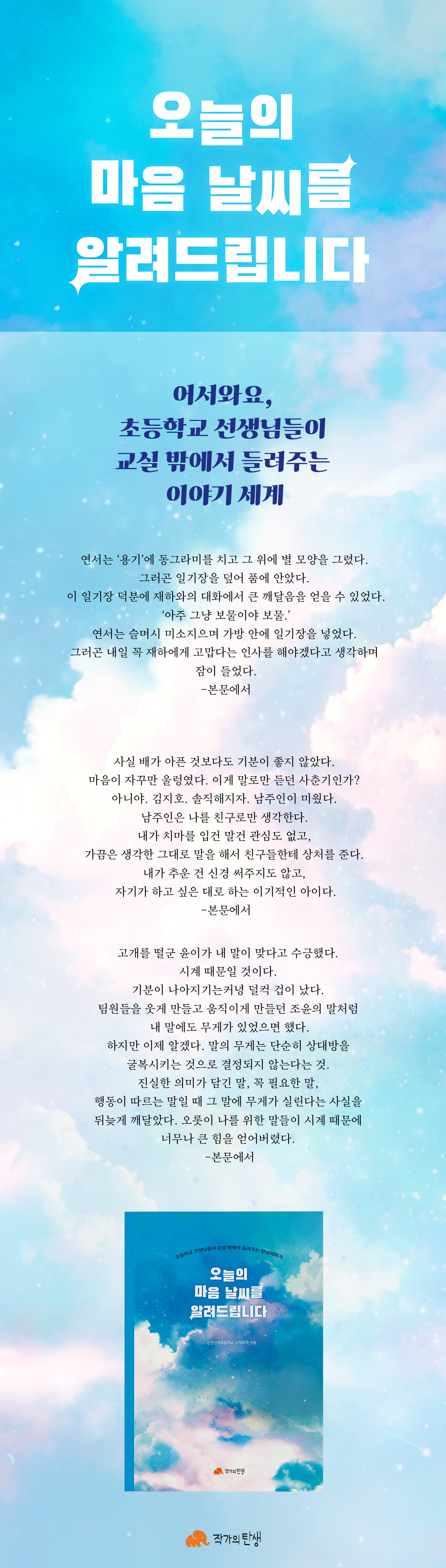 --- p.18 일주일 후 인천에서 조사를 마치고 인천 초능력 중학교로 입학했다. 첫날. 떨리는 마음으로 1학년 3반으로 들어 갔다. 자기소개를 하려는데 너무 떨려서 말이 나오지 않아 정적만이 흘렀다. 그 순간 두 친구가 동시에 나에게 인 사를 건넸다. --- p.36 사실 배가 아픈 것보다도 기분이 좋지 않았다. 마음이 자꾸만 울렁였다. 이게 말로만 듣던 사춘기인가? 아니야. 김지호. 솔직해지자. 남주인이 미웠다. 남주인은 나를 친구로만 생각한다. 내가 치마를 입건 말건 관심도 없고, 가끔은 생각한 그대로 말을 해서 친구들한테 상처를 준다. 내가 추운 건 신경 써주지도 않고, 자기가 하고 싶은 대로 하는 이기적인 아이다. --- p.70 아침부터 내리는 비가 은하의 마음 같았다. 먼저 온 울 이가 환하게 은하에게 손을 흔들었다. 은하는 웃을 수 없 었다. --- p.92 그렇게 아빠와 나는 고모네로 향했다. 가슴이 벅찼다. 고양이 캔디는 분명 마법 약이 틀림없었다. 뭔가 사이다같이 시원하면서 머리 가 맑아지더니 목구멍이 뻥 뚫리는 기분이었다. 내 마음을 표현할 수 있어 기뻤다. 그동안 영영 내 목소리를 들을 수 없을 것만 같아서 무서웠다. 고양이 캔디는 신기한 마법이었다. 나에게 꼭 필요한 약이었다. --- p.102 |