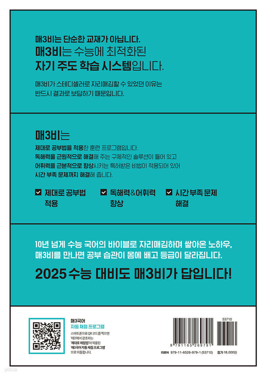 ★ 결과로 보답하는 “매3” ★ 수능 국어 필수템 * 제대로 공부법이 적용된 수능 국어 비문학 6주 완성 훈련 프로그램 * 독해력을 길러 주는 지문 분석 훈련법 적용 (지문 내용 문단별 요약으로 독해 훈련 강화) * 기출 문제 최적의 학습법과 복습 프로그램의 만남 * 가장 질문이 많았던 오답지에 대한 명쾌한 클리닉 해설 * 시간 부족 문제를 해결해 주는 시간 훈련·관리 프로그램 적용 * 접근 방법이 달라야 하는 문제 풀이법과 효과적인 공부법 제시 * ‘어휘 문제 3단계 풀이법’을 적용한 ‘복습을 위한 어휘 노트’ 제공 * 어휘력 향상을 위한 특허받은 국어 어휘 공부법 결합 (특허 번호: 제10-1652160호) * 다른 과목에도 적용되는 매3공부법을 부록으로 제공 2025 수능에서도 국어 영역 비문학은 지문 내용과 문제 유형, 난이도가 어떠해도 스스로 공부하는 것이 훨씬 효율적이고 또 필수적이다. 이 점을 감안하여 ‘스스로’, 그리고 ‘제대로’ 공부할 수 있게 구성한 〈매3비〉는 자습용이나 학원에서 과제로 활용하기에도 좋다. 특히 이번 2025 매3비부터는 별책 부록으로 ‘매3공부법’을 수록하여 수능 국어 공부 방법부터 제대로 진단하고 처방한다. 또 〈클리닉 해설〉에서는 독해력 강화를 돕는 ‘문단 요약’을 제공하는데, 이를 십분 활용하면 어렵게만 여겨지는 비문학 지문 이해력을 높이고 근본적으로 독해력을 강화시킬 수 있다. |