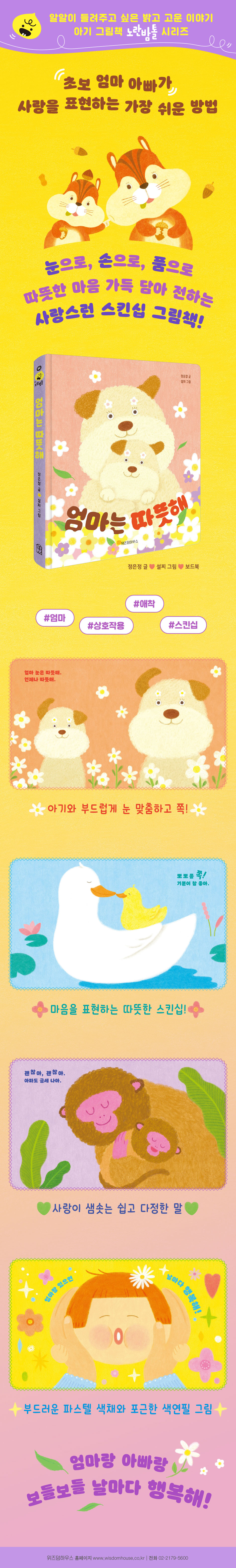 마주보는 눈, 맞닿은 볼, 꼭 잡은 손 내 아이에게 사랑을 표현하는 가장 쉬운 방법 『엄마는 따뜻해』는 첫 아이를 낳고 모든 것이 사랑으로 가득 찼던 시절 쓴 이야기입니다. 항상 내 아이한테는 따뜻하고 싶은 마음을 한가득 담아서요. 그 따뜻함으로 아이가 건강하고 행복해졌으면 더 바랄 게 없었습니다. 또 눈으로, 몸짓으로, 웃음으로, 표정으로 서로 이야기를 나누었던 더없이 값진 시간이었지요. 온몸으로 서로 교감을 했던 유일한 시간이기도 했습니다. 이 책을 통해 엄마와 아기가 즐겁고 행복하게 소통할 수 있었으면 좋겠습니다. - 정은정(글쓴이) “엄마 눈은 따뜻해.언제나 따뜻해.”“예쁘다, 예쁘다.보들보들 웃음이 나.”엄마는 언제나 따뜻한 눈으로 사랑해, 사랑해 아기에게 눈빛으로 속삭입니다. 엄마가 따뜻한 볼을 비비고 입을 맞추면 아기는 엄마의 사랑을 담뿍 느낄 수 있지요. 엄마는 언제나 따뜻한 손으로 아기를 토닥이고, 언제든 쉴 수 있는 넓은 등을 쉬이 내어 줍니다. 눈, 볼, 입, 손, 등 그리고 넉넉한 품까지 고르게 따뜻한 엄마의 온기에 기대어 아기는 씩씩하게 성장합니다. 엄마가 온몸으로 전하는 보드라운 사랑 덕분에 오늘도 평온하고 행복한 하루를 보내면서요. 보들보들 포근포근 엄마의 사랑을 전하는 스킨십 그림책 갓 태어난 아기는 적극적으로 촉각을 사용하며 발달합니다. 그래서 양육자의 부드러운 손길과 애정 어린 시선, 더없이 사랑한다는 표현 들은 애착 형성에도 큰 역할을 하지요. 양육자의 스킨십은 아기에게 사랑하는 사람이 바로 곁에 있다는 신호이기도 합니다. 아기는 가족의 품에서 눈을 맞추고 손을 맞잡고 볼을 비비며 온몸으로 전달되는 사랑과 체온에 안정감과 소속감을 느끼며 성장할 동력을 얻습니다. 이 책에 나오는 ‘사랑해’, ‘예쁘다’, ‘괜찮아’처럼 아기에게 짧고 정확한 언어로 사랑을 자주 표현하면서 부드럽게 몸으로 보듬어 주세요. 아직 말하지 못하는 아기도 양육자가 전하는 사랑의 말과 스킨십에 담긴 애정을 모두 느끼고 있답니다. 『엄마는 따뜻해』는 엄마 동물과 아기 동물의 눈, 볼, 입, 손, 등, 품으로 이어지는 부드러운 신체 접촉을 대상 독자 연령에 맞게 반복적인 구조로 나열해 어린 아기도 집중해서 책을 볼 수 있습니다. 눈을 편안하게 해 주는 부드러운 파스텔 색채와 포근한 색연필 그림은 엄마 품에서 함께 책 보는 시간을 더욱 다정한 기억으로 만들어 주지요. 아기의 애착 인형을 닮은 동물들이 차례로 등장해 보여 주는 다양한 몸짓은 아기의 호기심을 자극합니다. 0~3세 발달 과정에 꼭 맞춘 아기책으로, 아기와 함께 어느 장면을 펼쳐도 부담 없이 따라 할 수 있는 일상의 스킨십과 대화를 담았습니다. 알알이 들려 주고 싶은 밝고 고운 이야기 아기 그림책 〈노란밤톨〉 시리즈〈노란밤톨〉은 0~3세 아기들을 위한 첫 그림책 시리즈입니다. 책과의 첫 만남이 기쁨이 될 수 있도록 밝고 고운 이야기를 모아 건넵니다. 아이가 양육자와 책을 읽으며 다정하게 교감하고, 밝고 건강하게 성장할 수 있도록, 이 시기에 적합한 소재를 리듬감이 풍부한 글과 사랑스러운 그림에 담고자 합니다. 우리 아이들이 선한 길잡이가 되어 주는 책과 가까워지고, 책을 사랑하는 사람으로 살아갈 수 있도록 〈노란밤톨〉 그림책이 단단한 첫걸음이 되어 주기를 바랍니다.