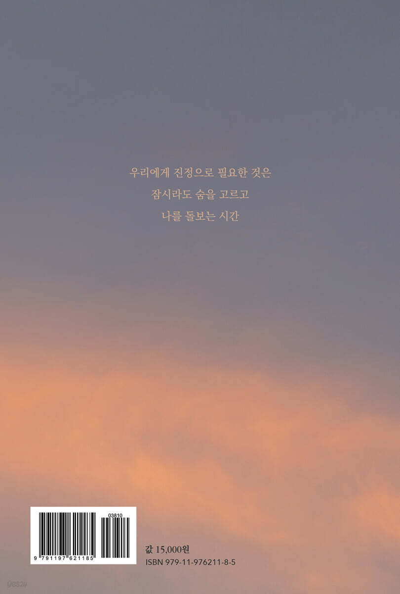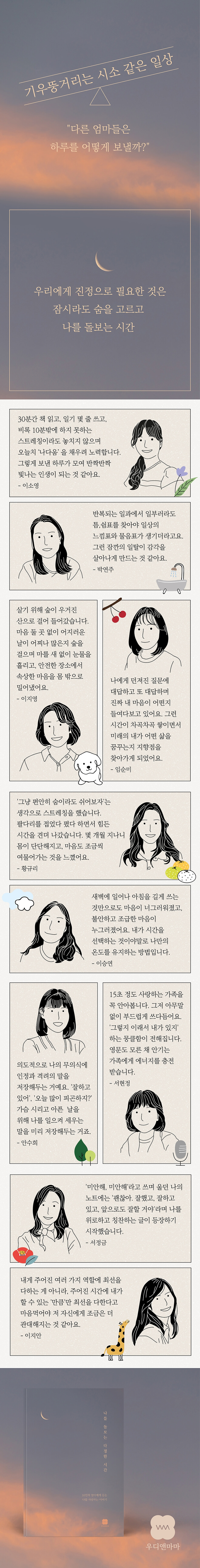--- p.15 감정의 진폭이 큰 편이라 작은 일에도 하루가 망한 것 같고 주저앉고 싶은 순간이 많아요. 그래서 스스로를 다독이는 데 많은 시간과 에너지를 씁니다. 자려고 누우면 오늘 하루도 포기하지 않고 살아낸 내가 대견하다는 생각이 들어요. --- p.31 진초록의 여름 숲에서 땀과 함께 속상함과 답답함, 괴로움을 흘려버리면 돌아오는 길에는 남은 하루를 버틸 에너지가 차오릅니다. --- p.48 저를 들여다보고 마음의 소리에 귀 기울이는 데 힘을 쏟았어요. 힘들지만 외면하려 하지 않았고, ‘나사랑 프로젝트’라 명명하며 나를 사랑하고 삶의 방향을 찾기 위해 애를 썼어요. --- p.63 저는 계속해서 순간을 살고자 합니다. 순간순간 최선을 다해 사랑하고 사랑받으면서요. --- p.87 새벽 만큼은 아이들과 거리 두기를 하면서 오롯이 나만 생각하고 무엇이라도 해볼 수 있는 시간이었어요. 그 고요한 시간에 오히려 저는 생기를 되찾았어요. --- p.102 가장 중요한 것은 삶의 우선순위를 정하는 것입니다. 절대로 양보할 수 없는 것을 제외하고는 가지치기를 합니다. 그리고 가정의 평화를 위해 남편을 관용의 미덕으로 바라보고 있습니다. --- p.118 긴 침묵을 깨고 아이들에게 용기를 내어 “미안하다, 미안하다, 미안하다”를 반복했어요. 똑같은 과정을 몇 번 거치면서 뾰족한 가시 같았던 아이가 동글동글해졌고, 아이들은 이전보다 더 자주 베란다 캠핑 의자에 앉습니다. --- p.137 힘들고 지치는 날엔 온 가족에게 “오늘이다!”하고 선포한 후 엄마 역할을 잠시 내려놓고 푹 잡니다. 잘 자고 일어나면 내일은 분명 오늘보다 가벼우니까요. --- p.152 무엇보다 욕심을 내려놓으려고 노력하고 있어요. 아내, 엄마, 연구원… 내가 맡은 모든 역할을 완벽히 잘해내려고 하면 나를 지킬 수 없다는 걸 알았어요. --- p.169 |