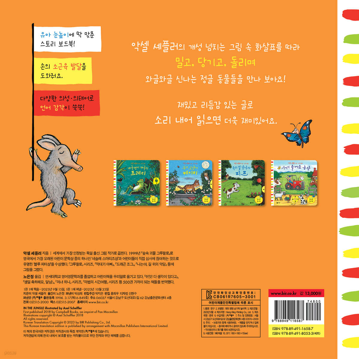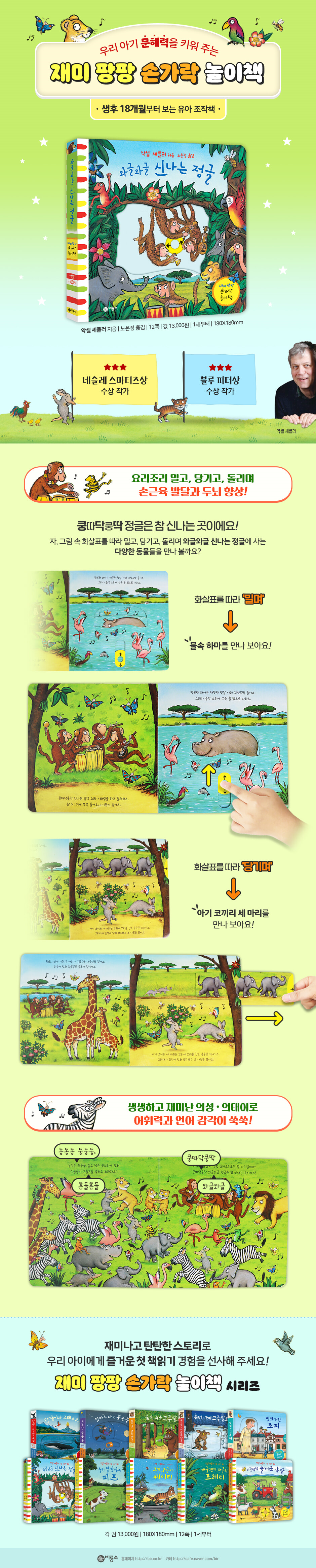 쿵따닥쿵딱 정글은 참 신나는 곳이에요! 높고 낮은 북소리에 맞춰 동물들이 흔흔들 춤추고 노래하지요. 그림 속 화살표를 따라 밀고, 당기고, 돌리며 와글와글 신나는 정글에 사는 다양한 동물들을 만나 보아요!