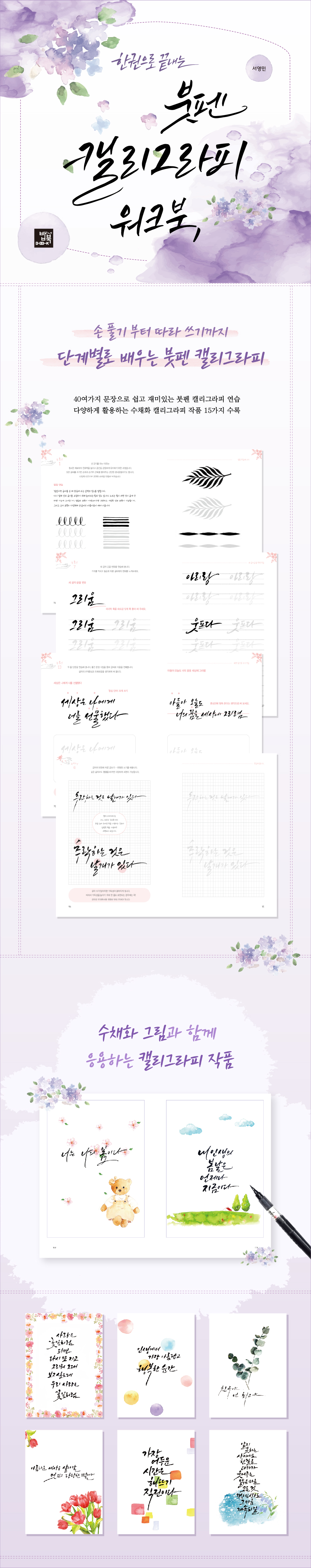 캘리그라피 기초부터 심화, 다양한 활용까지 한 권으로 끝내도록 한 워크북이다. 특히 붓과 펜의 장점을 살린 붓펜을 통해 배우도록 함으로써 쓰기는 쉽고 활용도는 높은 캘리그라피를 만날 수 있다.