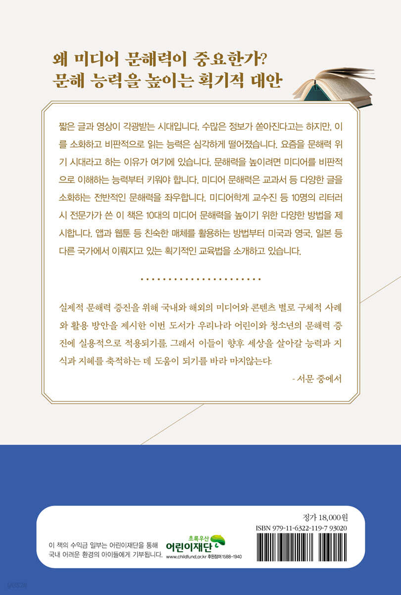 1부 문해력 위기 시대의 현실과 대안 1장 우리나라 청소년의 문해력 현황 13 한희정 국민대학교 교양대학 부교수 2장 뉴스 활용 방안 43 김성재 원광대학교 행정언론학부 초빙교수 3장 시사 칼럼 활용 방안: 세상을 해석하는 방법 75 이완수 동서대학교 미디어콘텐츠대학 교수 4장 웹 콘텐츠 활용 방안: 디지털 네이티브를 위한 교육 107 강진숙 중앙대학교 미디어커뮤니케이션학부 교수 5장 교과서 활용 방안: 문해력 중심의 교과서 개발 및 혁신 필요 137 윤세민 경인여자대학교 영상방송학과 교수 2부 문해력 증진을 위한 미디어 활용: 해외사례 1장 미국 비판적 사고 능력 키우기가 핵심 171 이정훈 대진대학교 미디어커뮤니케이션학과 교수 2장 영국 사회적 약자 고려한 공공 캠페인 201 오광일 캑터스 커뮤니케이션즈 코리아(에디티지) 이사 3장 독일 디지털 미디어 활용도 높이기 227 신종락 제주대학교 독일학과 교수 4장 일본 독서습관 형성을 위한 프로그램 추진 257 백원근 책과사회연구소 대표 5장 중국 사상 선전 도구로서의 리터러시 교육 287 조정원 원광대학교 한중관계연구원 교수 참고문헌 312 저자소개 326 |