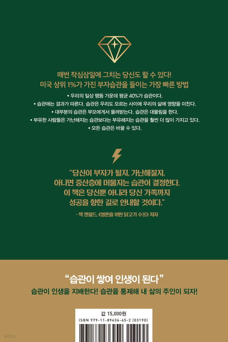 습관을 통제해 내 삶의 주인이 되자 우리가 일상적으로 하는 행동의 평균 40%는 습관이라고 한다. 습관이 무의식적으로 우리 삶을 지배하는 것이다. 이런 습관이 하루하루 쌓이면서 인생이 된다. 따라서 습관을 통제하는 자가 자신의 인생을 지배한다. 자기 삶에 대해 자신감이 생기고 자존감도 높아진다. 이런 사람이 인생에서 앞서나가며 더 나아가 이 세상을 지배하게 된다. 많은 사람이 이런 사실을 알지 못한다. 습관의 실체를 아는 사람은 드물다. 이 책은 최신 과학결과를 바탕으로 습관이 어떻게 생겨나고 어떻게 작동하는지 그 원리를 샅샅이 밝힌다. 우리 습관은 난데없이 나타난 게 아니라 부모에게서 대물림되고 인간관계, 교육, 경험 등에서 나온다. 뇌 속의 신경 세포체 집단인 ‘바닥핵’은 습관들을 감독하며, 습관을 시작하라고 지시한다. 또한 습관에는 일반습관과 핵심습관이라는 두 가지 유형이 있어 핵심습관을 바꾸면 더 효율적으로 습관을 관리할 수 있다. 습관의 원리를 파악한 후 이 책은 자수성가한 백만장자들이 어떤 습관을 가졌는지 따라 가본다. 그들 중 88%는 매일 30분 이상 자기계발을 위한 독서를 하고, 76%는 매일 30분 이상 유산소운동을 한다. 그들 중 89%는 매일 7~8시간 동안 잠을 자고, 50% 정도는 업무가 시작되기 전 3시간 전에 일어났다. 자수성가한 백만장자들은 멘토를 가지고 스스로 멘티가 되며, 긍정적으로 생각하고 목표를 추구했다. 부자들의 습관은 어쩌면 너무나 당연하고 지루해 보일지 모른다. 하지만 중요한 것은 실제로 이것들을 실천했고 습관으로 만들었다는 것이다. 여기에 성공의 비밀이 있다. 습관 시소를 움직여라! 평범한 사람을 부자로 만드는 21일 습관 프로젝트 습관은 어릴 때부터 부모나 주변 환경의 영향으로 쌓여 오랫동안 유지되어온 것이다. 무의식적인 행동이나 생각인 습관은 뇌의 에너지를 덜 쓰기 때문에 뇌는 습관을 좋아한다. 그래서 습관을 바꾸려고 들면 뇌는 저항하게 된다. 우리의 결심이 매번 작심삼일에 그치는 이유다. 이 책은 습관은 완전히, 그리고 효율적으로 바꾸는 방법을 제시한다. 먼저 ‘습관 시소’라는 개념을 소개하는데, 시소의 한쪽에는 부유해지는 습관이 있고 다른 한쪽에는 가난해지는 습관이 있다. 부자가 되고 싶다면 당신이 가진 모든 습관 중 50% 이상이 부유해지는 습관이어야 한다. 습관 시소가 부를 축적하는 올바른 방향으로 기울어지도록 해야 한다. 21일, 단 3주간 이 책의 프로그램을 따라 하면 그렇게 만들 수 있다. 우선 내가 꿈꾸는 삶과 목표를 그려보고 목표를 이루기 위해 해야 할 일을 차근차근 습관으로 만들어나간다. 또한 내가 이미 가진 습관들을 파악해 리스트로 작성한 뒤, 부자습관인지 가난해지는 습관인지 평가해본다. 그런 다음 ‘부자습관 체크리스트’를 통해 1주차에는 아침습관, 2주차에는 낮습관, 3주차에는 밤습관의 순서로 습관을 바꿔본다. 더불어 습관을 더 빨리 바꾸는 방법도 소개한다. 이 책은 그저 읽고 덮으면 끝나는 책이 아니다. 책에 제시된 빈칸과 표에 직접 써 넣어가며 바로 프로그램을 따라 해보고 실천할 수 있는 워크북이다. 지금 내 삶이 불만족스럽다면, 이번만은 꼭 바꾸고 싶다면 당장 펜을 들고 이 책을 펼쳐보자. |
