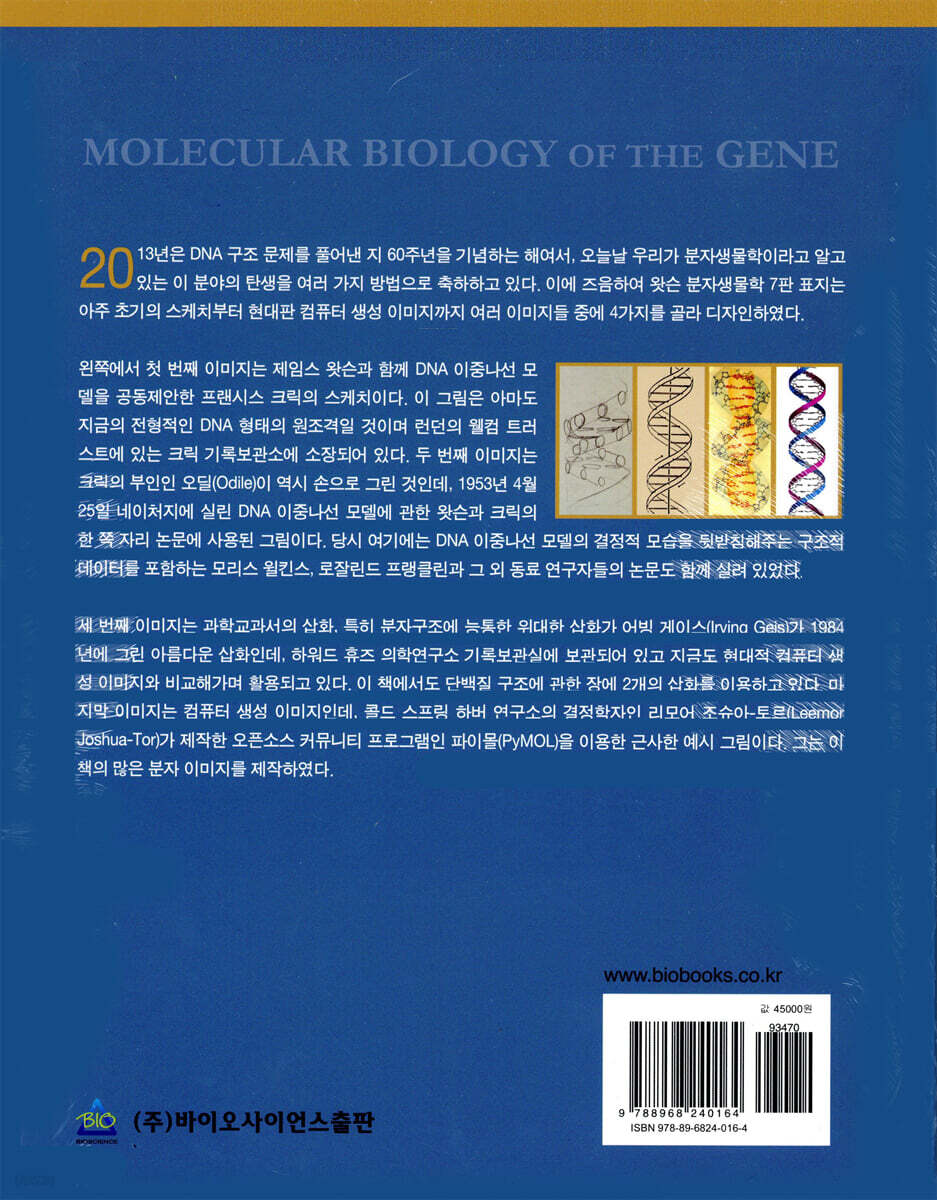 역사 1 멘델의 세계관 2 유전정보를 전달하는 핵산 2부 고분자의 구조와 연구 3 약한 그리고 강한 화학결합의 중요성 4 DNA 구조 5 RNA의 구조와 다능성 6 단백질 구조 7 분자생물학 기법 3부 유전체의 유지 8 유전체 구조, 염색질 그리고 뉴클레오솜 9 DNA 복제 10 돌연변이 발생과 DNA 수선 11 분자수준에서의 상동재조합 12 자리특이적 DNA 재조합과 전위 4부 유전체의 발현 13 전사 기작 14 RNA 이어맞추기 15 번역 16 유전암호 17 생명의 기원과 초기 진화 5부 조절 18 원핵생물의 전사 조절 19 진핵세포의 전사 조절 20 조절 RNA 21 발생과 진화에서 유전자 조절 22 유전체분석 및 시스템생물학 6부 부록 부록 1 모델 생물체 부록 2 해답 |