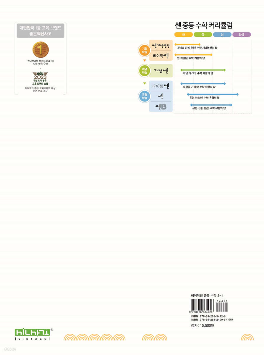 쉬운 개념 학습+기본 문제 반복 훈련 기본&핵심 유형 집중 훈련 꼭! 나오는 학교 시험 기출 문제로 실전 감각 UP! 1. 수학 기본기 강화 훈련서 〈베이직쎈〉은 개념을 쉽고 체계적으로 설명하고 기본 문제를 충분히 제공하여 개념 적용 훈련을 집중적으로 할 수 있습니다. 2. 실전에 꼭 필요한 기본&핵심 유형 선별 〈베이직쎈〉은 필수적인 기본&핵심 유형을 선별하고, 유형별 해결 전략을 제시하여 문제 적용력을 높일 수 있습니다. 또한 변형, 응용 문제까지 순차적으로 구성하여 응용력을 강화시킬 수 있습니다. 3. 기출 문제로 실전 연습 가능 〈베이직쎈〉은 출제율이 높은 학교 시험 기출 문제로 실전 연습이 가능합니다. 또 서술형 문제를 구성하여 서술형 연습을 할 수 있습니다. 4. 개념을 구조화하여 정리 개념 사이의 관계를 MAP으로 정리하고, 틀린 부분 바르게 고쳐 쓰기 문제를 통해 개념을 정확하게 학습했는지 확인할 수 있습니다. |