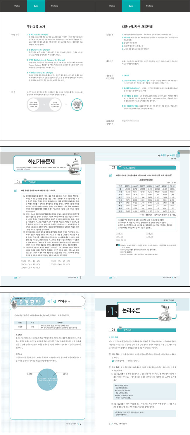 2013년 하반기 최신기출문제를 수록하여 최근 출제경향을 한눈에 파악할 수 있게 하였고, DCAT 기출문제를 분석하여 만든 영역별 핵심이론ㆍ적중예상문제를 함께 수록하여 DCAT에 출제 가능한 문제유형을 빠르게 익힐 수 있도록 구상하였습니다. 또한 한자능력검사를 어휘 영역과 독해 영역으로 나누어 핵심이론과 적중예상문제를 통해 완벽하게 끝낼 수 있도록 하였으며, 두산그룹의 인재상과의 부합도를 알아볼 수 있는 인성검사와 정서역량검사를 수록하여 ‘나’를 표현하고 브랜드화할 수 있도록 구성하였습니다. 마지막으로 두산그룹의 실제 면접에서 면접 실전 대책, 최근 기출 면접 등 채용 관련 내용을 꼼꼼하게 다루어 별도의 학습서가 필요하지 않도록 하였습니다.
