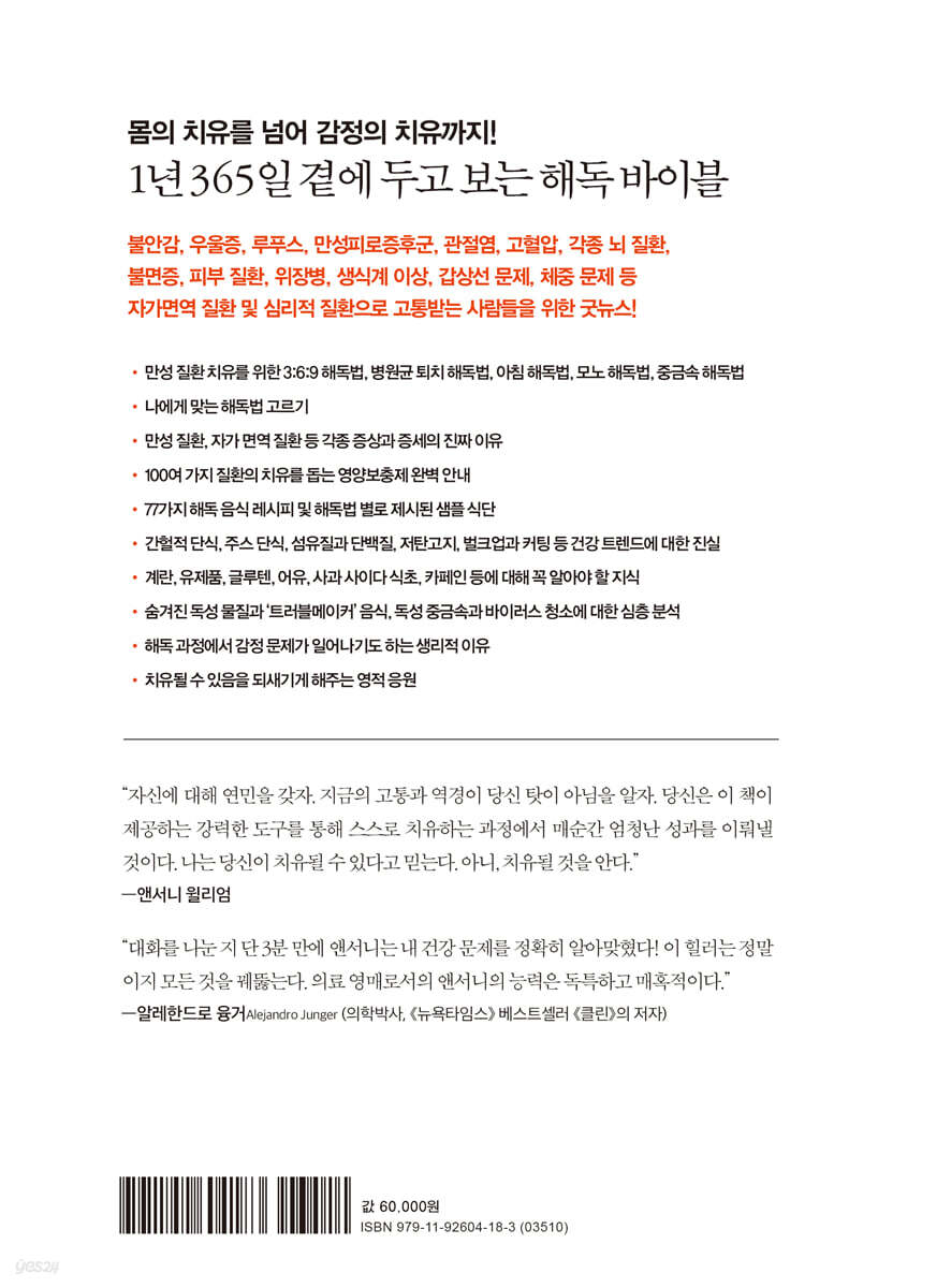 --- 「위에서 온 해독법」 중에서 우리 몸은 독소를 청소하고 배출하기 위해 도움이 필요하다. 몸이 알아서 다 처리하기엔 독소가 너무 많다. 매일 자연스럽게 배출하는 양보다 더 많은 양이 유입되고 있다. 몸은 세포와 조직 깊숙이 침투한 독소와 독성 물질, 병원균에 끊임없이 맞서야 한다.…… 제대로 된 해결책은 어쩔 수 없이 노출되는 독소가 몸에 축적되어 우리를 병들게 하지 않도록 올바른 방법으로 청소와 배출을 돕는 것, 즉 해독법을 실천하는 것이다. 또한 해독을 하지 않을 때도 셀러리 주스나 중금속 디톡스 스무디 같은 약효 음료를 일상적으로 섭취하는 것이다. --- 「우리 몸속 독소에 대한 경종」 중에서 유해한 박테리아와 바이러스, 곰팡이균과 독소가 몸에 침범하여 건강상의 문제가 뿌리를 내리기 시작하는 곳은 바로 간이다. 그리고 어차피 건강한 마이크로바이옴을 얻기 위해서도 올바른 해독법으로 간 건강부터 회복해야 한다. 간 건강이야말로 몸 전체의 건강을 유지하는 열쇠이며, 최고의 간 건강 관리법은 다름 아닌 해독이다. --- 「마이크로바이옴이 문제일까?」 중에서 간헐적 단식은 아프지 않은 사람에게는 일시적으로 도움이 되는 반창고와 같다. 그러나 그 이상이 되어서는 안 된다. 아프지 않은 사람도 그나마 간헐적 단식의 이점을 누리려면 올바른 방법으로 단식을 해야 한다.…… 실제로 지병이 있거나 삶의 질을 떨어뜨리는 만성 질환이나 증세를 극복하려고 노력 중인 사람인 경우에는 간헐적 단식을 통해 얻을 게 없다. 오히려 간헐적 단식은 회복을 더디게 만들고, 심지어 질환과 증세를 악화시킬 수 있다. --- 「간헐적 단식의 진실」 중에서 섬유질 부족이 문제가 아니다. 우리는 섬유질이 부족하지 않다. 제대로 된 음식 섭취로 장내 유해한 세균과 바이러스에게 먹이를 주지 않는 게 관건이다.…… 건강한 식습관이 우리에게 더 큰 도움이 되는 면은 따로 있다. 건강한 음식을 많이 먹으면 유해한 박테리아와 바이러스의 먹이가 될 만한 음식을 자연히 덜 먹으므로 장에 문제가 생길 확률이 줄어든다는 것이다. 장이 건강하려면 섬유질을 늘릴 게 아니라 트러블메이커 음식을 줄여야 한다. --- 「주스냐 섬유질이냐」 중에서 사람들은 계란을 훌륭한 단백질 공급원으로 알고 있다. 계란을 떠올리면 단백질이 자동으로 연상되는 것은 고도의 마케팅 전략의 결과이다. 사실 계란에 함유된 단백질은 바이러스와 유해 박테리아와 곰팡이의 먹이이다. 오래 전 실험실에서 바이러스를 비롯한 병원균을 비밀리에 배양할 때 계란 단백질을 사용했기 때문이다. 많은 병원균이 계란 단백질을 먹이로 인식하도록 진화해 왔다는 것이다. --- 「문제를 일으키는 트러블메이커 음식」 중에서 유제품은 이렇듯 소화 과정에 정체를 일으켜 소장과 대장에 있으면 안 되는 유해한 박테리아, 바이러스, 곰팡이가 증식할 수 있게 해준다.…… 유제품이 간 기능을 둔화시켜 간에 즉각적이고 극심한 정체를 일으키기 때문이다. 그러면서 점액질이 생성되는 것이다. 몸의 여과기인 간이 정체되면 간이 여과하던 독소들이 간에서 빠져나와 몸에 다시 퍼지면서 히스타민이 증가하고, 이는 더 많은 점액질 생성으로 이어진다. --- 「문제를 일으키는 트러블메이커 음식」 중에서 면역 체계가 자기를 공격해서 생긴 증상이라는 설명은 사실 그 증상의 근본 원인을 아직 밝혀내지 못했기 때문에 애꿎은 몸을 탓하는 논리에 불과하다. 사실 우리 몸의 면역 체계는 절대 갑상선을 파괴하지 않는다. 우리 몸의 면역 체계는 절대 피부를 파괴하지 않는다. --- 「문제를 일으키는 트러블메이커 음식」 중에서 이 책의 모든 해독법은 지방을 줄이는 데 초점이 맞춰져 있다. 그 이유 중 하나는 피를 맑게 하기 위해서이다. 피를 맑게 해주면 독소가 더 쉽게 세포와 조직에서 빠져나와 혈류로 유입되어 마침내 몸에서 배출될 수 있다. 돼지고기를 멀리하는 것은 독소를 제거하여 몸과 마음을 치유할 수 있는 기회를 자신에게 선물하는 것이다. --- 「문제를 일으키는 트러블메이커 음식」 중에서 해독법을 선택할 때는 지금 이 순간 어떤 해독법이 해볼 만한가? 하는 질문을 기준으로 삼으면 된다. 어떤 해독법이든 지금 실천에 옮길 만한 해독법이 자신에게 가장 유익한 해독법이다. --- 「내게 맞는 해독법 고르기」 중에서 셀러리 주스는 왜 모든 해독법의 필수 요소일까? 없어도 되지만 있으면 그만큼 효과가 나는 것이어서가 아니다. 셀러리 주스가 다른 모든 해독 작용의 효과를 극대화하기 때문이다. 셀러리 주스는 모든 메디컬 미디엄 해독법의 효능을 향상시키고, 해독 중에 하는 모든 일의 효과를 증폭시킨다. --- 「내게 맞는 해독법 고르기」 중에서 원조 3:6:9 해독법의 목적은 몸속 깊이 숨어 있는 독소와 병원균을 뿌리 뽑아 만성 증상으로부터 자유로운 미래를 여는 것이다.…… 원조 3:6:9 해독법은 만성 질환을 일으키는 독성 트러블메이커를 간을 비롯한 장기에서 씻어냄으로써 무수한 증상과 증세를 완화하거나 아예 없애도록 도와준다. --- 「원조 3:6:9 해독법」 중에서 초급 3:6:9 해독법은 해독이 처음인 초심자, 또