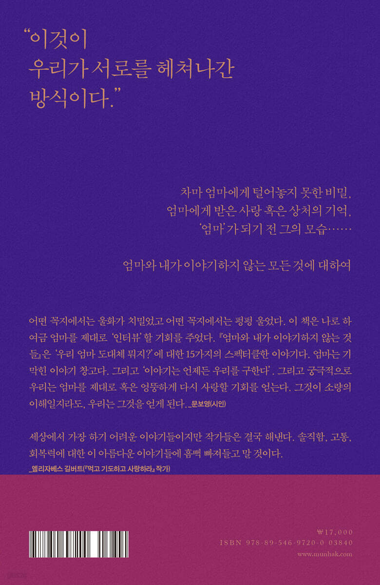 어떤 꼭지에서는 울화가 치밀었고 어떤 꼭지에서는 펑펑 울었다. 이 책은 나로 하여금 엄마를 제대로 ‘인터뷰’할 기회를 주었다. 『엄마와 내가 이야기하지 않는 것들』은 ‘우리 엄마 도대체 뭐지?’에 대한 15가지의 스펙터클한 이야기다. 엄마는 기막힌 이야기 창고다. 그리고 ‘이야기는 언제든 우리를 구한다’. 그리고 궁극적으로 우리는 엄마를 제대로 혹은 엉뚱하게 다시 사랑할 기회를 얻는다. 그것이 소량의 이해일지라도, 우리는 그것을 얻게 된다. - 문보영 (시인)