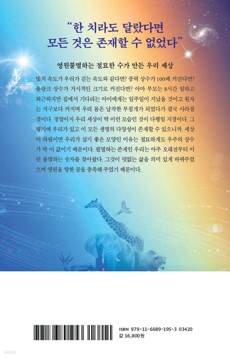 우리 사는 세상이 저런 모습이 아니라 바로 이런 모습인 이유는 물리학의 상수가 딱 이 값이기 때문입니다. 만약 그렇지 않았다면 저도, 그리고 당신도 이 세상에 존재할 수 없습니다. 우리 모든 존재의 근원에는 물리학의 자연 법칙과 보편 상수가 있습니다. 물리학이 우주 어디에서나 같기 때문에 우리는 우주를 이해할 수 있습니다. 이 세상의 이해 불가능한 이해 가능성은 물리학이 우주 어디서나 같기 때문입니다.
