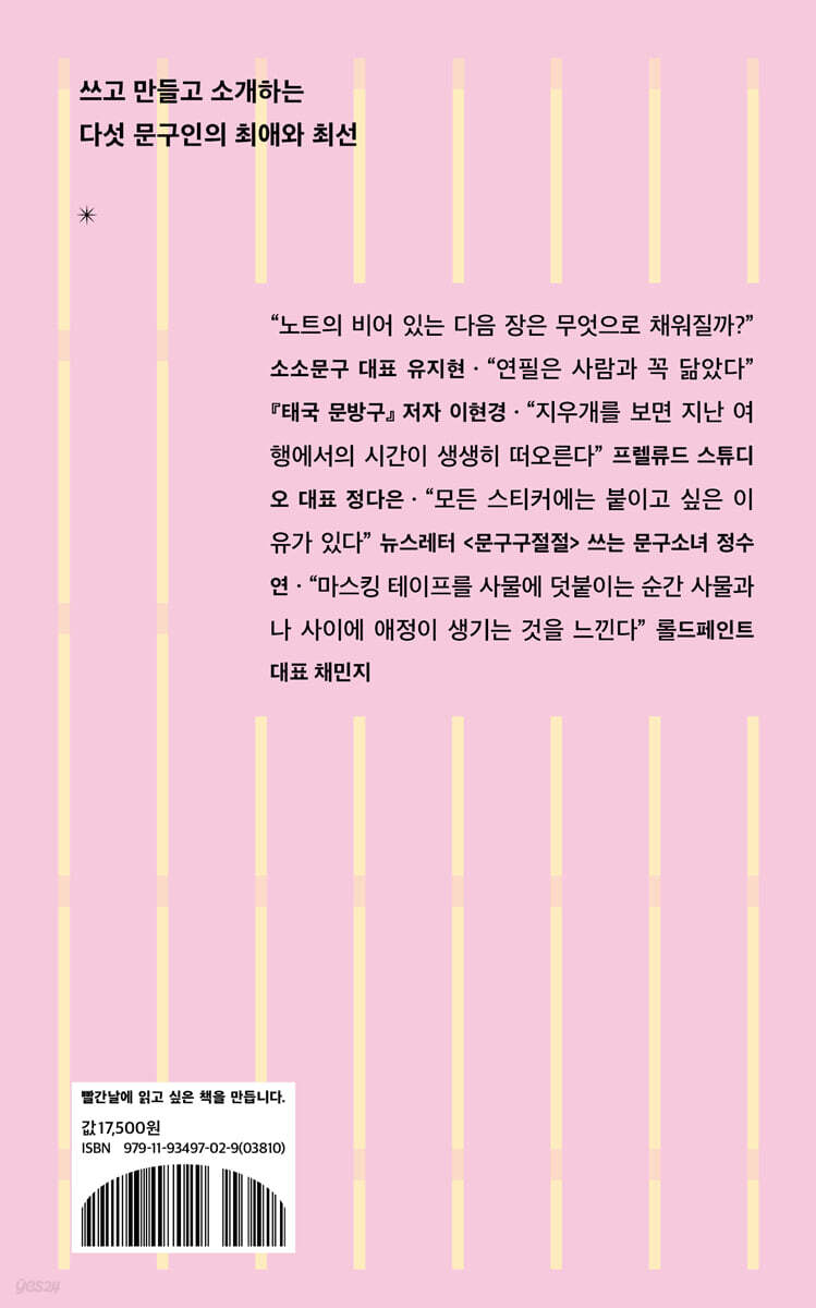 --- p.12 누구나 안다. 휴대폰 메모장이 가진 대체 불가한 편리함을. 그럼에도 사고의 범위를 넓히는 공간으로 노트를 선택한 이유는 종이라는 물성이 가진 매력 때문만이 아니다. 우리의 사고는 불, 물, 공기의 성질과 닮아서 지면 위에서 활활 타오르거나 흐르고, 날아다니거나 흩어져야 비로소 확장되기 때문이다. 노트의 비어 있는 다음 장은 무엇으로 채워질까? --- p.18 “‘작고 깊다’ 같은 추상적인 말 말고, 더 구체적인 콘셉트가 필요해요.” 당시 소소문구에 제품을 파는 직책은 김청 브랜드 매니저뿐이었다. 그렇기에 제품의 마케팅, 세일즈에 관한 안건은 모두 그 한 명에게서 나왔다. 그는 가격과 품질도 중요하게 생각했지만 ‘완성도 있는 브랜딩’을 가장 강조했다. --- p.24 ‘연필의 소명은 소멸이다’라는 말이 있다. 연필은 다른 필기구와 달리 흔적 없이 소진된다. 연필을 한 사람으로 본다면 이 얼마나 깔끔한 성품인가? 삶의 길이가 세월을 따라 조금씩 짧아지며 소멸되는 과정을 연필은 온몸으로 보여 준다. 어쩌면 그것은 이 세상에서 가장 정직한 소멸일지도 모른다. --- p.50 모든 가방이 엑스레이 검사대를 완전히 통과할 때쯤 누군가 옆에서 조용히 나를 불렀다. 무엇인가 문제가 일어나고 있는 듯했다. 이어서 심각한 표정을 한 직원 두 명이 와서 배낭 안에 있는 모든 물건을 꺼내 보라고 했다. 나는 순간 멈칫했다. 배낭 안에는 연필이 한가득 있었기 때문이다. 새벽 내내 잠 한숨 못 자고 랩과 에어캡으로 연필을 한 자루 한 자루 포장했다. 어림잡아 500자루가 넘었을 것이다. 나는 진지한 표정으로 “이걸 모두 다요?”라고 조심스레 물었다. 그들은 다시 한번 심각한 표정을 지으며 “네.”라고 단호하게 대답했다. --- p.55 초등학생 때 리추얼이라는 단어를 알았더라면 나의 리추얼은 연필 깎기라고 소개했을 것이다. 연필을 깎는 일은 잠들기 전 어두운 밤에 경건하게 이루어졌다. 학교에서부터 학원까지 모든 일과를 마치고 집으로 돌아와 숙제까지 끝내고 나면 10시 정도가 되었다. 샤워를 하고 좋아하는 잠옷을 입으면 조용한 밤이 찾아왔다. 방 안의 불을 끄고 책상에 앉아 책상 위에 놓인 작은 스탠드를 켜고 가방에서 필통을 꺼내 열었다. 학교와 학원에서 하루를 바쁘게 보내고 돌아오면 모든 기운이 쭉 빠졌다. 지난밤 뾰족하게 깎아 둔 연필도 모두 뭉뚝해져 어쩐지 지쳐 보였다. 오늘도 각자 저마다의 할 일을 멋지게 해낸 것이다. --- p.72 하나로도 완전한 문구들 사이에서 지우개는 늘 연필과 함께 다닌다. 혼자 다니면 편할 것을. 나란히 걷는 일에는 많은 에너지가 필요하니까. 그럼에도 함께한다는 건 왠지 보기 좋다. 사물도, 사람도. --- p.105 지우개의 디테일로 그 사람이 가진 면모를 다 알 수는 없겠지만 적어도 사물과 사용자에 대한 창작자의 태도는 짐작해 볼 수 있다. 실제로 문구를 제작하다 보면 우연히 발견되는 문구는 있어도 우연히 만들어지는 문구는 없다는 사실을 배우게 된다. 선택의 연속으로 만들어지는 문구는 의도를 담은 노력의 산물이다. --- p.114 도대체 판매용 지우개를 왜 쓰는 걸까? 알 수 없는 일이다. 아마도 여러 이유가 있겠지. 판매용 지우개를 종이도 아닌 집기 위에 사정없이 문지르는 손님도 간혹 보게 되는데 그럴 때면 아, 저분은 지금 그저 아무 생각도 없는 상태일지 모르겠다는 생각이 든다. --- p.137 모든 스티커에는 붙이고 싶은 이유가 있다. 특히 노트북은 일을 할 때 가장 많이 쓰는 도구로, 그런 노트북 위에 스티커를 붙일 때는 반대편에 앉아 나의 노트북을 보게 될 상대방의 시선을 의식할 수밖에 없다. 우리는 스티커를 붙이는 것으로 취향을 드러낸다. --- p.151 주머니 사정을 생각하지 않고 같은 모양의 스티커를 여러 장 살 때 어른이 되었다고 느꼈다. --- p.169 휴대폰 뒷면에 어설프게 붙은 그 작은 스티커를 끝내 떼지 못하는 사람들. 아이가 막무가내로 붙여 놓았다고 머쓱하게 말하면서도 접착력이 약해진 스티커가 떨어질세라 손으로 다시 한번 꼭꼭 누르며 번지는 희미하지만 단단한 미소를 본다. --- p.172 우리나라는 보통 1인치 코어(지관의 내경)를 사용하기에 약 26mm(정확히는 2.54cm) 지름의 지관에 마스킹 테이프가 돌돌 말리는 형태로 제작된다. 긴 휴지심처럼 생긴 지관에 마스킹 테이프가 감기고, 그것을 김밥 썰 듯 자르면 우리가 아는 마스킹 테이프의 모양이 되는 것이다. --- p.187 마스킹 테이프의 폭은 그 안의 디자인만큼이나 다양하다. 나에게 마스킹 테이프의 폭은 붓의 호수와 같다. 물감으로 채색할 때 필요에 따라 아주 얇은 세필 붓이나 널찍한 면적을 빠르게 칠할 수 있는 페인트 붓을 고르는 것처럼 마스킹 테이프의 폭을 선택하는 것이다. 그렇게 고른 것을 쭉 찢어서 붙이는 것만으로 채색이 된다. --- p.188 마스킹 테이프의 재점착을 경험해 봤다면 붙일 장소를 찾는 데 망설이지 않아도 괜찮다는 것을 알게 된다. “이 시대에 유일하게 아날로그적으로 실행 취소가 가능한 도구였네요.” 팀원의 이 한마디에 ‘실행 취소’라는 의미가 너무 좋다며 동시에 박수를 짝짝 쳤다. 맞다. 떼어 내면 흔적도 없이 되돌아가는 완전한 실행 취