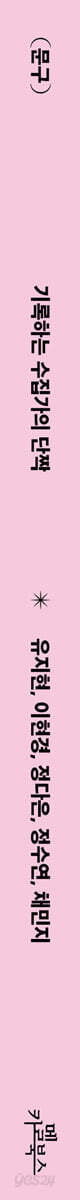 제본소집 딸 비어 있는 책 디깅 노트로 향하는 여정 쓰는 사람의 수첩 탐험기 { 연필 } · 이현경 연필을 닮은 삶 인천 공항에서 생긴 일 나는 어쩌다 실리카 겔 수집가가 되었나 혹시, 이 연필깎이를 아시나요? 파버카스텔 연필과의 어떤 인연 { 지우개 } · 정다은 지우개라는 세계 지우개와 디테일 오래된 문구를 대하는 마음가짐 세상에 이런 일이 내 머릿속에 지우개 문방구 업무 일지 { 스티커 } · 정수연 모든 스티커에는 붙이고 싶은 이유가 있다 센스의 척도 Stick-er, 버티는 사람에 대하여 순간을 이어 붙이는 문구 엄마는 스티커를 좋아해 { 마스킹 테이프 } · 채민지 15mm × 10M : 마스킹 테이프 폭의 비밀 붙였다 떼었다 : 울퉁불퉁, 마음처럼 되지 않는 길을 따라서 돌돌 말려 있는 물감 : 돌이켜 보면 어려서부터 표현의 도구가 필요했다 하루에 한 조각 : 일상이 예술이 되는, 주의 사항 : 그 누구도 이런 이야기를 해 주지 않았다 |