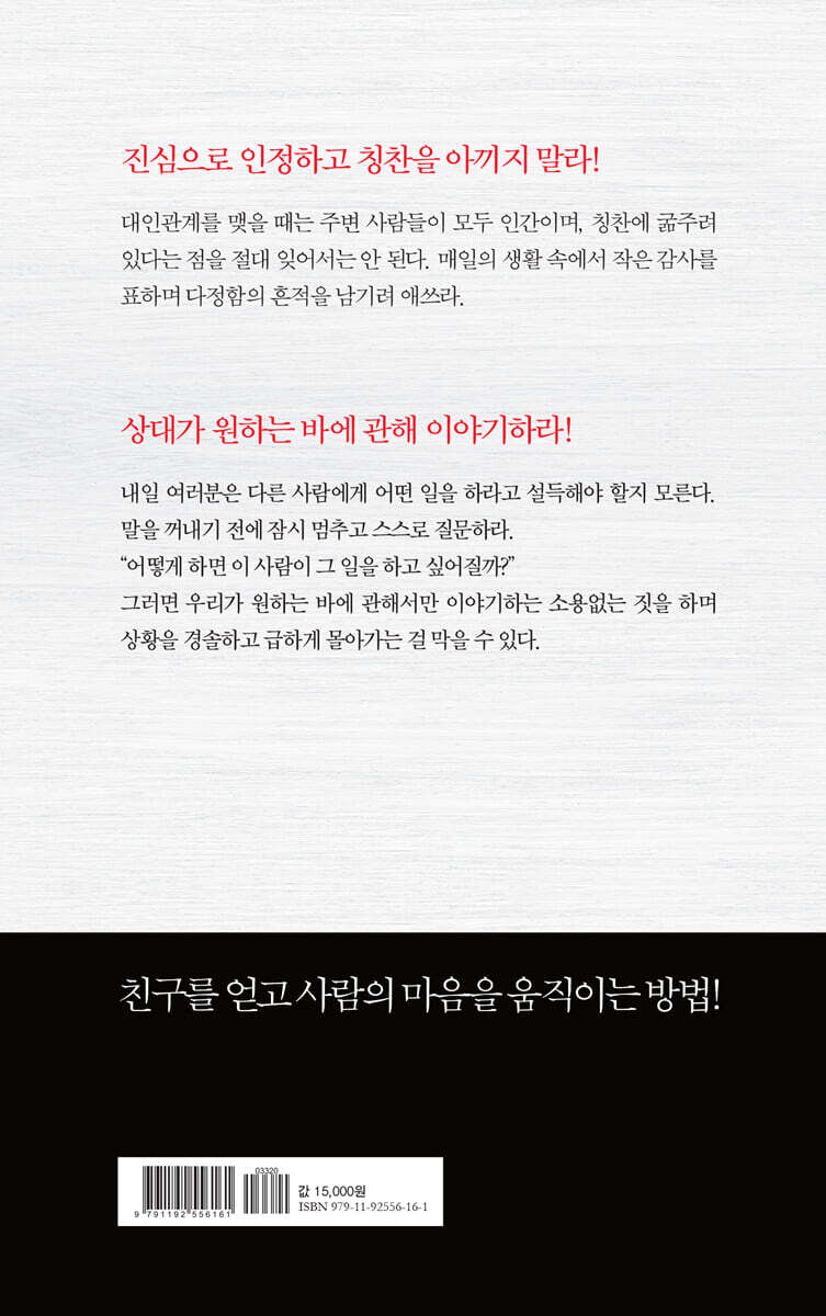 어떻게, 그리고 왜 이 책을 쓰게 되었나? 이 책을 최대한 활용할 9가지 방법 제1부 사람을 대하는 기본 기술 제1장 꿀을 모으고 싶다면 벌집을 차지 말라 제2장 대인관계의 큰 비밀 제3장 이 일을 할 수 있는 사람은 온 세상을 얻는다, 이 일을 할 수 없는 사람은 외로운 길을 걷는다 제2부 사람들로부터 사랑받는 법 제1장 이렇게 하면 어디서나 환영받는다 제2장 좋은 첫인상을 남기는 간단한 방법 제3장 이렇게 하지 않으면 문제에 휘말릴 것이다 제4장 쉽게 대화를 잘하는 사람이 되는 방법 제5장 사람들의 흥미를 끄는 방법 제6장 사람들이 즉시 나를 좋아하게 만들 방법 제3부 사람들을 설득하는 법 제1장 논쟁에서 이길 방법은 없다 제2장 적을 만드는 확실한 방법 그리고 그러한 상황을 피하는 방법 제3장 잘못을 했다면 인정하라 제4장 꿀 한 방울 제5장 소크라테스의 비결 제6장 불만을 다스리는 안전밸브 제7장 협조를 구하는 방법 제8장 경이로운 효과가 나타나는 방법 제9장 모든 사람이 원하는 공감 제10장 모든 사람이 좋아하는 호소 방법 제11장 영화에서도 TV에서도 볼 수 있는 방법, 우리도 써볼까? 제12장 어떤 방법도 소용이 없을 때, 이 방법을 써보자 제4부 리더의 소통: 감정을 상하게 하거나 분노를 일으키지 않으면서 사람을 변화시키는 방법 제1장 잘못된 점을 반드시 지적해야 한다면 이렇게 시작하라 제2장 미움받지 않고 비판하는 법 제3장 자신의 실수부터 이야기하라 제4장 명령받고 싶은 사람은 아무도 없다 제5장 상대의 체면을 세워라 제6장 사람들을 격려해 성공으로 이끄는 방법 제7장 개에게 좋은 이야기를 들려주라 제8장 못하는 일은 하기 쉬워 보이게 만들어라 제9장 상대가 즐거운 마음으로 내 제안에 협력하게 하라 |