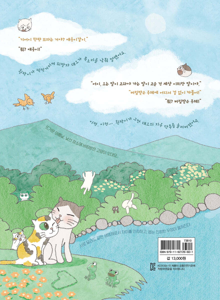 뜨거운 여름날, 느닷없이 낯선 장소에 버려진 고양이 오대오. 충격과 원망, 슬픔이 가득하지만 이내 용기와 호기심으로 꿋꿋하게 살아갑니다. 대오와 같이 절망적인 상황 속에서 서로 의지하며 희망을 찾아가는 고양이 살구와 귀가 처진 하얀 개 흰둥이, 눈만 마주쳐도 그르렁대는 동네 왕초 고양이 흰팍이, 상처받은 대오의 마음을 어루만지며 스스로를 치유하는 아저씨, 대오가 한눈에 반한 고양이 윙크까지, 대오는 개성 만점 여러 친구를 만나고, 그들과 좌충우돌 이야기를 펼쳐갑니다. 우리 주변 어디든 고양이는 있게 마련입니다. 그 고양이들은 대오일 수도 있고, 살구일 수도, 흰팍이일 수도 있습니다. ‘고양이는 고양이’는 내 주변의 고양이들이 전해 주는 멋진 이야기를 만나게 해줍니다. |