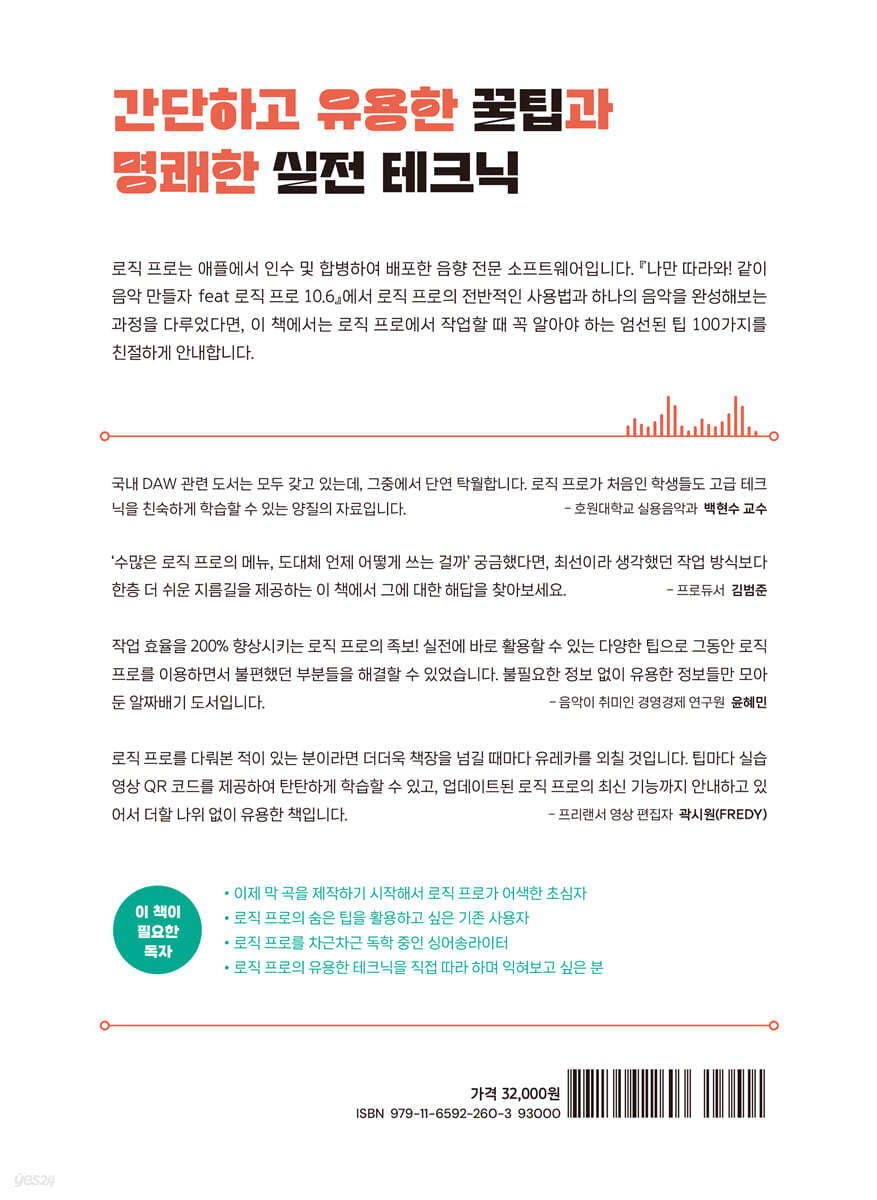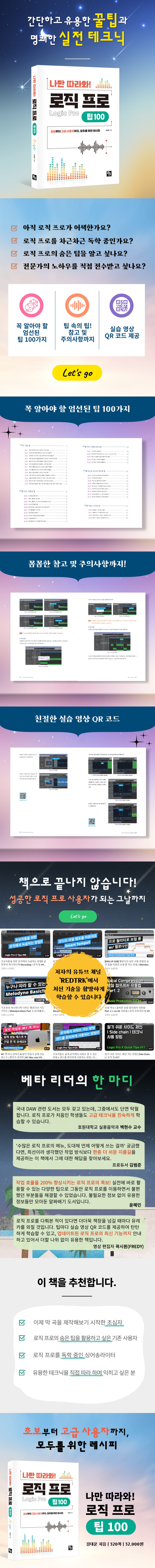 로직 프로를 다뤄본 적이 있는 분이라면 더더욱 책장을 넘길 때마다 유레카를 외칠 것입니다. 팁마다 실습 영상 QR 코드를 제공하여 탄탄하게 학습할 수 있고, 업데이트된 로직 프로의 최신 기능까지 안내하고 있 어서 더할 나위 없이 유용한 책입니다. - 곽시원 (FREDY, 프리랜서 영상 편집자)