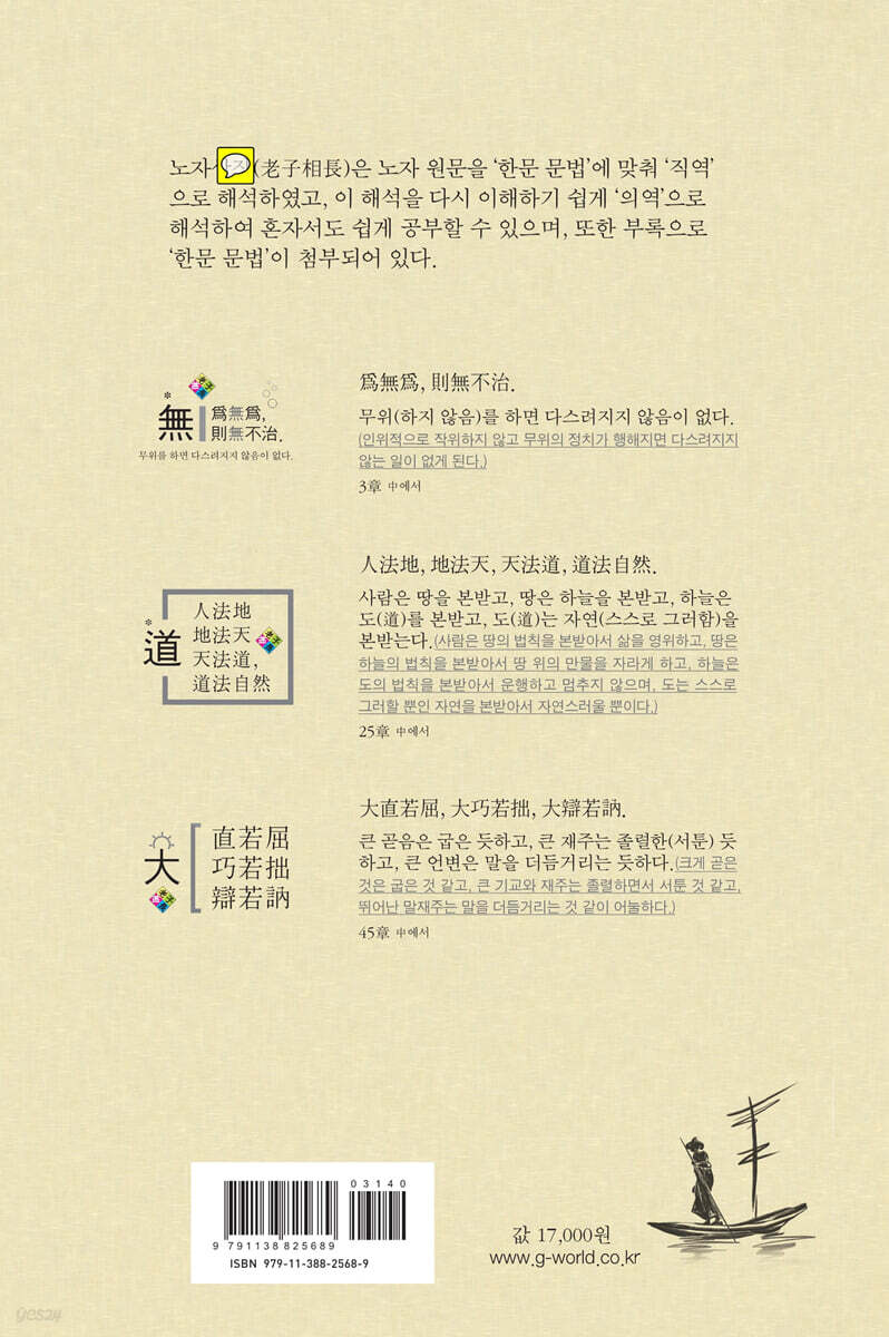 도(道)와 덕(德)의 학문이며, 도(道)는 천하 만물과 세상 만사의 근본이고 본질이며 모든 변화 속에서 영원히 변하지 않으며, 덕(德)은 도(道)가 드러난 것으로 도와 덕은 하나라고 할 수 있다. 무위(無爲)와 자연(自然)의 학문이고, 비(非)현실이 아닌 초(超)현실적인 학문이기 때문에 수천 년이 지난 지금도 읽혀지는 형이상학적 책이라고 할 수 있다. 이처럼 노자(老子)의 도덕경(道德經)은 바다처럼 넓고 아득하여 읽기 불편한 책일 수도 있기에 ‘노자상장(老子相長)’에서 노자 원문을 ‘한문 문법’에 맞춰 ‘직역’으로 해석하였고, 이 해석을 다시 이해하기 쉽게 ‘의역’으로 해석하여 혼자서도 쉽게 공부할 수 있으며, 또한 부록으로 ‘한문 문법’이 첨부되어 있다. |