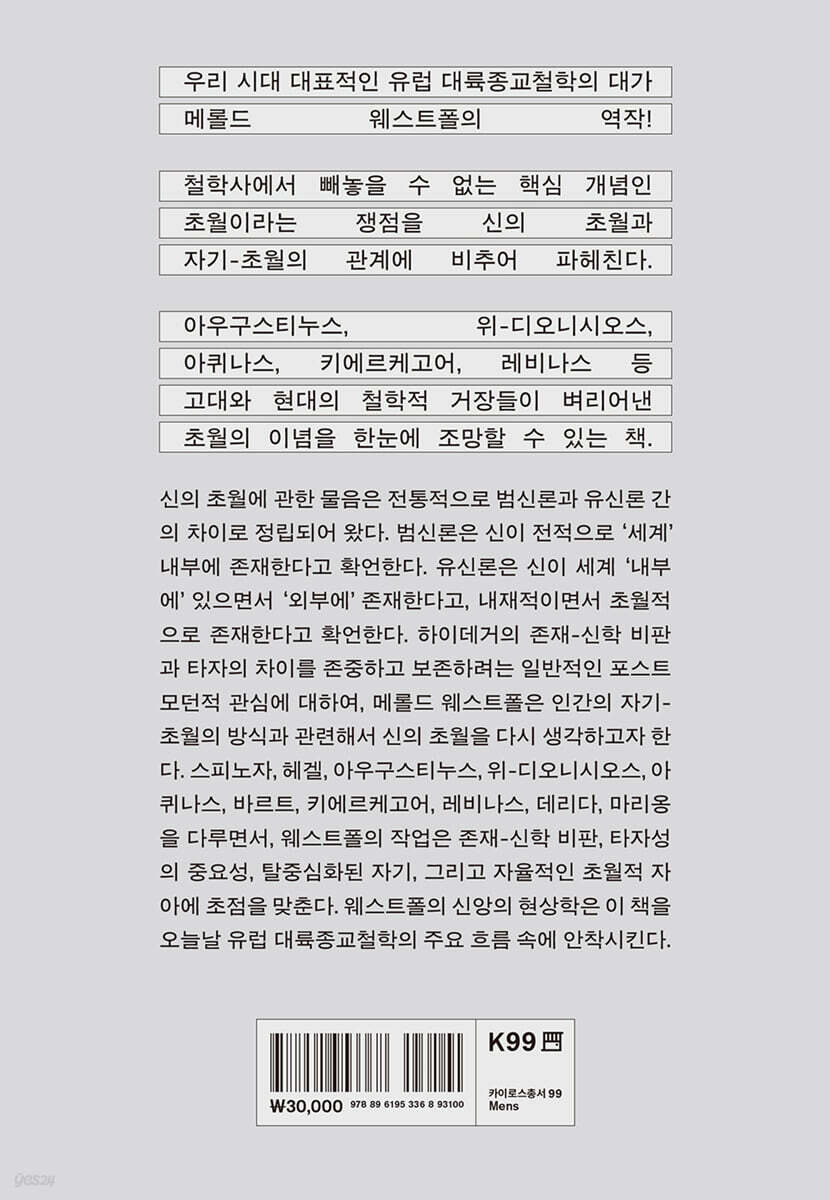 --- p.8, 「한국어판 지은이 서문」 중에서 탈근대적 사상은 타자성에 진정으로 열려 있는 자기(self)는 더는 근대성이 그토록 열광했던 진리와 선의 자율적 조정자가 되지 않을 것이라는 가정을 내세운다. --- p.33, 「들어가는 말」 중에서 철학은 신이 지켜야 할 규칙을 만든다. 고대의 욥처럼, 철학은 인간의 설명에 대한 욕망/요구를 충족시킬 수 있는 모습으로 철학 속으로 들어올 것을 신에게 요구한다. 이에 존재-신학은 계산적-표상적 사유로서의 성격 때문에 나쁜 신학이 된다. --- p.87-88, 「1장 하이데거」 중에서 우리는 두 가지 경쟁적인 묘사 또는 우주론을 가지고 있다. 내재성 이론은 무한하고 궁극적인 것이 비인격적이라고 주장한다. 초월의 이론은 무한하고 궁극적인 것이 인격적이라고 주장한다. 여기서 가장 중요한 물음이 존재-신학적 형식을 취할 수 있다. 최고 존재에 대한 이론 중 어떤 것이 존재 전반에 대해 가장 좋은 설명을 제공하는가? 누구의 신이 충분 근거율의 요구를 가장 잘 충족시키는가? --- p.125, 「2장 스피노자」 중에서 스피노자처럼 헤겔은 범신론자지만 아주 다른 부류의 범신론자다. 그는 우주론적 초월에 대한 논쟁을 탐구할 수 있는 또 다른 자리를 제공한다. 헤겔에게 세계는 준궁극적으로 자연의 세계일 뿐이고 궁극적으로 인간 정신과 이 정신의 역사의 세계라는 점에서 ‘우주론적’이라는 용어는 더는 적절치 않다. --- p.154, 「3장 헤겔」 중에서 우리는 존재-신학으로 미끄러지지 않으면서 신학을 하는 길을 찾고 있다. 그런데 신학을 한다는 것은 신 담론에 참여하는 것이다. 하이데거와 데리다의 의미에서의 신학이라는 말과 관련해서, 신학의 주제인 신담론을 탈형이상학적으로 실행할 수 있는 신학을 찾는 일은, 우리가 말을 할 것이며, 어떻게 말하는 것이 최선인지를 물을 것을 전제한다. --- p.252, 「4장 아우구스티누스와 위-디오니시오스」 중에서 존재 전체는 우리의 지성으로 충만하게 이해될 수 있는 것이 아니다. 왜냐하면 존재 전체의 의미에서 핵심인 최고 존재가 우리 지성을 초과하기 때문이다. 우리는 그것이 온전히 신비라고 말할 수 있다. 이 맥락에서 신학은 경배의 삶과의 접촉을 잃지 않으며, 다만 기도와 찬양과 (하이데거가 무관심했던 이웃 사랑과) 긴밀하게 연결된다. --- p.287, 「5장 위-디오니시오스와 아퀴나스」 중에서 철학이 인간의 가장 높은 가능성이라고 생각한 헤겔과 달리 바르트는 종교가 그 영광을 소유하고 있다고 생각한다. --- p.323, 「6장 바르트」 중에서 레비나스는 얼굴을 가진 타자가 이웃일 뿐만 아니라 고아, 과부, 그리고 이방인이라는 점을 계속해서 식별해낸다. --- p.427, 「7장 레비나스」 중에서 키에르케고어에게 이웃 사랑 명령은 그 안에 다음과 같은 다른 명령을 포함한다. “너는 올바른 방식으로 너 자신을 사랑해야 한다.” 또 그는 이렇게 평한다. “너 자신을 올바른 방식으로 사랑하는 것과 이웃을 사랑하는 것은 서로 완벽하게 일치한다.” --- p.486, 「8장 키에르케고어」 중에서 그 어떤 인간적 발화자를 넘어서는, 제일의 발화자는 듣는 자에게는 절대 전적으로 투명하게 드러날 수가 없는 내면성과 자유다. 형이상학적 파악 불가능성은 이 더 깊은 진리, 진리의 텔로스, 고유한 본향의 한 측면이자 기대에 불과하다. --- p.495, 「결론」 중에서 |