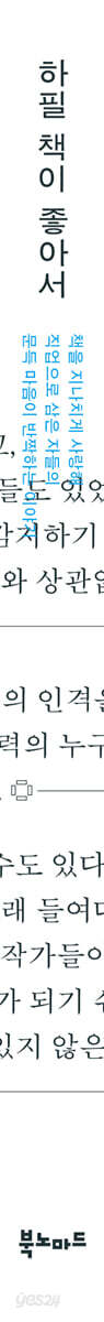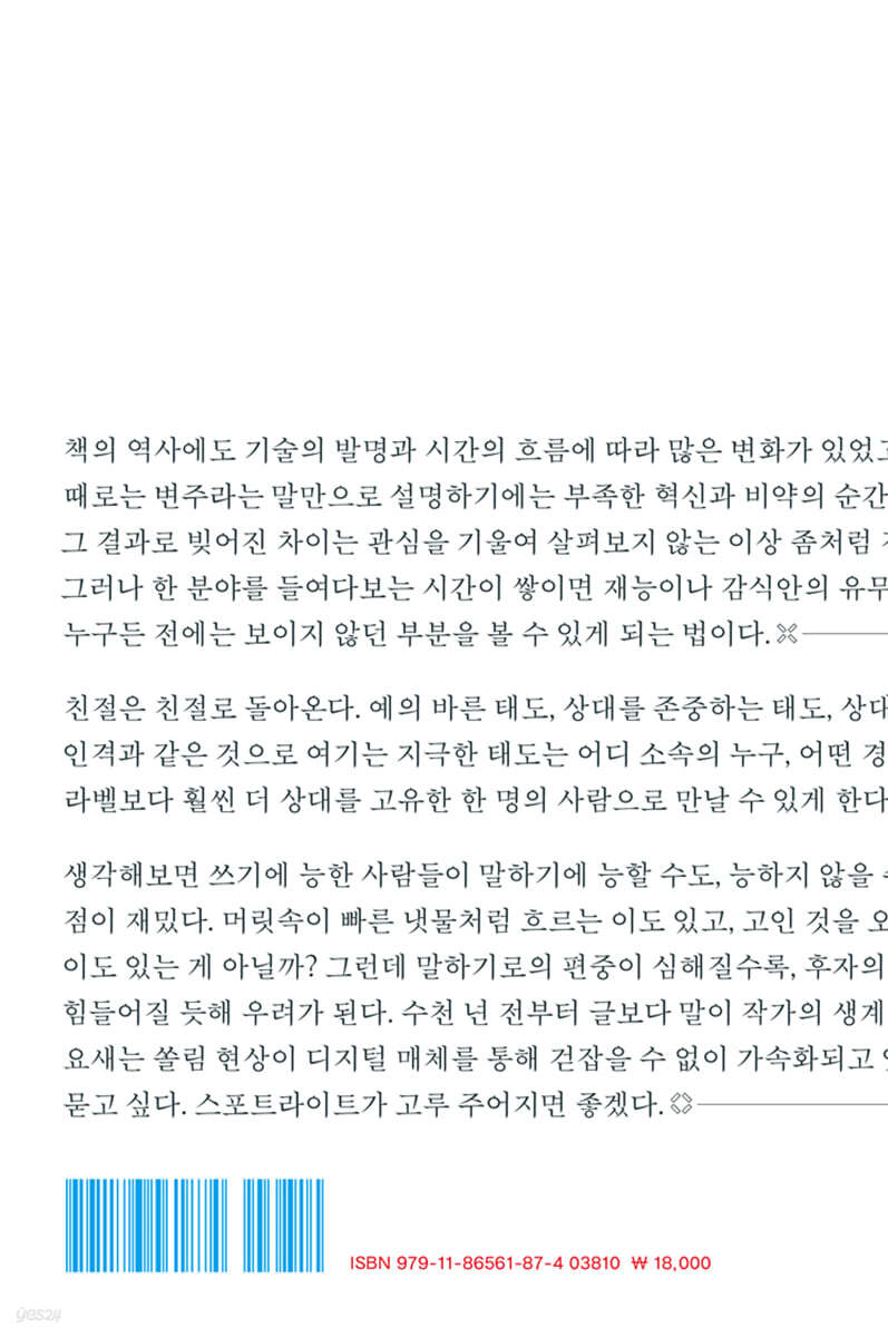 ---「정세랑, 추천사를 어쩌면 좋을까?」중에서 출판계가 어려워서 사람대우를 제대로 못해준다는 이야기는 반은 맞고 반은 틀린 것 같다. 출판계가 여유 없이 어려운 것은 맞으나 열의를 가진 사람들을 너무 예사로이 여기고 홀대하고 있는 것은 아닌지 물을 필요가 있다. 책을 사랑하는 사람들은 계속 출판계의 문을 두드리겠지만, 이대로라면 떠나는 속도 또한 빨라질지도 모른다. 마땅한 존중을 이야기할 때가 왔다 ---「정세랑, 출판계 밖에서 만나는 출판인들」중에서 어떤 서점들은 오래된 책, 잘 알려지지 않았지만 좋은 책, 재발견되어야 할 책들을 빛나는 자리에 두고 그럴 때 공간은 마치 한 사람의 내면세계 같아 재밌어진다. 목록과 배치의 차이가 그려내는 점묘화가 뚜렷한 개성을 자아내는 것이다. 누군가의 머릿속에 문을 열고 들어가는 경험은 서점에서 드물게 가능한 것 같다. ---「정세랑, 짧은 여행과 색깔이 강한 서점들」중에서 음악을 북디자인과 비슷하다고 느꼈던 것은 둘 다 오래전에 결정된 형식의 반복과 변주를 지속해왔다는 부분 때문이었다. 물론 책의 역사에도 기술의 발명과 시간의 흐름에 따라 많은 변화가 있었고, 때로는 변주라는 말만으로 설명하기에는 부족한 혁신과 비약의 순간들도 있었지만 그 결과로 빚어진 차이는 관심을 기울여 살펴보지 않는 이상 좀처럼 감지하기 힘들다. 그리고 이 점 또한 두 분야가 비슷하게 느껴졌다. 그러나 한 분야를 들여다보는 시간이 쌓이면 재능이나 감식안의 유무와 상관없이 누구든 전에는 보이지 않던 부분을 볼 수 있게 되는 법이다. ---「김동신, 취향의 방향을 가늠하기」중에서 책 표지라는 공간에는 글자만 있는 것이 아니다. 사진, 일러스트레이션, 색상 등 경중을 따질 수 없는 다른 요소들도 함께 존재하며, 이런 상황에서 글자의 역할이란 책의 전체적 인상을 구성하는 일부로서 녹아드는 것이 보다 일반적이다. 그렇기 때문에 만약 어떤 표지 디자인에 정렬의 축이 뚜렷이 드러난다면 그것은 다른 시각적 요소들의 중요도를 감소, 혹은 배제하면서까지 타이포그래피 중심의 디자인 콘셉트를 좇겠다는 디자이너의 의지가 있기에 생겨난 결과다. 나는 이런 자기주장을 하는 표지들과 그것을 가능케 하는 디테일들을 보는 것을 좋아한다. ---「김동신, 취향의 방향을 가늠하기」중에서 신체와 관련된 책의 세부 명칭 가운데 가장 절묘하다고 생각하는 것은 책등이다. 등에는 인체를 지탱하는 기둥인 척추가 있기 때문이다. 코덱스의 구조적 정수가 종이를 엮었다는 점인 만큼 엮인 부분들이 모여 만들어진 면을 등이라고 일컫는 것이 퍽 적절하게 들린다. 영어권에서는 직접적으로 spine이라고 부르는데, 실제로 노출 바인딩으로 제작한 책에서 표지를 입히지 않은 책등을 보면 종이 묶음을 실로 엮은 모습이 뼈마디와 닮아 보이기도 한다. ---「김동신, 코어에 힘주기, 책등 디자인」중에서 출판계와 디자인계는 각각 실무 노동자 많은 수를 여성이 차지하고 있는 여초 업계다. 그러나 관리자·임원급으로 가면 압도적으로 남성이 많고 여성은 실무자·사원으로서 ‘남성의 ‘하부구조’를 이루는 식의 성별에 따른 차별이 공고하다. 이러한 상황은 한국 사회에 분야를 불문하고 존재한다. 그중에는 애초부터 여성의 진입을 막아 여성의 수가 극히 적은 업계가 있는가 하면 출판계나 디자인계처럼 이른바 ‘여성적’인 노동으로서 여성의 유입이 많은 분야도 있다. 단, 그렇게 유입된 여성들이 올라갈 수 있는 한계는 뚜렷하다. 더 많은 권력을 지닌 보직, 특히 규모 있는 출판사의 소유자는 대체로 남성이다. ---「김동신, 북디자인과 여성」중에서 책표지는 자주 얼굴에 비유된다. 만약 이 얼굴에 성별이 있다면 그것은 여성일 것이다. 요즘 표지 디자인의 스타일이나 유행이 ‘여성적’이라는 게 아니다. 표지-얼굴이 처한 상황이 여성의 그것과 닮았다. 호감이 가야 하고, 항상 웃어야 하고, 예쁘면 가장 좋은, 손쉬운 평가의 대상이 되는 얼굴. 꾸미면 화장이 너무 진하다고 훈계를 듣고 때로는 얼굴보단 마음이 고운 게 진짜 예쁜 거라며 칭찬을 듣는 존재. 너무나 익숙한 말들이다. ---「김동신, 북디자인과 여성」중에서 나는 종종 ‘을(乙)이어야 한다’는 생각에서 자유롭지 못했다. 그것이 신입사원의 자세라고 여겼던 것이다. 주변으로부터 그런 이야기를 많이 듣기도 했다. 대학교 졸업을 앞두고 청강한 ‘취업 강의’에서 강사가, 막 입사한 곳에서 만난 상사가 너희는 을이어야 한다, 을이라고 생각하고 일해라, 라는 말을 했다. 하지만 그런 생각을 품은 시간이 계속될수록 나는 작가와의 관계에서도, 편집자와의 관계에서도, 마케터와의 관계에서도, 아니 그밖에 맺게 되는 모든 관계에서도 언제나 을이어야 하는 일이라는 게 정말이지 안타깝다고 생각했다. 역시 편집부로 입사했으면 더 좋았으려나. 아니, 을이라니? 그런 생각은 얼마나 후진가. ---「신연선, 출판사의 홍보기획부라는 애매한 위치」중에서 일터에서 친절은 가치의 문제이기도 하지만 분명한 업무 능력의 문제이기도 하다. 내가 일터에서 여러 번 자리를 바꾸어가며 오