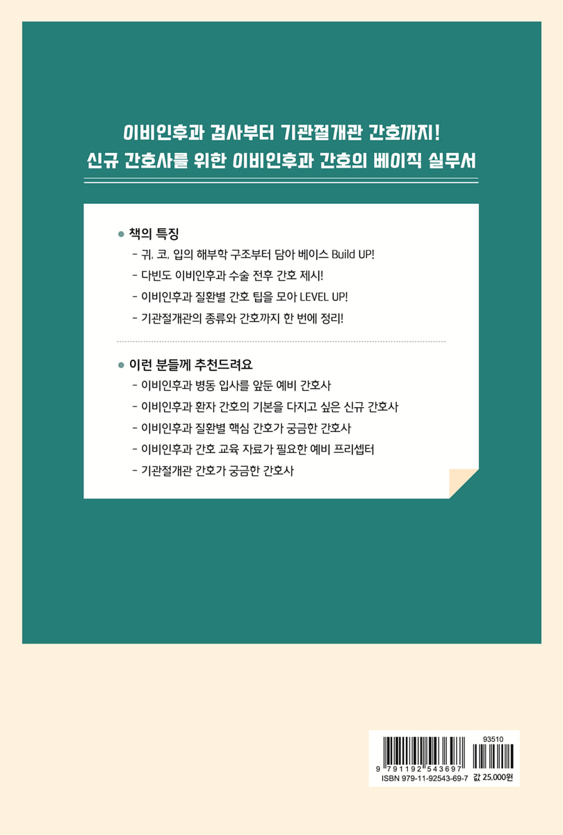 기존의 책들과 다르게 정말 실무에서 활용 가능한 내용이 많아 현재 임상에 있는 저도 자주 활용하며 도움을 받고 있는 책입니다. 사실 학생 때는 이비인후과 질환에 대해 깊게 공부할 기회가 적었는데 이 책이 곁에 있으면 좋은 시작을 함께할 수 있으리라고 생각합니다. 임상이 처음이라 두려움이 클 신규 간호사 선생님들을 응원합니다. - 한보경, 박소현 (인하대병원 이비인후과 병동 간호사)