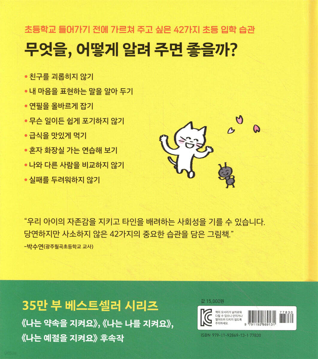 “이 책은 우리 아이가 사회에서 지켜야 할 규칙과 예절을 아이의 눈높이에 맞는 귀여운 그림체와 쉬운 문장으로 담아냈습니다. 1학년 학생들의 부모님들은 특히 자신의 아이에 대한 애정과 믿음이 강한 편입니다. 42가지의 규칙은 타인만을 위한 것이 아닌 우리 아이의 자아존중감과 자주성을 성장하는 데 큰 도움을 줍니다. 우리 아이의 자존감을 지키고 타인을 배려하는 사회성을 기를 수 있습니다. 당연하지만 사소하지 않은 42가지의 중요한 습관들을 담은 그림책입니다.” - 박수연 (광주월곡초등학교 교사)