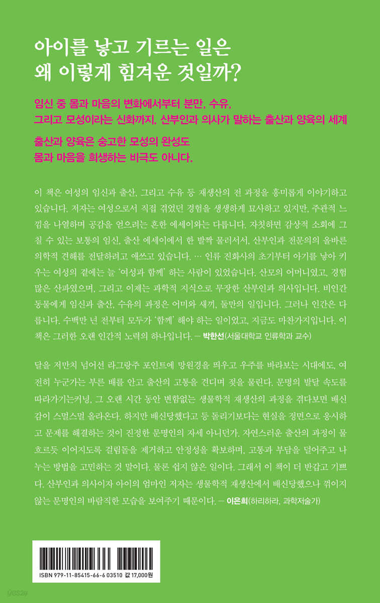 달을 저만치 넘어선 라그랑주 포인트에 망원경을 띄우고 우주를 바라보는 시대에도, 여전히 누군가는 부른 배를 안고 출산의 고통을 견디며 젖을 물린다. 문명의 발달 속도를 따라가기는커녕, 그 오랜 시간 동안 변함없는 생물학적 재생산의 과정을 겪다보면 배신 감이 스멀스멀 올라온다. 하지만 배신당했다고 등 돌리기보다는 현실을 정면으로 응시하고 문제를 해결하는 것이 진정한 문명인의 자세 아니던가. 자연스러운 출산의 과정이 물 흐르듯 이어지도록 걸림돌을 제거하고 안정성을 확보하며, 고통과 부담을 덜어주고 나누는 방법을 고민하는 것 말이다. 물론 쉽지 않은 일이다. 그래서 이 책이 더 반갑고 기쁘다. 산부인과 의사이자 아이의 엄마인 저자는 생물학적 재생산에서 배신당했으나 꺾이지 않는 문명인의 바람직한 모습을 보여주기 때문이다. - 이은희 (하리하라, 과학저술가)