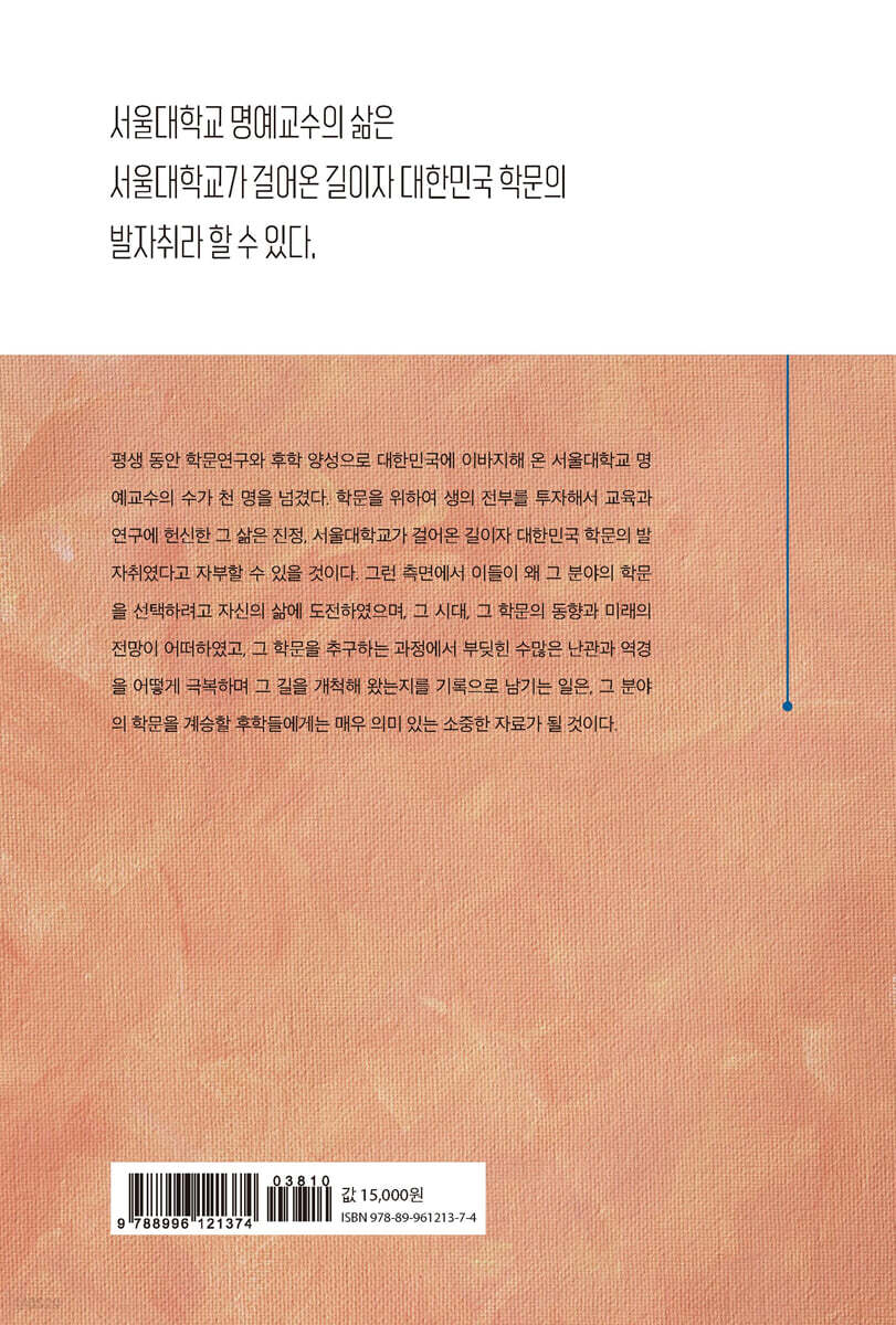 책머리에 김성곤 | 문화대사, 문화통역, 문화가교를 지향한 나의 학문과 삶 I. 정년퇴임 후 맺은 세 가지 학문적 결실 II. 내 학문적 여정의 시작 1. 부친에게서 배운 통역/번역의 중요성 2. 영문학을 전공하게 된 이유 3. 뉴욕주립대학교에서 만난 내 학문적 안내 성좌 레슬리 피들러 4. 컬럼비아대학교에서 만난 내 학문적 안내 성좌 에드워드 사이드 5. 미국에서 만난 포스트모던 시대의 작가들 III. 서울대학교에서의 내 학문과 삶 1. 포스트모더니즘 논의의 시작과 확산, 그리고 결실 2. 영화 속 문화읽기: 문학연구에서 문화연구(Cultural Studies)로 3. 서울대학교 본부 보직과 내 전공분야 IV. 서울대학교를 넘어서 전공분야의 확장 1. 출판인, 작가, 언론 칼럼을 통한 내 전공분야의 확대 2. 전공 분야 학회 회장 3. 문예지 편집위원: 『외국문학』, 『21세기문학』, 『문학사상』 V. 수상 및 학문과 삶의 확장 1. 문학상/학술상 수상과 ‘명예의 전당’ 2. 서울 국제문학 포럼/ 국제학술대회 조직 및 운영 3. 해외 대학에서 넓힌 내 학문과 삶 4. ‘한국 문학번역원’: 내 학문과 삶의 연장 VI. 나의 멘토 1. 내 학문과 삶을 이끌어 준 멘토: 서울대 이상옥 교수 2. 내 학문과 삶을 이끌어 준 멘토: 고려대 김우창 교수 3. 내 학문과 삶을 이끌어 준 멘토: 이화여대 고(故) 이어령 교수 4. 내 학문과 삶을 이끌어 준 멘토: 고(故) 채동배(Don Chae) 텍사스 판사 5. The Korea Herald 칼럼니스트: 동서양을 연결하는 문화대사/문화통역/문화가교의 역할 VII. 포스트모더니스트의 회의와 모더니스트로의 회귀 VIII. 내가 걸어온 길: ‘자유로운 영혼’과 ‘정신적 방랑’ IX. 서울대학교: 나의 학문과 삶의 영원한 고향 최덕근 | 삼엽충이 알려 준 한반도 땅의 역사 I. 머리말 II. 성장과정 1. 어린 시절 2. 대학 시절 3. 대학원 시절 4. 미국 유학 시절 III. 지질학자로의 활동 1. 한국동력자원연구소에서 연구 시작 2. 서울대학교에 부임 3. 삼엽충을 만나다 4. 영월은 삼엽충 화석의 보고 5. 삼엽충 연구를 도와준 사람들 6. 연구 영역의 확대 7. 새로운 강좌 개발 8. 5억 년 전, 태백산분지는 얕은 바다였다 9. 캄브리아기에 태백산분지와 히말라야 산맥이 연결? 10. 7억 년 전, 눈덩이지구 빙하시대 11. 태백산분지의 역사를 편찬하다 IV. 대중을 위한 강연과 교양서적 출간 V. 맺음말 이돈구 | 나의 학문, 산림과학 그리고 나의 삶, 나의 희망 I. 나의 학문 1. 임학(林學; 산림과학)을 공부하게 된 시작점을 돌이켜 보다 2. 산림과학을 더 깊게 공부하다: 서울대학교 대학원 석사과정(1969~1971)과 조교 시절(1971. 1.~1973. 5.) 3. 내 산림과학 전공을 세계로 넓혀 배우고 익히다: 미국 대학원 유학 시절(1973. 5. ~ 1979. 5.) 4. 우리나라로 돌아와 산림과학을 연구, 교육하다 5. 산림과학의 연구와 교육을 산림정책에 접목하다 II. 나의 삶, 나의 희망 1. 출생, 배경 및 어린 시절(1946~1952) 2. 초등학교, 중학교, 고등학교 시절(1953~1964) 3. 수상과 명예박사 학위 III. 마무리, 숲 운동, 신앙생활 그리고 감사 한무영 | 빗물박사의 삶과 학문 I. 들어가며 II. 나의 삶 1. 학창 시절 2. 직장 시절 3. 학문의 길 4. 가족관계 III. 나의 학문: 기존의 이론을 탈피하는 여정 1. 기존의 벽을 뛰어넘기: 응집의 이론을 깨다 2. 빗물에 대한 편견 깨기 여정 3. 모범사례 만들어 증명하기 4. 빗물관리의 이론 정립 5. 빗물의 동조자를 찾는 여정 6. 공동체단위의 빗물식수화 시설(CBRD: Community-Based Rainwater for Drinking) 7. 사회적 인정을 받기 8. 태극이론에 근거한 미세기포 기술 9. 빗물박사, 똥박사 되다 IV. 빗물박사의 탈피는 현재 진행형 1. 물관리 철학 2. 물과 문화 3. 기후위기의 해법은 빗물관리로부터 4. 물관리는 우리나라가 세계 최고 V. 나가며 안윤옥 | 학문역정과 삶을 회고하면서 I. 나의 학문역정(歷程) 1. 19세에 지우학이어라(十九而志于學) 2. 25~33세에 전공분야 목표를 세우다(二十五 三十三而立) 3. 48세에 불혹(不惑)이라 4. 58세에 지천명(知天命) 경지에 이르다 5. 인과성에 대한 과학적 추론, 논증 방법들 6. 역학에서의 인과성 추론/논증 기준들 II. 나의 삶: 진위판단과 가치판단, 그리고 생활양식 1. 삶의 목적과 생활양식 2. 인간 삶의 내용: 판단과 선택 3. 진위(眞僞, authenticity)판단과 가치(價値)판단 4. 필자 나름의 바람직한 삶, 생활양식에 관한 지침을 세우다 III. 의학자 및 전문가로서의 나의 삶 1. 의학자로서의 삶 2. 전문가로서의 사회봉사, 공익(公益)활동 IV. 일상생활에서의 나의 삶 V. 동양경전(經典), 과학연구 결과에서 나오는 바람직한 생활양식, 덕목(德目, , Virtues) 호문혁 | 생즉시학 학즉시생(生卽是學 學卽是生): 점묘(點描) I. 프롤로그: 무너진 공학도의 꿈, 그리고 방황 II. 법학도의 길 1. 유기천 선생님과 형사모의재판 2. 민사소송법과의 인연 3. 시련 속의 석사과정 4. 지뢰복(地雷復) III. 법학자의 첫 걸음 1. 서울법대 조교 2. 영남대학교 3. 유학 준비 IV. 독일 유학 1. 만하임 2. 프라이부르크 3. 훔볼트 여행 4. 박사과정 5. 아데나워 세미나 6. 학회 참석 7. 아렌스 선생님 8. 동베를린의 인상 9. 박사논문 집필 V. 서울대학교 법과대학 1. 영남대학교와의 작별 2. 서울법대 신임 교수 3. 초기의 학술활동 4. 지록위마(指鹿爲馬) 5. 학