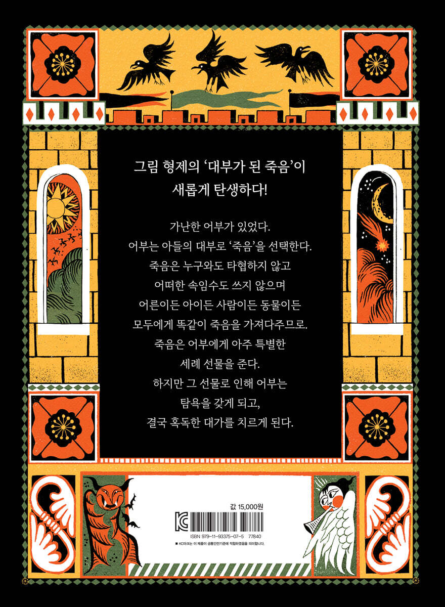 태어난 아들에게 세례 선물조차 줄 수 없는 가난한 어부가 있었다. 어부는 아이에게 대부만큼은 제대로 구해 주고 싶어 길을 떠난다. 어부는 처음에 하느님을 만난다. 하느님은 자신이야말로 대부로 딱이라고 외치지만, 어부는 거절한다. 어떤 이는 가난하고, 어떤 이는 부자로 사는 불공평한 현실을 만든 이가 바로 하느님이기 때문이다. 다음으로 어부는 무엇이든 다 주겠다며 달콤하게 유혹하는 악마를 만나지만 역시 거절한다. 이 세상에서 존재했던 이들 가운데 가장 교활하고 악명 높은 악마를 대부로 삼을 정도로 멍청이는 아니기 때문이다. 그리고 마침내 무시무시한 ‘죽음, 데스’를 만난다. 데스는 온몸이 덜덜 떨릴 정도로 두려운 존재이지만 누구에게든 공평하게 죽음을 전하고, 타협하지도 않는, 유일하게 정직한 존재였다. 결국 어부는 데스를 선택한다. 이 선택이 어떤 결과를 가져올지 전혀 모른 채 말이다. 목숨이 위험한 순간, 또 한 번의 선택 데스의 세례 선물 덕분에 어부는 금방 유명해지고 부유해지지만 왕이 아프자 모든 상황이 달라진다. 왕을 살리지 못하면 자신이 죽게 될 절체절명의 순간, 과연 어떤 선택을 할 것인가. 아이들은 ‘내가 어부라면 어떤 선택을 할지’ 고민하게 될 것이다. 데스와의 약속을 지키고 죽음을 맞이할 것인가 아니면 어부처럼 데스를 속일 것인가. 쉽지 않은 선택이지만, 선택에 따른 책임은 각자의 몫이다. 결국 이야기 속 어부처럼 아이들 역시 죽음을 속일 수 없다는 사실을 알게 될 것이다. 그리고 이야기가 끝나면 약속의 소중함과 선택의 무거움, 욕심에 대한 경계심의 교훈을 절로 깨닫게 될 것이다. 걸작으로 재탄생된 그림 형제의 ‘대부가 된 죽음’ 그림 형제의 옛이야기 중에서 ‘대부가 된 죽음’은 꾸준히 애니메이션으로 변하거나 다른 이야기로 재탄생되어 왔다. 그만큼 재미있는 요소들이 많다는 반증일 것이다. 글 작가 샐리 니콜스는 이야기의 뼈대를 가져오면서도, 뼈밖에 없는 데스가 음식을 먹는다거나 왈츠를 추는 등 특유의 유머를 잊지 않았다. 원작과 달리 아버지를 주인공으로 하면서 결말의 비극을 극대화시킨 것도 매력적이다. 또 그림 작가 줄리아 사르다는 색다른 분위기를 한껏 자아내고 있다. 판화를 연상시키는 그림과 곳곳에 자리한 아이콘들은 그림 보는 재미를 준다. 두 작가의 콜라보가 또 하나의 걸작을 완성시켰다. 아이들은 물론 어른들의 마음도 단숨에 사로잡을 작품임이 틀림없다. |