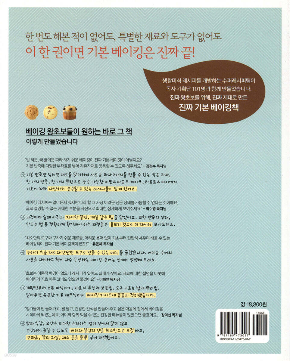 이제 베이킹도 [진짜 기본 베이킹책]으로 마스터하세요!” [진짜 기본 베이킹책]은 한 번도 베이킹을 해본 적이 없는 베이킹 왕초보들을 위한 기본서입니다. 베스트셀러인 1탄 [진짜 기본 요리책]과 마찬가지로, 이 책 역시 베이킹 왕초보들의 눈높이에 딱 맞추기 위해 독자 기획단 101명을 선정, 그들의 의견을 적극 반영해 요리잡지[수퍼레시피]가 심혈을 기울여 만들었습니다. 눈으로만 감상하기보다 실제로 많이 만들게 되는 활용도 높은 레시피, 우리 집 부엌 사정에 딱 맞춘 쉬운 재료와 간단한 도구로 만드는 현실적인 레시피, 버터와 설탕 양을 최소화하고 견과류, 말린 과일, 채소, 과일 등을 듬뿍 넣은 건강한 레시피 등 왕초보들이 진정으로 원하는 메뉴들을 고르고 골랐습니다. 모든 레시피는 누구나 그대로 따라 하면 성공할 수 있도록 철저한 검증 절차를 거쳤고, 독자 교정작업도 진행했습니다. 왜 실패했는지 이유조차 모르는 베이킹 왕초보들을 위한 자세하고 친절한 설명, 미리 짚어주는 실수 예상 포인트, 마치 동영상을 보는 것처럼 상세한 과정 컷과 돋보기 컷 등도 철저히 보강했습니다. 또한 재료 보관법과 도구 관리법, 오븐 파악하는 법, 재료별 특성과 조리 원리, 알아두면 유용한 테크닉 등 왕초보들이 특히 궁금해 하는 베이킹 이론도 폭넓게 실어 기본 실력을 키울 수 있도록 했습니다. 요리 입문서 중 최고의 베스트셀러인 [진짜 기본 요리책]으로 기본 가정 요리를 마스터했다면, 이제 [진짜 기본 베이킹책]으로 홈 베이킹에도 도전해보세요! 그대로 따라만 한다면 절대 어렵지 않습니다. 오히려 쉽게 잘 만들어져서 깜짝 놀랄 것입니다. 레시피팩토리의 모든 요리책들과 마찬가지로 이 책 역시 레시피 A/S를 철저히 해드립니다. 이해가 되지 않는 설명이나, 따라 하다가 궁금한 점이 있다면 언제든 [수퍼레시피]애독자 온라인 카페(cafe.naver.com/superecipe) Q/A게시판에 문의하십시오. 이 책에 실린 레시피를 개발하고 검증한 [수퍼레시피] 테스트쿡들이 친절한 답변을 통해, 모든 물음표를 싹 없애드릴 것입니다. [진짜 기본 베이킹책]만의 7가지 특징 1. ‘진짜 기본’이 되는 베이킹책을 만들기 위해 [수퍼레시피] 독자 기획단 101명을 선발해 구하기 쉬운 재료, 간단한 도구로 만들 수 있는 기본 메뉴를 고르고 기획했습니다. 2. 더 이상 더할 것도, 뺄 것도 없습니다! 작은 과자, 머핀, 파운드 케이크, 타르트, 파이, 케이크, 빵까지 총 111개의 기본 레시피를 꼼꼼하게 실었습니다. 3. 오늘 처음 베이킹을 시작하는 왕초보도 따라 하면 성공할 수 있도록 수 차례 테스트해 분량, 온도, 시간까지 정확히 제시했습니다. 4. 기본 반죽만 익히면 재료, 필링, 토핑 등을 달리하여 다양하게 응용할 수 있는 방법을 알려드립니다. 5. 베이킹에서 가장 중요한 계량부터 오븐 파악하기, 기본 테크닉까지 알아두면 유용한 정보들을 꼼꼼히 정리했습니다. 6. 왕초보들이 잘못하기 쉬운 포인트를 돋보기 컷으로 자세히 알려주고, 실수 방지 팁을 깨알같이 실었습니다. 7. 재료의 특성과 보관법, 도구 고르는 법과 관리법까지 왕초보들이 궁금해 하는 정보들을 총망라했습니다. |