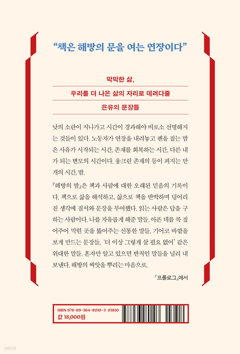 존재를 회복하는 시간, 다른 자아가 되는 변모의 시간이다“ 『해방의 밤』은 관계와 사랑, 상처와 죽음, 편견과 불평등, 배움과 아이들 등 다양한 범주의 주제를 종횡무진하지만 이 모두를 관통하는 키워드는 해방이다. 저자는 책이 해방의 문을 여는 연장이라 말한다. 읽는 사람이 된다는 것은 고정된 생각과 편견을 하나씩 깨뜨리며 자유로워지는 길이기 때문이다. 깨달음으로 인해 혼란과 갈등이 불거지기도 하지만, 한번 해방된 사람은 무지와 무감각의 시절로 돌아갈 수 없다. ‘해방의 독서’는 그로 하여금 우리 삶 곳곳에 억압과 통제가 있음을, 타자의 해방과 자신의 해방이 긴밀하게 연결되어 있음을 일깨웠고, 모두의 자유로움을 위한 독서와 배움으로 그를 이끌었다. 왜 ‘밤’인가. 낮의 소란이 지나가고 시간이 경과해야 비로소 선명해지는 것들이 있다. 초보 워킹맘 은유는 고단한 낮의 일과가 저문 밤의 고요를 틈타 식탁을 책상 삼아 독서를 했다. 그 밤에 저자는 육아서나 자기계발서처럼 낮의 목표를 달성하기 위한 독서가 아니라 ‘쓸모없는’ 책들을 읽었고, 그 시간 동안은 ‘누구 엄마’가 아닌 자신의 이름으로 불리는 고유한 존재이자 익명의 존재가 될 수 있었다. 낮의 노동을 내려놓고 책을 집어드는 밤은, 사유가 시작되는 시간, 존재를 회복하는 시간, 다른 자아가 되는 변모의 시간이 되어주었다. ”사는 게 여러 갈래라는 걸 아는 게 해방이다.“ 우리를 더 나은 삶의 자리로 안내할 은유의 문장들 초보 워킹맘 시절 유아차를 끌고 도서관에 다니던 저자는 이제 대출인보다 강연자로 더 자주 도서관을 출입한다. 열람실에서 책을 보는 사람들을 흘끔거리며 저기가 내 자리인데, 생각하지만 강당의 맨 앞 한가운데로 인도된다. 그가 책기둥 사이에서 던지던 질문을 이제 독자들이 그에게 묻는다. 어떻게 살아야 할까요. 무엇이 좋은 삶일까요. 우린 어디서 와서 어디로 가는 걸까요. 커다란 질문들 앞에서 다시 막막해질 때면 그는 다시 책장을 뒤적거렸다. 이 책은 질문을 던져준 독자, 동료, 친구에게 보내는 은유의 늦은 답장이기도 하다. 젖먹이를 데리고 글쓰기 수업에 참여한 학인의 “이렇게까지 해야 하나 싶다”는 푸념에 캐럴라인 냅의 『욕구들』을 권하며 “이렇게까지 해야 하나 싶을 때는 이렇게까지 해야 합니다”라며 단호한 응원을 전하고, 지독한 슬럼프를 겪었다는 도반에게는 “그게 어떤 건지, 내가 안다 / 남들과 발맞출 수 없다는 것”이라는 라이너 쿤체의 시구를 인용하며 위로를 전한다. 그외에도 울프, 톨스토이, 에르노 등 주옥같은 작가들의 작품들이 저자 특유의 사려 깊고 마음을 울리는 문장으로 전달된다. 저자는 이토록 깊은 애정을 드러내면서도 책을 물신화하거나 신앙화하지는 않는다. 한때는 독서가 무조건 삶을 이롭게 하지 않을 수도 있다는 경각심이 들어 책에 대한 사랑을 잠시 유보하기도 했다는 저자는 삶 속에서 책과 함께, 또 책에 맞서 싸워온 과정도 고스란히 드러낸다. 『반사회적 가족』을 교본 삼아 자녀들에게 “가족 바깥을 향해 몸을 틀어”보겠다며 자취를 선언하고, 리베카 솔닛을 읽으며 그도 기혼 유자녀 여성이었다면 집안과 밥상에서 전투했을까 한탄하는 대목 등에서 책을 삶으로 논파하며 자신만의 언어를 만들어간 과정을 엿볼 수 있다 『해방의 밤』은 한 사람이 읽은 책들에 대한 글이지만 독후감 모음은 아니다. 이 책에 언급되는 책들은 필독서 목록과는 거리가 멀다. 서가에서 우연히 마주친 책, 도무지 이해할 수 없었던 책, 배를 불려주지도 않고 스펙이 되지도 않는 책, 온종일 쓸모 있어야 한다는 압박이 가득한 사회에서 도통 무용해 보이는 책들. 하지만 그런 책들만이 거칠고 메마른 일상에서 한 사람을 구원하고 살리기도 한다는 것을 말한다. 지식 축적을 위한 독서가 아니라 삶의 문제를 풀어가는 실천적 읽기라고도 말할 수 있겠다. 어떻게 살아야 할까, 종종 갑갑해지는 이들에게 『해방의 밤』을 권한다. “한 사람을 살려둔 책들의 목록과 이야기가 담긴 ‘독서의 보물지도’를 여러분 생의 윗목에 두고 갑니다. 나를 살린 책들이라면 남도 살릴 수 있으리라는 간곡한 마음으로요.”(359면) |