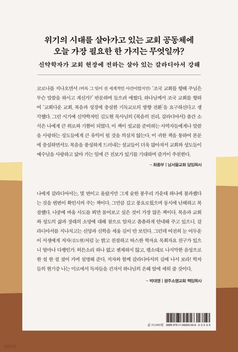 나에게 갈라디아서는, 몇 번이고 올랐지만 그게 숱한 봉우리 가운데 하나에 불과했다는 것을 번번이 확인시켜 주는 책이다. 그만큼 깊고 풍요로웠으며 동시에 난해하고 복잡했다. 나중에 바울 사도를 뵈면 물어보고 싶은 것이 가장 많은 책이다. 복음과 교회와 성도의 삶과 장래의 소망에 대해 참으로 알차고 촘촘하게 안내해 주고 있으니, 갈라디아서를 지나치고는 신앙과 신학을 세울 길이 안 보인다. 그런데 여전히 눈 어두운 이 서생에게 저자(김도현)처럼 눈 밝고 친절하고 따스한 학자요 목회자요 친구가 있으니 얼마나 다행인가. 허튼소리 하나 없고 젠체하지 않고, 평소대로 나지막한 음성으로 한 절 한 절 짚어 가며 설명해 준다. 저자와 함께 갈라디아서의 길에 나서 보라! 학자들의 현기증 나는 미로에서 독자들을 건져서 하나님의 은혜 앞에 세워 줄 것이다. - 박대영 (광주소명교회 책임목사)