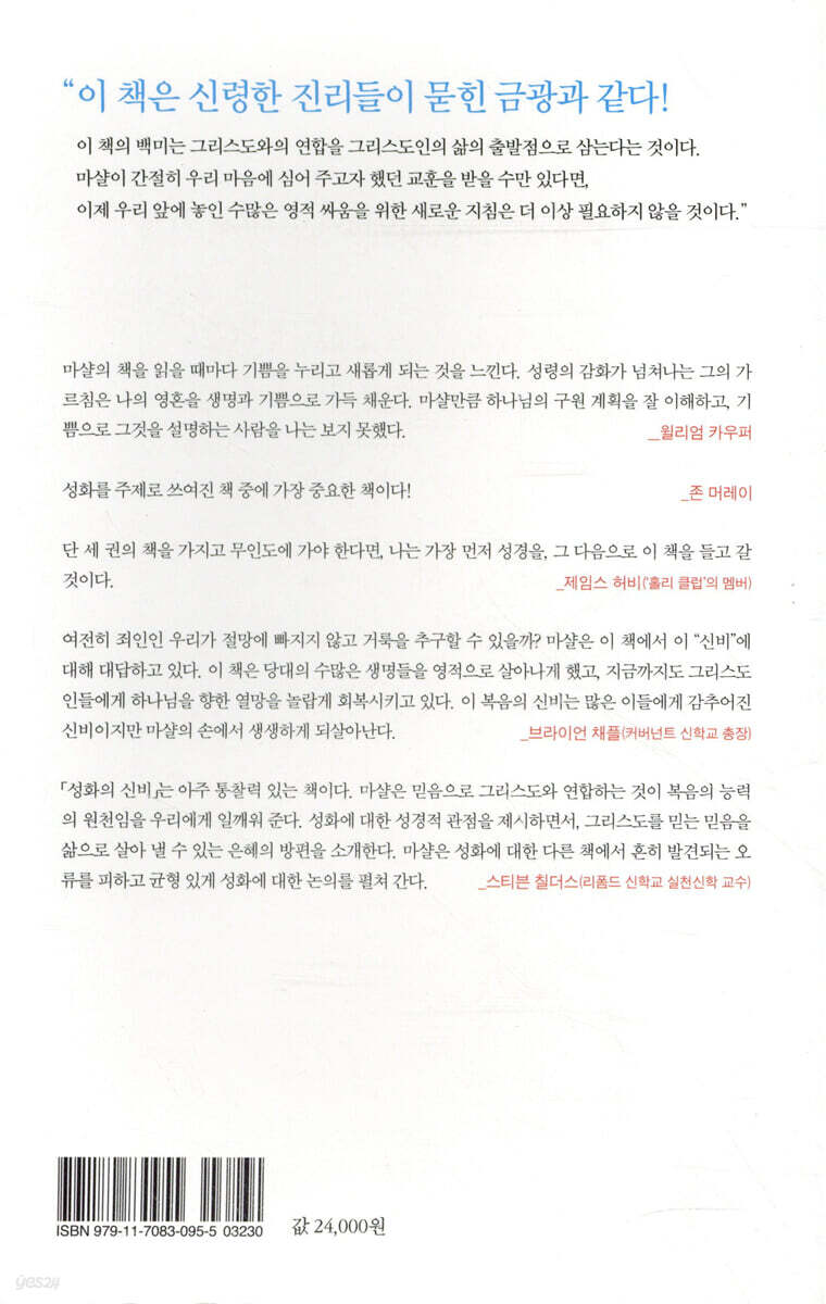 여전히 죄인인 우리가 절망에 빠지지 않고 거룩을 추구할 수 있을까? 마샬은 이 책에서 이 “신비”에 대해 대답하고 있다. 이 책은 당대의 수많은 생명들을 영적으로 살아나게 했고, 지금까지도 그리스도인들에게 하나님을 향한 열망을 놀랍게 회복시키고 있다. 이 복음의 신비는 많은 이들에게 감추어진 신비이지만 마샬의 손에서 생생하게 되살아난다. - 브라이언 채플 (커버넌트 신학교 총장)