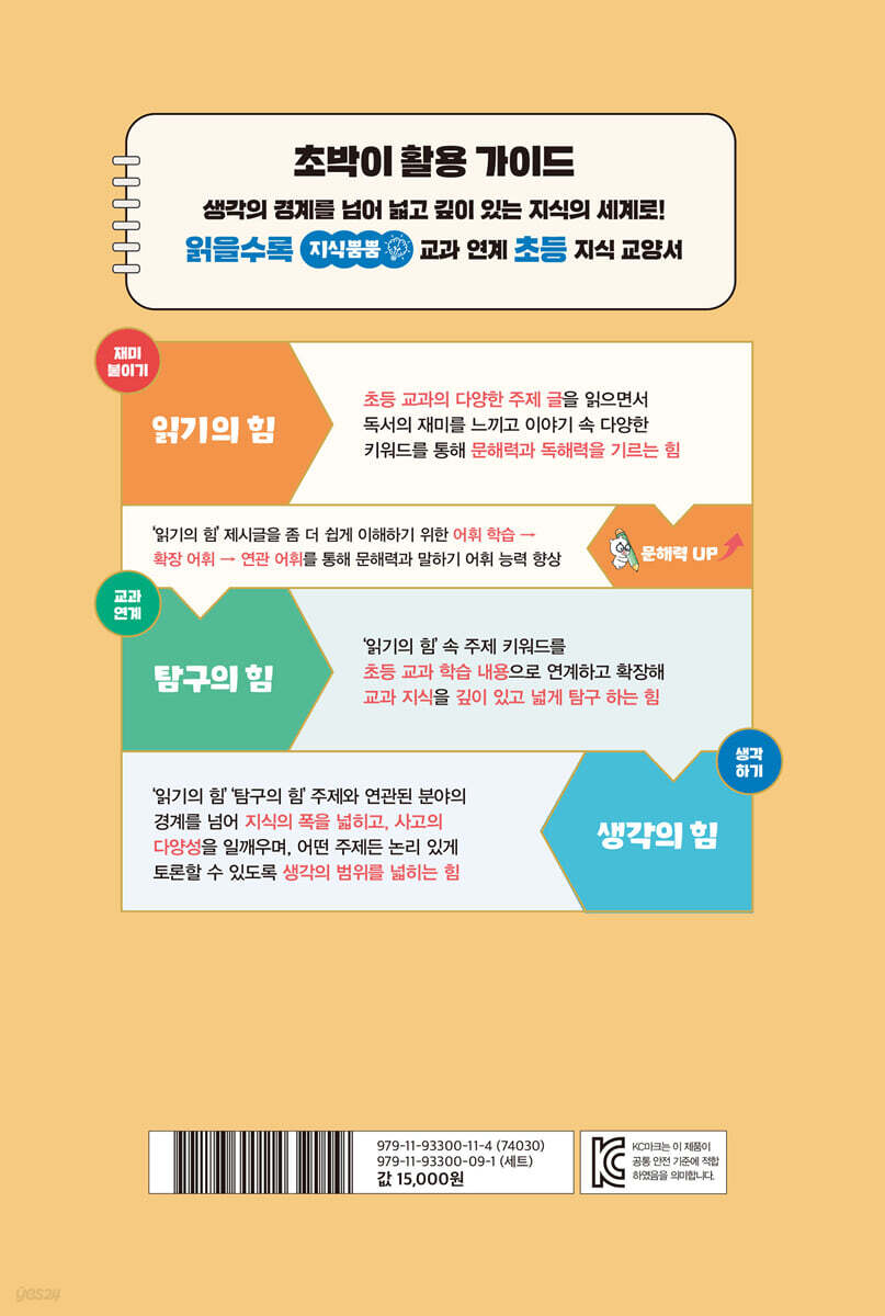 ★ 어린이 독서력,문해력 향상 및 교과 연계 학습까지 ★ 30년간 누적 판매 약 3억부 『좋은생각』에서 만든 박학다식해 지식 교양서 지식의 씨앗을 뿌려주는 “읽기의 힘” “조선 시대에 의적이 있었다고?” “경복궁에 가면 정도전의 업적을 알 수 있다고?”와 같은 역사적 호기심이 가득한 질문부터 어린이들에게는 생소하지만 역사적으로 중요한 진주만 이야기, 초등학생 눈높이에 맞춰 설명해 주는 6.25 이야기 등 초등 교과과정에서 다루는 정보를 재미있는 이야기들로 구성하였습니다. 더불어 깨알 상식과 깊고 넓은 배경지식이 풍부하게 한데 어우러지며 ‘읽기 재미’를 알려줍니다. 교과 학습도 놓치지 않는 “탐구의 힘” [읽기의 힘]을 통해 독서의 재미와 습관을 붙였다면 [탐구의 힘]은 교과 학습을 좀 더 잘 이해할 수 있도록 교과 과정과 연계된 기초 개념을 이야기와 덧붙여 설명해 줍니다. 이를 통해 아이들은 학교 수업 과정이 그저 어렵고 지루한 것이 아님을 스스로 깨닫게 됩니다. 아이들에게 학습에 보다 깊은 흥미를 갖게 하는 것이죠. 2.8 독립 선언과 연관하여 3.1 운동의 개념을 알려주고, 우리 역사상 유일하게 여왕이 존재했던 신라를 통해 신분제에 대해 알기 쉽게 설명하고 있습니다. 읽기에서부터 시작된 지식은 탐구 학습으로 이어지게 됩니다. 그런데 읽기와 탐구를 하기도 전에 어려운 교과 개념 어휘를 마주한다면 어떨까요? 대부분 한자어로 이루어진 교과 개념 어휘는 아이들이 학습에 흥미를 잃게 하는 큰 요소 중 하나입니다. 따라서 읽기와 탐구 과정에서 꼭 익혀야 할 교과 개념 어휘는 무엇보다 중요합니다. 『초등학생을 위한 박학다식 이야기』에서는 아이들에게 어렵게만 느껴지는 교과 개념 어휘를 놓치지 않고 챙길 수 있도록 [문해력 up]을 통해 한 번 더 정리해 줍니다. 이를 통해 교과서에 나오는 재미없고 어려워 보이는 단어도 쉽게 문맥을 통해 파악하고, 핵심 어휘는 다시 한 번 정리해서 머릿속에 쏙쏙 집어넣을 수 있도록 도와줍니다. 깊이 있는 지식이 깊이 있는 사고를! “생각의 힘” 재미있는 이야기를 통해 지식과 상식은 물론 교과 과정까지 한 번에 잡는 이 시리즈는 마지막 “생각의 힘” 코너를 통해 아이들이 스스로 생각하고 깊이 있는 질문을 할 수 있도록 확장된 지식을 알려줍니다. 아이들은 이 코너를 통해 단순히 재미있는 이야기를 읽거나 교과 학습만을 하는 것이 아니라 우리 주변을 이루고 있는 다양한 것들에 대해 스스로 호기심을 갖고 질문하며 세상과 사회, 역사를 이해하게 됩니다. 이 책을 통해 더 깊은 질문에 대해 생각하는 연습을 하다 보면 우리 아이들은 자기도 모르는 사이 스스로 질문하고, 생각하고, 답을 찾아내는 과정을 반복하며 ‘생각하는 뇌’를 쑥쑥 길러낼 것입니다. |