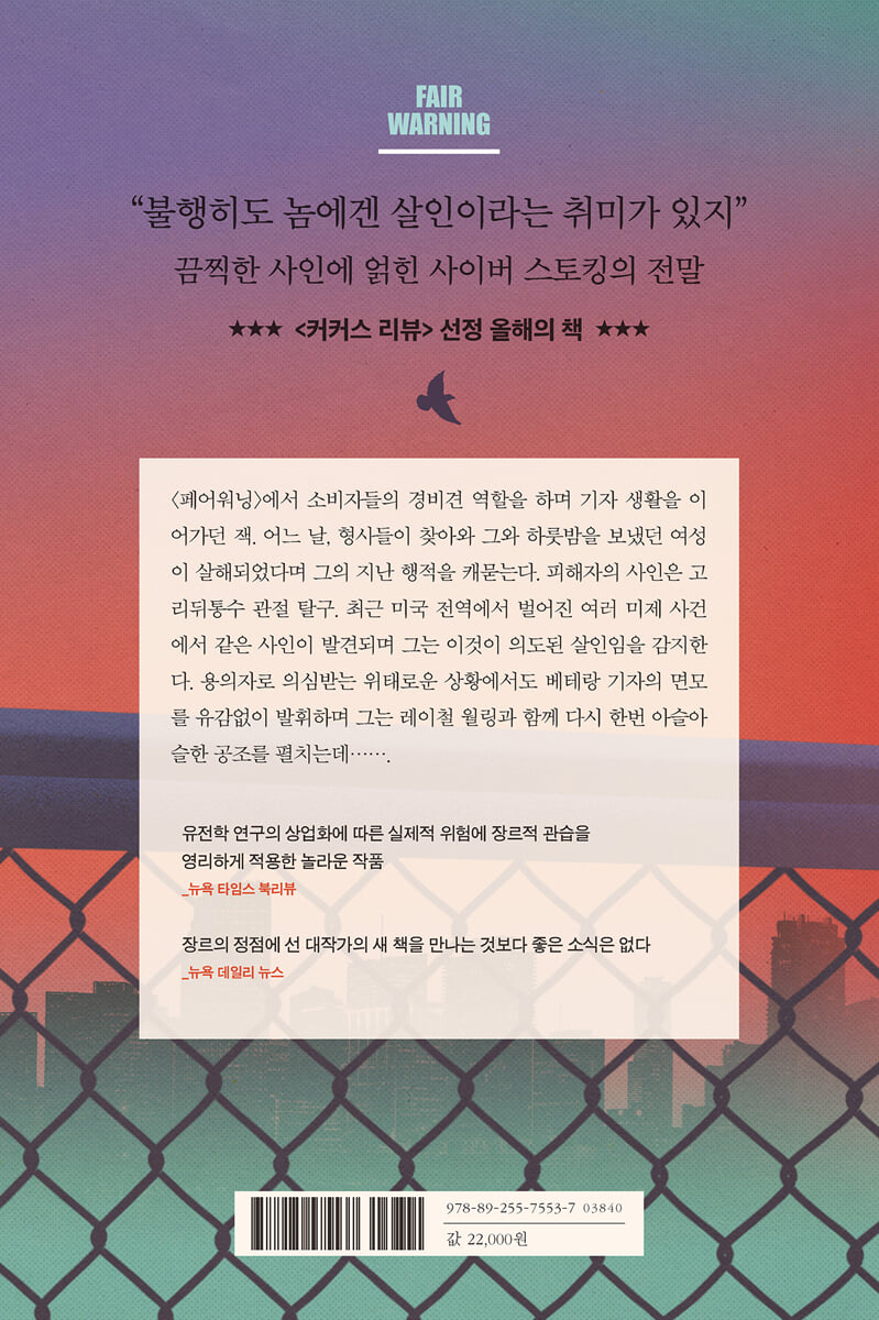 --- p.50 말로리가 죽고 3주 뒤에 올라온 메시지가 내 시선을 끌었다. 아무렇지 않게 스크롤을 내리던 나는 우뚝 멈추고 말았다. 에드 예거스라는 사람이 말로리를 자신의 육촌이라며, 이제 막 그녀를 알아가던 와중에 그녀를 빼앗겼다며 슬퍼했다. 그는 “이제야 널 알아가고 있었는데. 시간이 좀 더 있었으면 했어. 가족을 찾고 같은 달에 그 가족을 잃는다니 무척 슬프다.”라고 했다. 샬럿 타가트의 부고에서 볼 수 있을 만한 감정이었다. 오늘날, 요즘 시대에 가족을 찾는다는 건 보통 DNA가 관련돼 있다는 뜻이다. 세상에는 온라인 데이터를 활용해 가족 관계를 찾아주는 혈통 분석 회사들도 있었지만 DNA가 지름길이었다. 이제 나는 샬럿 타가트와 말로리 예이츠가 둘 다 DNA 유전자 분석을 통해 혈연을 찾고 있었다고 확신했다. 크리스티나 포트레로도 그랬다. 이런 우연은 세 여자에게로 확장됐고, 네 여자 모두에게 해당할지도 몰랐다. --- p.84 “뭐, 우리가 기억해야 하는 것 한 가지는 윌리엄 오턴이 수상쩍은 인물이긴 해도 잭이 쫓고 있는 사건이 오턴에게 이르지는 못했다는 점이에요. 아직은요.” 에밀리가 말했다. “더 취재해 봐야겠지만 현재 상태를 보자고요. 우리가 아는 네 명의 피해자는 GT23의 참여자였어요. 피해자들의 DNA가 오턴의 연구소에 연구 목적으로 판매됐을 가능성은 존재하지만 아직 그 가능성이 증명되지는 않았어요. 여기에 오턴이 성범죄자로 보인다는 점을 더하면 모든 게 더 재미있어지죠. 하지만 이런 사실을 서로 연결하는 구체적인 요소가 없어요.” “바로 그거야.” 마이런이 말했다. “더 강한 연결 고리가 나타나지 않는 한 이걸 얼마나 끌고 갈 수 있을지 모르겠어.” 마이런이 나를 쳐다봤다. 나는 그걸 좋은 징조로 받아들였다. 이건 지금도 내 기사였고, 마이런은 내 의견을 듣고 싶어 했다. “제 생각엔 이게 그물 던지기의 일환입니다.” 내가 말했다. “뭐가 걸려 올라오는지 봐야죠. 제 생각에, 우리가 해야 할 일은 오렌지 나노 내부에 들어가 오턴과 이야기하는 거예요. 직접 만나서 감을 잡아보는 거죠. 하지만 어떻게 그럴 수 있는지는 모르겠군요. 그냥 전화를 걸어서 네 여자의 살인사건을 들여다보고 있다고 말하면 안 될 것 같은데. --- p.184 “때까치는 새예요.” 에밀리가 말했다. “제 아버지가 새 사냥꾼이었어요. 아버지가 때까치 얘기를 했던 게 기억나요.” 레이철이 고개를 끄덕였다. “저도 찾아봤어요.” 레이철이 말했다. “때까치는 조용히 다가가 등 뒤에서 공격한다는군요. 희생양의 목을 부리로 꽉 물고 악랄하게 끊어 버린대요. 자연계에서 가장 강한 포식자 중 하나로 여겨져요.” “여자들 모두 목이 부러졌었지.” 마이런이 말했다. --- p.296 “이자는 오늘만 두 사람을 죽였어. 자기 자취를 감추느라고. 놈은 이미 뭔가 벌어졌다는 걸, 사람들이 자기를 쫓고 있다는 걸 알고 있어.” “하지만 FBI가 쫓는다는 건 모르잖아, 잭.” “잘 들어. 마이런이랑 에밀리한테 얘기해보긴 할게. 하지만 난 기사를 내자는 쪽에 한 표야. 이놈이 돌아다니고 있다는 걸 세상에 알려야 해. 이놈이 하는 짓과 피해자들이 어떻게 신분 노출과 스토킹을 당했는지도.” “그리고 당신 특종을 빼앗기는 일도 없어야겠지.” “저기, 부정하진 않을게. 난 기자고 이건 내 기사야. 맞아, 내가 가장 먼저 기사를 내고 싶은 건 확실해. 하지만 FBI와 LA 경찰이 모두 이 사건에 대해 알게 된 지금, FBI 내의 웬 개자식이 자기가 움직이고 싶은 기자에게 정보를 흘리는 건 시간문제야. 그것만 생각해도 난 기사를 내고 싶어져. 하지만 더 중요한 이유는 저 밖에서 벌어지는 아주 위험한 일에 대해 대중에게 경고하는 거야.” --- p.330~331 대체로 저널리즘이란 그저 대중의 관심을 끄는 상황과 사건에 관해 보도하는 행위다. 저널리즘이 부패한 정치인을 거꾸러뜨리거나 법을 바꾸거나 강간범을 체포하는 결과로 이어지는 일은 드물다. 그런 일이 실제로 일어날 때의 만족감은 헤아릴 수 없다. 때까치에 관한 우리 기사는 대중에게 경고를 전달했고 사람들의 목숨을 구했을지도 몰랐다. 강간범도 감옥에 갇혔다. 나는 우리가 성취한 일이 자랑스러웠고 기자라는 직업이 지속적으로 공격당하는 시대에 나 자신을 기자라고 부르며 자긍심을 느꼈다. 마이런과 악수하고 처음으로 사무실을 나서면서, 나는 미스트럴의 바로 가서 레이철을 만나 내 인생에서 또 한 장이 끝나고 새로운 장이 시작된 것을 기념했다. 그게 내 계획이었다. --- p.421 |