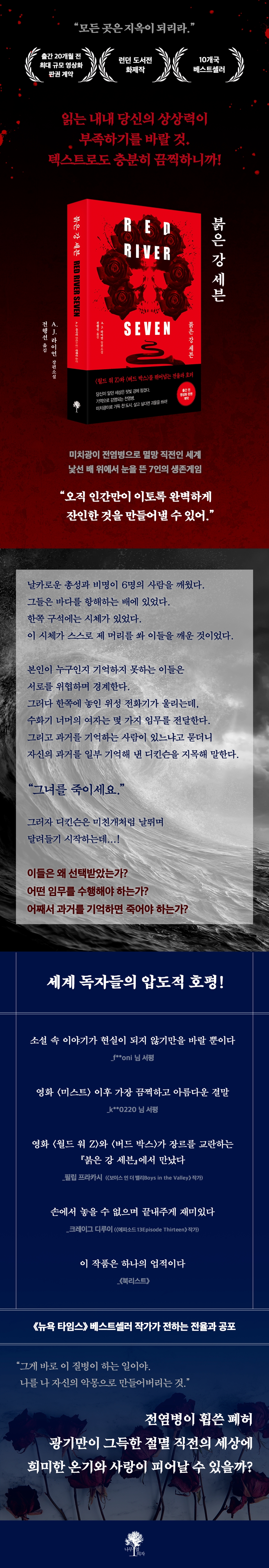 영화 [월드 워 Z]와 [버드 박스]가 장르를 교란하는 『붉은 강 세븐』에서 만났다. 밀실 미스터리, 숨 가쁜 스릴러, 공포의 호러 쇼가 미친 듯이 결합해 마지막 장이 끝난 후에도 오래도록 독자를 옴짝달싹 못 하게 할 것이다. - 필립 프라카시 (『보이스 인 더 밸리Boys in the Valley』 작가)