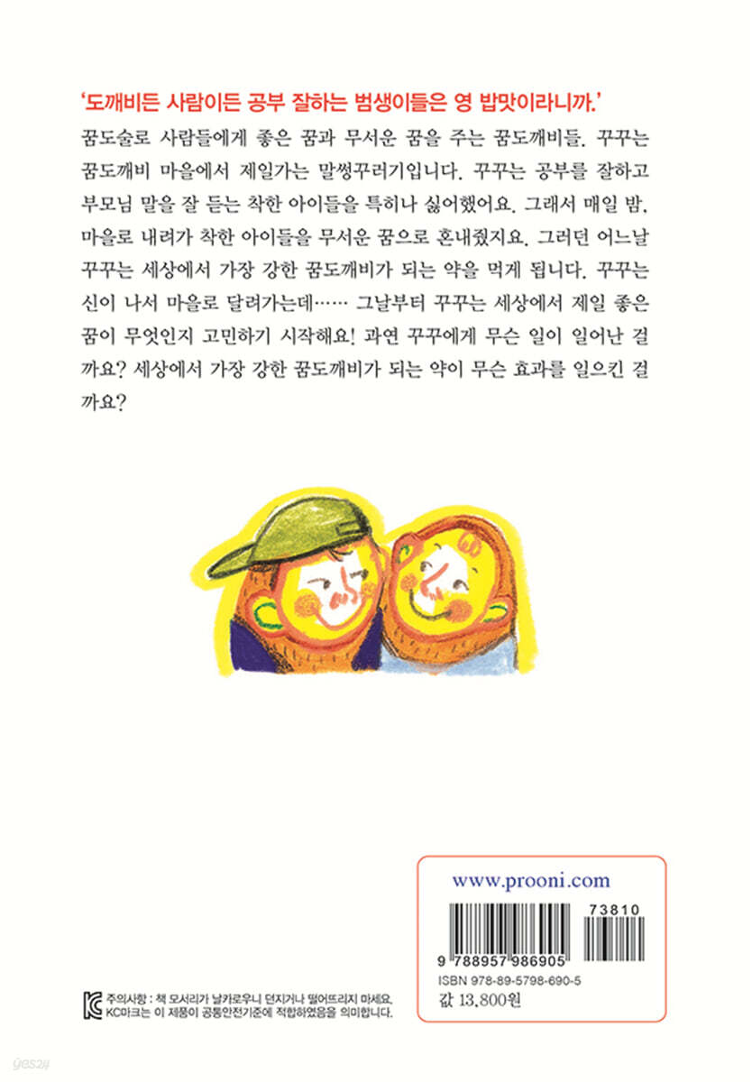 - ‘좋은 꿈’은 용기와 관용을 가져다준다! 『좋은 꿈을 줄게』는 꿈도깨비 마을의 최고 말썽꾸러기 꾸꾸가 세상에서 가장 강한 꿈도깨비가 되기 위해 벌이는 소동을 그린다. ‘도깨비든 사람이든 공부 잘하는 범생이들은 영 밥맛이라니까.’라는 생각을 지닌 꾸꾸는 마을에 사는 모범생 지훈이에게 밤마다 악몽을 꾸게 만들어 괴롭힌다. 하지만 세상에서 가장 강한 꿈도깨비가 되는 약을 먹게 되고, 아름이를 만나면서 꾸꾸의 상황은 완전히 뒤바뀐다. 꾸꾸가 꿈도술을 아예 못 쓸 수 있는 상황에 처하게 된 것! 독자들은 심술궂은 꾸꾸와 자신이 아닌 다른 사람이 되고 싶어 하는 아름이의 모습에서, 때때로 자신에게 실망했던 순간들을 떠올릴 것이다. 키가 작거나 얼굴이 못났다고 혼자 속상해하고, 성적이 나쁘거나 성격이 삐뚤다고 꾸중 듣던 순간들을 말이다. 그러나 꾸꾸가 아름이를 만나 세상에서 제일 강한 꿈도깨비가 되어 가는 과정을 따라가며, 진심으로 누군가를 도울 수 있는 용기를 얻고, 자신과 타인의 부족한 점을 인정할 줄 아는 관용에 대해 배우게 된다. 사람에게 꿈을 선물하는 꿈도깨비라는 설정을 통해, 작가는 어린이들이 종종 마주하는 고민과 실망의 순간을 때로는 유쾌하게, 때로는 진중하게 그리며 용기와 관용의 미덕을 알려준다. 꿈도깨비가 선물하는 ‘좋은 꿈’은 자기 자신을 존중하고 사랑하는 법을 일깨우며, 진정한 강함이란 온전한 이해와 인정을 기반으로 한 사랑에서 비롯된다는 메시지를 전한다. |