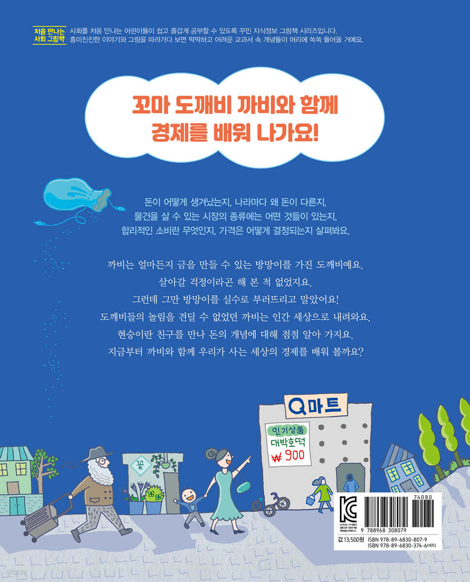 〈처음 만나는 사회 그림책〉 시리즈 다섯 번째 편인 《경제야 쉬워져라, 뚝딱!》은 초등 중학년이 알아야 할 기본적인 경제 개념을 다룹니다. 얼마든지 금을 만들어 낼 수 있는 도깨비 방망이를 부러뜨려 버린 꼬마 도깨비 까비가 인간 세계로 내려와 화폐의 개념과 경제 원리를 배워 나가는 과정을 쉽고 재미있게 그렸습니다.