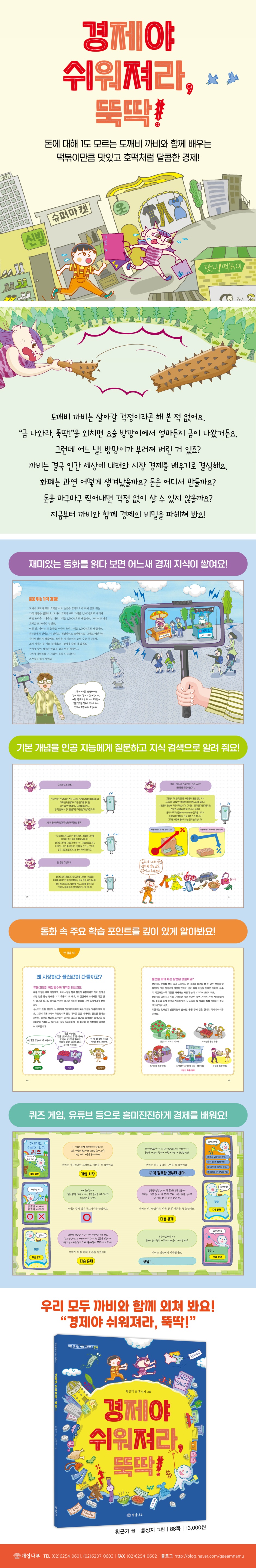 경제는 모든 사람과 관련 있어요. 용돈을 받는 일, 떡볶이를 사 먹는 일, 저축을 하는 일 등이 모두 경제 활동이에요. 우리는 죽을 때까지 매일 이런 경제 활동을 하며 살아간답니다. (중략) 문제는 경제가 좀 딱딱하다는 거예요. 어려운 말도 많고요. 이 때문에 경제를 멀리하는 어린이가 꽤 많죠. 이 책은 그런 어린이를 위해 쓴 책이에요. 재미있는 동화로 이야기를 풀어 나가면서 경제 이야기를 전달하면, 좀 더 쉽게 경제를 이해시킬 수 있겠다고 생각했지요. - ‘작가의 말’ 중에서 전 세계 인구의 0.2%에 불과하지만 노벨상 수상자의 30%를 차지하는 유대인들은 자녀들이 태어나자마자 경제 교육을 철저히 시키는 것으로 유명합니다. 심부름을 하거나 집안일을 도우며 돈의 개념을 깨닫고, 어릴 적부터 간단한 장사를 하게 하면서 시장의 원리를 깨우칩니다. 유대인들의 교육 지침을 보면 경제 교육은 이르면 이를수록 좋으며 화폐의 개념을 알려 주는 활동은 반드시 필요하다는 걸 알 수 있습니다. 하지만 어른들조차 어렵게 느껴지는 경제를 아이들에게 설명하기란 간단치 않습니다. 《경제야 쉬워져라, 뚝딱!》은 갑자기 돈을 벌어야 하는 상황에 맞닥뜨린 꼬마 도깨비를 주인공으로 내세워 돈이란 언제부터 생겨났는지, 나라마다 왜 돈이 다른지, 물건을 살 수 있는 시장의 종류에는 어떤 것들이 있는지, 합리적인 소비란 무엇인지, 가격은 어떻게 결정되는지를 쉽게 알려줍니다. 이 책을 읽는 어린이들은 시장 경제에 관해 전혀 배경지식이 없는 꼬마 도깨비 까비나, 돈에 대해 그저 어렴풋이 알고 있는 또래 친구인 현승이의 처지에 감정 이입하며 기본적인 경제 원리를 자연스레 배워나가게 됩니다. 이 책의 가장 큰 장점은 실제로 어린이들이 가장 자주 접하는 방식으로 학습 개념을 전달한다는 것입니다. “돈은 어떻게 생겨났어?” 하고 스마트폰 속 인공지능에게 질문하고, 시장의 종류에 대해 지식 검색을 통해 알아보며, 현명한 소비자가 되기 위해 애플리케이션을 다운받아 게임으로 퀴즈 문제를 풀고, 유튜버가 등장하여 가격 경쟁의 개념을 알아봅니다. 부모님, 선생님이 가르쳐 주거나 학교에서 학습하는 지식이 아닌 어린이들이 능동적으로 찾아보는 상황을 통해 어려운 경제 개념을 일방적으로 주입하지 않고 흥미롭게 풀어냈습니다. 주인공 까비와 현승이는 아이들이 경제 활동을 하면서 저지를 수 있는 실수들을 위트 있게 표현합니다. 광고에 혹해 사이즈도 맞지 않는 아기용 팬티를 열 장이나 사 버렸다가 현명한 소비를 하는 법을 배우게 되고, 떡볶이를 먹기 위해 메밀묵을 포기하면서 기회비용의 개념을 깨닫기도 하며, 욕심껏 호떡 가격을 높게 책정했다가 장사에 실패하기도 합니다. 이런 재미있는 에피소드를 따라가다 보면 돈이 무엇인지조차 몰랐던 아이들도 화폐의 탄생 과정을 비롯하여 환율의 개념, 시장의 종류, 합리적 소비를 하는 방법을 깨닫게 됩니다. 나중에는 호떡 장사를 통해 수요·공급 법칙, 시장 경제와 정부의 역할까지 알게 되지요. 동화 뒤에는 ‘한 걸음 더!’ 코너를 통해 동화에 나왔던 경제 개념을 한 단계 심화해 정리함으로써 주요 학습 포인트도 놓치지 않았습니다. 어린이들은 이 책을 읽으며 경제 기본 용어와 정의까지 자연스레 두루 익힐 수 있습니다. 독점 기업의 문제점에 대해서 다루며 더 장사를 잘 할 수 있는 방법을 아이들에게 되묻는 열린 결말로 끝나는 이 책은, 기업의 윤리적 책임에 대해서도 이야기합니다. 경제와 처음 만나는 아이들이 성인이 되어서도 올바른 경제관을 형성하는 데 첫걸음이 되어줄 책입니다. “경제야 쉬워져라, 뚝딱!”하고 마법을 걸듯이, 마냥 어렵게만 느껴지는 경제를 이 책을 통해 흥미진진한 방식으로 가르쳐 주시기 바랍니다. * 시리즈 소개 ◆처음 만나는 사회 그림책 사회를 처음 만나는 어린이들이 쉽고 즐겁게 공부할 수 있도록 꾸민 지식정보 그림책입니다. 흥미진진한 이야기와 그림을 따라가다 보면 딱딱하고 어려운 교과서 속 개념들이 머리에 쏙쏙 들어올 거예요. |